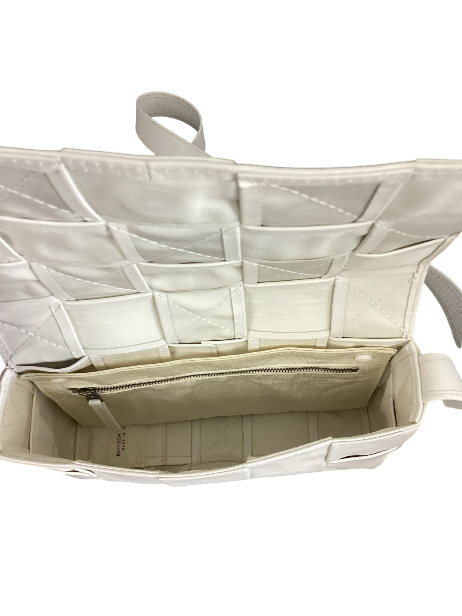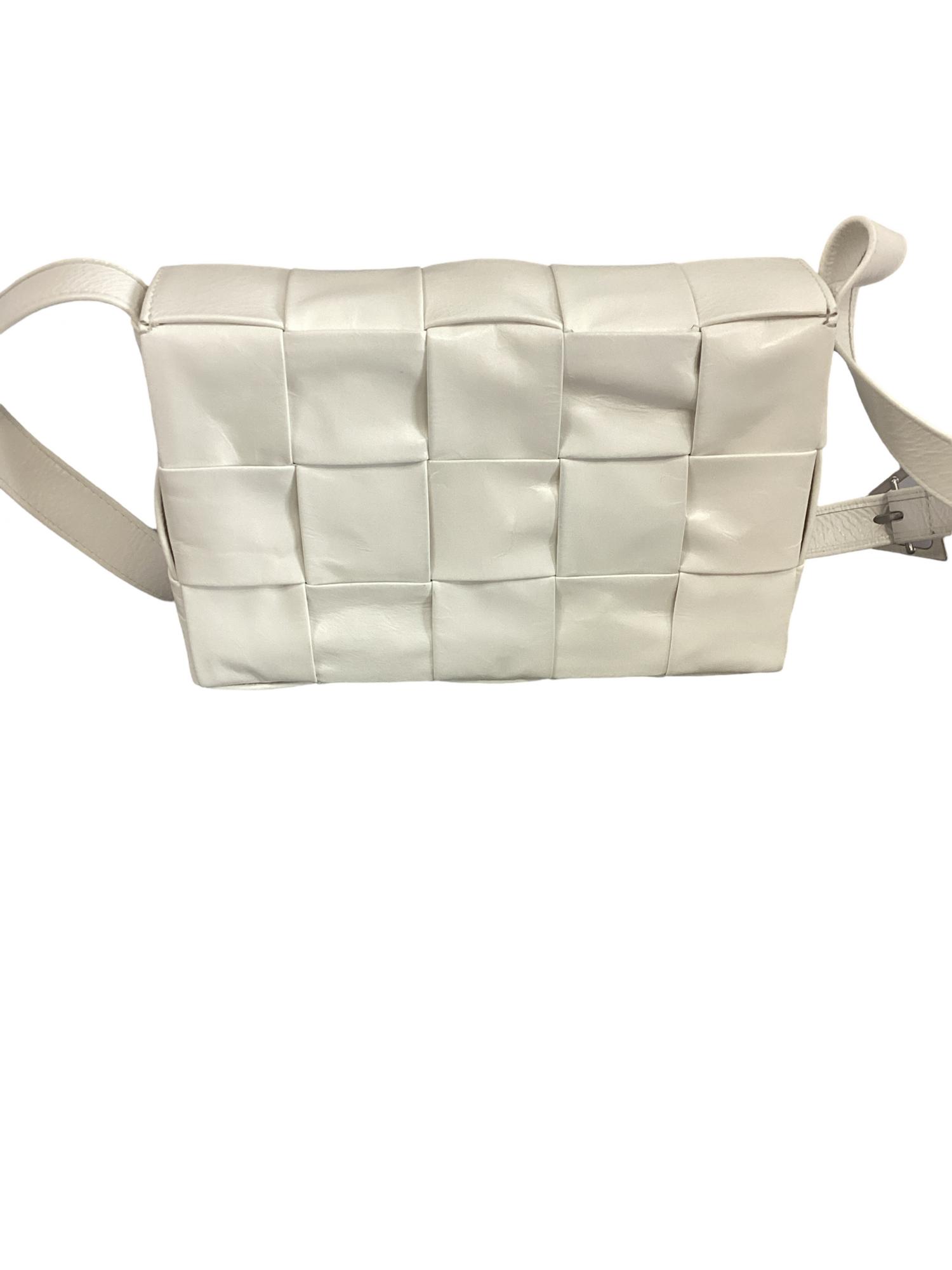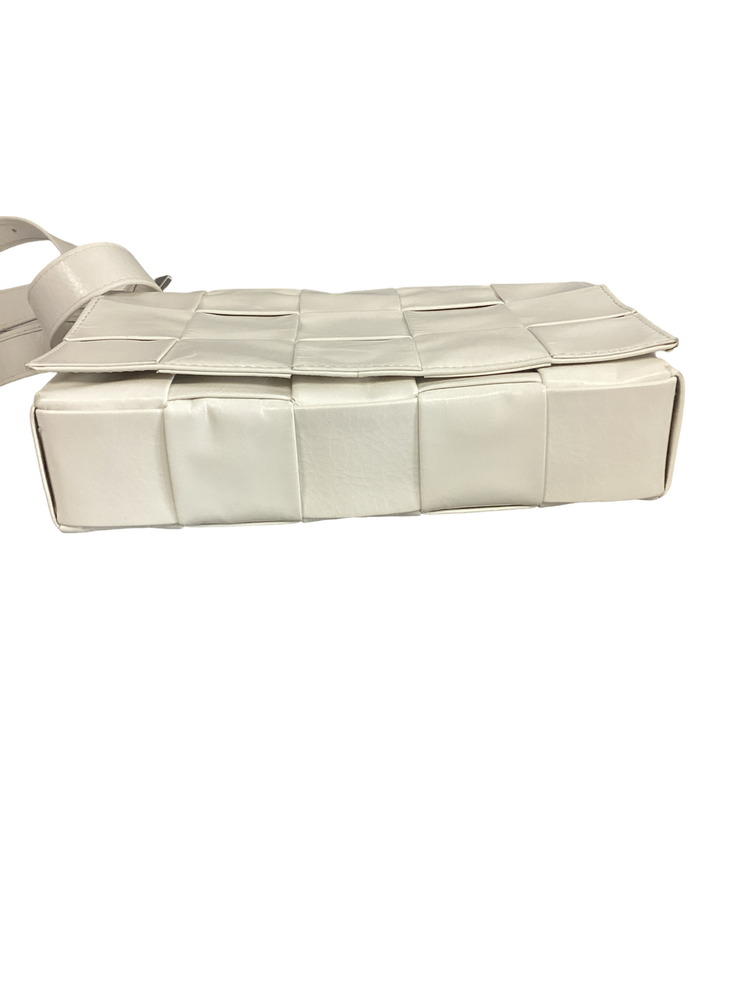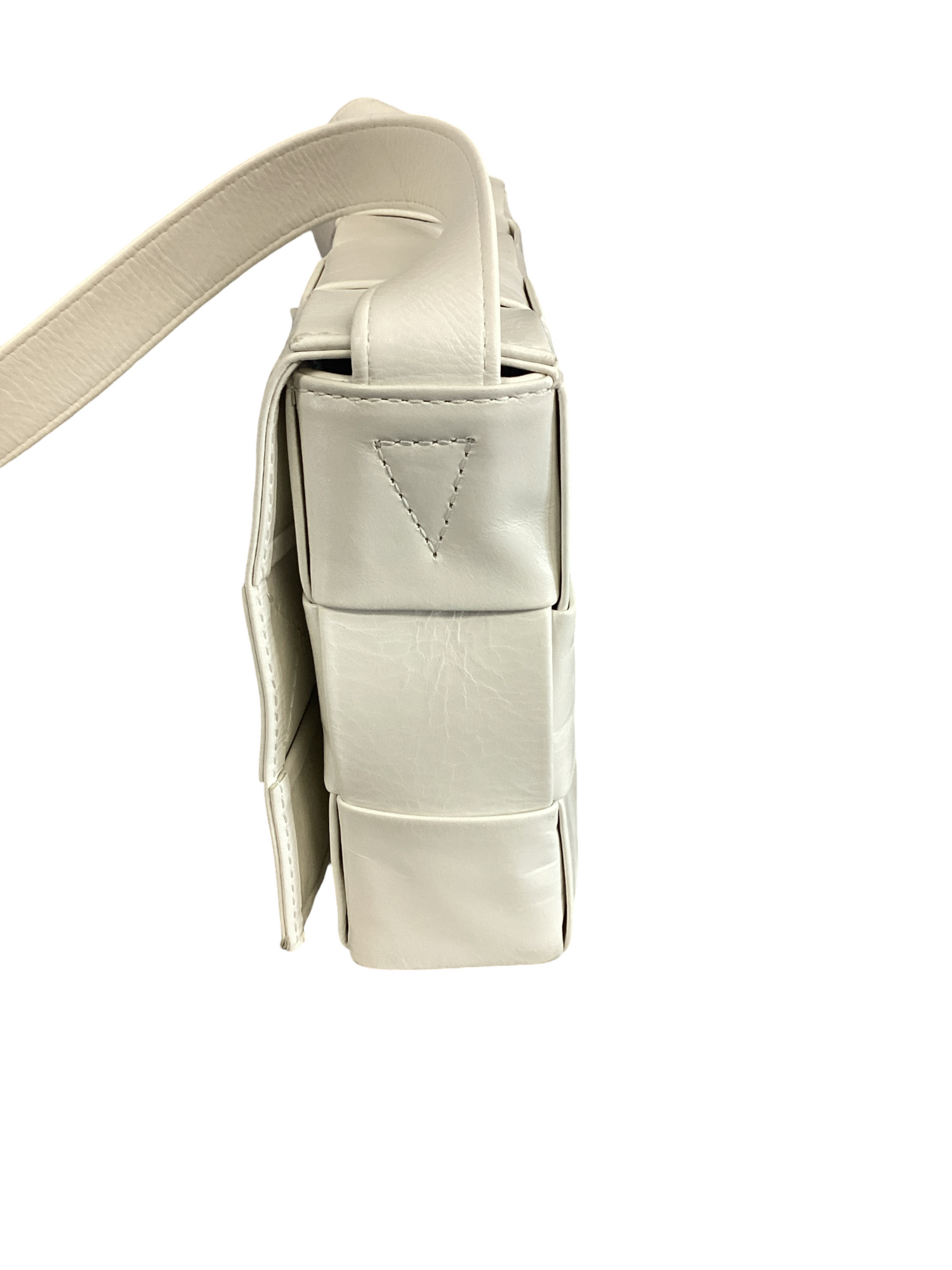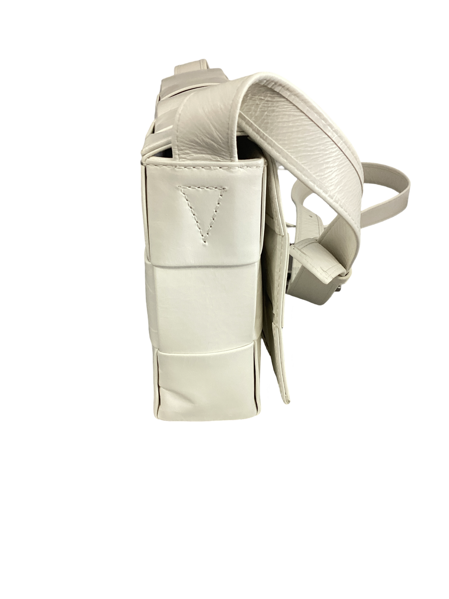 Bottega Veneta White Cassette Bag with silver-toned hardware, oversized signature woven leather, adjustable crossbody strap, magnetic snap flap closure. Interior features unlined leather and interior zipper pocket.