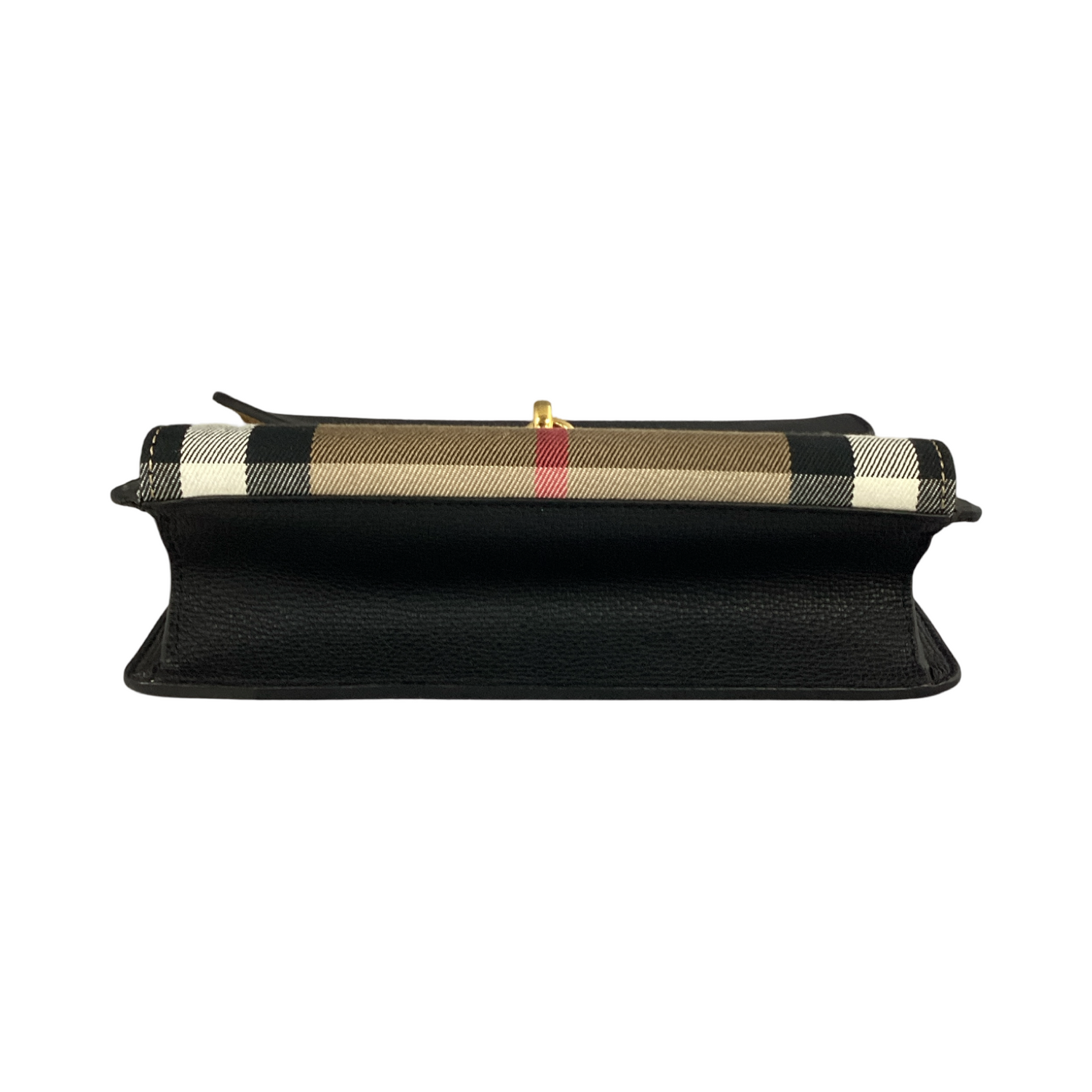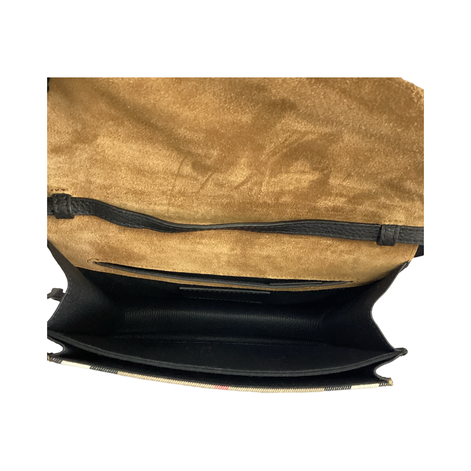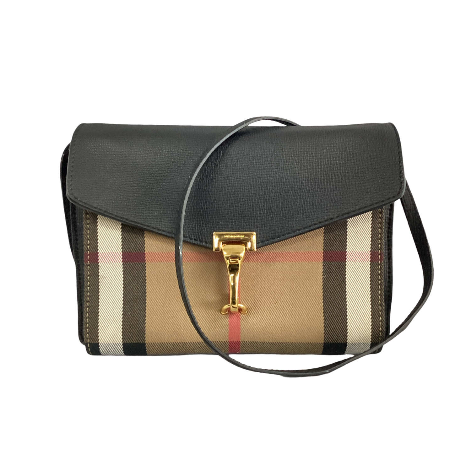 Burberry-Black and Canvas Macken Small Crossbody with gold-toned hardware, made of canvas and leather, detachable and adjustable leather strap, hook clasp closure. Interior features suede, fabric and leather interior, 2 compartments and a slip pocket.