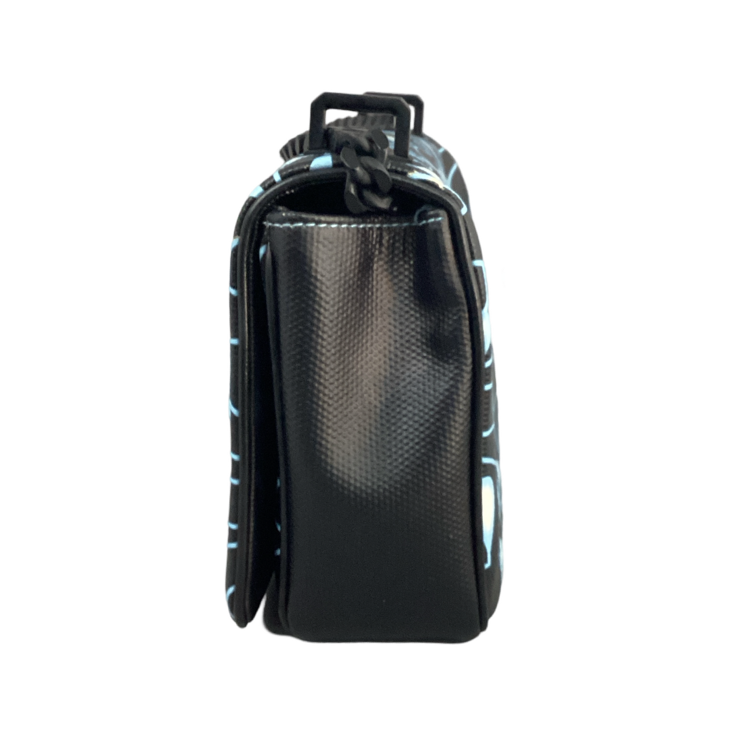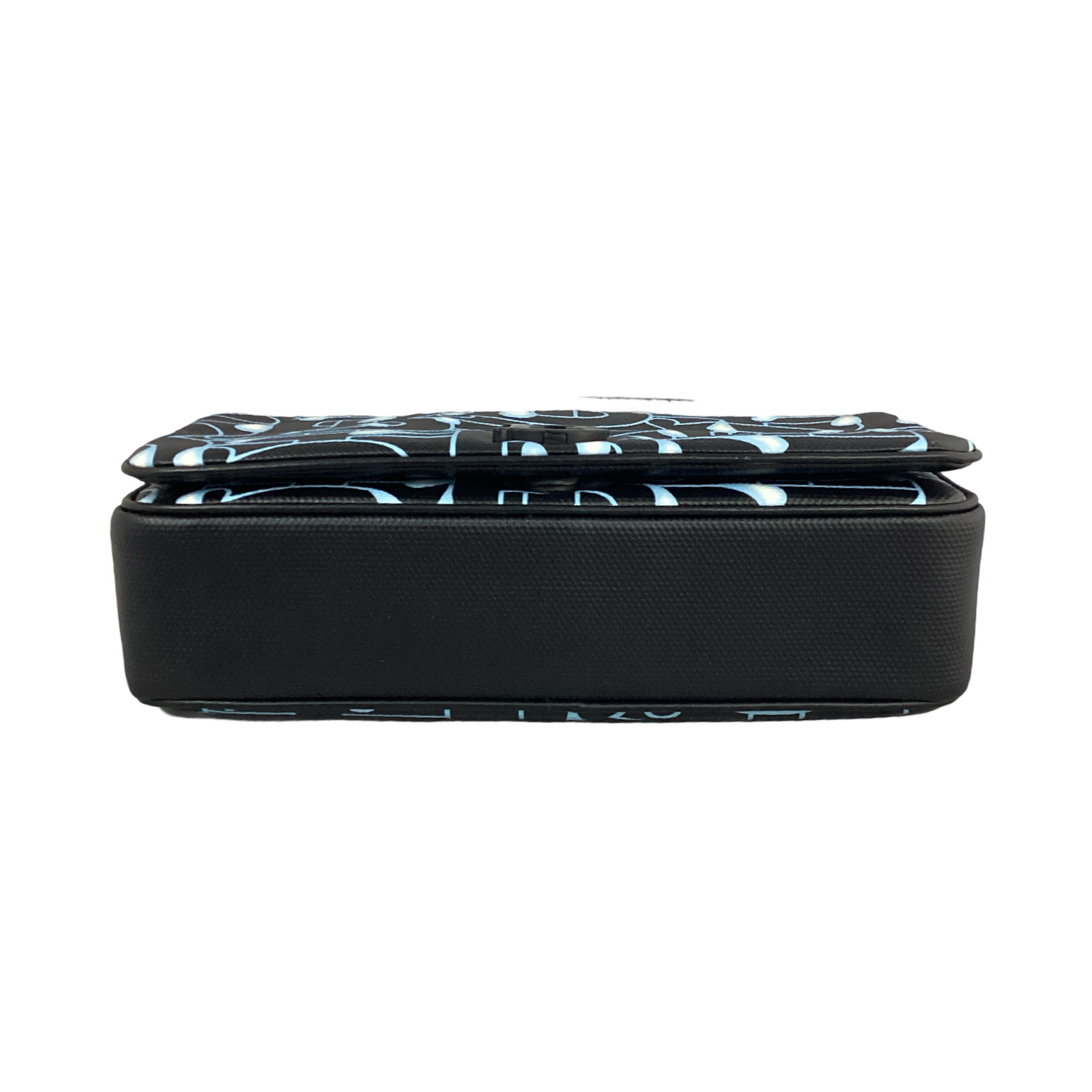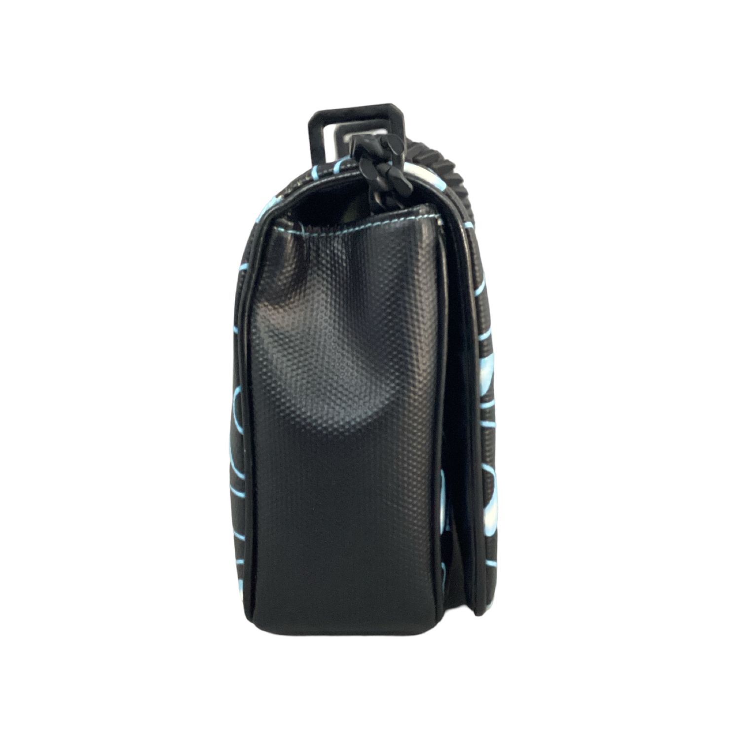Burberry-Rain Capsule Lola Monogram Shoulder Bag with black-toned hardware, crafted of wool coated canvas with a blue stylized Burberry TB monogram on a black background, chain-link shoulder strap, snap flap closure. Interior features a black canvas interior with patch pocket.