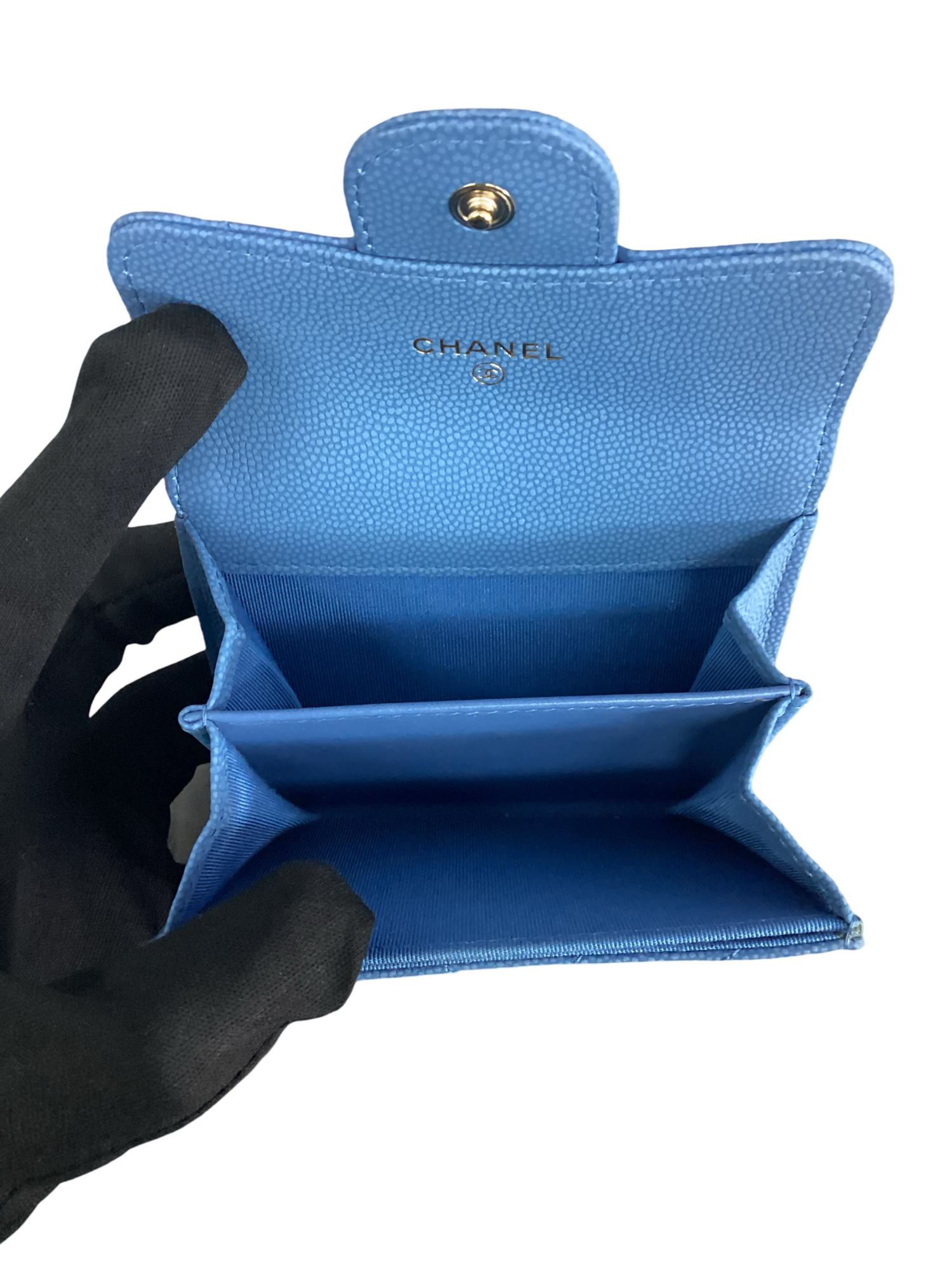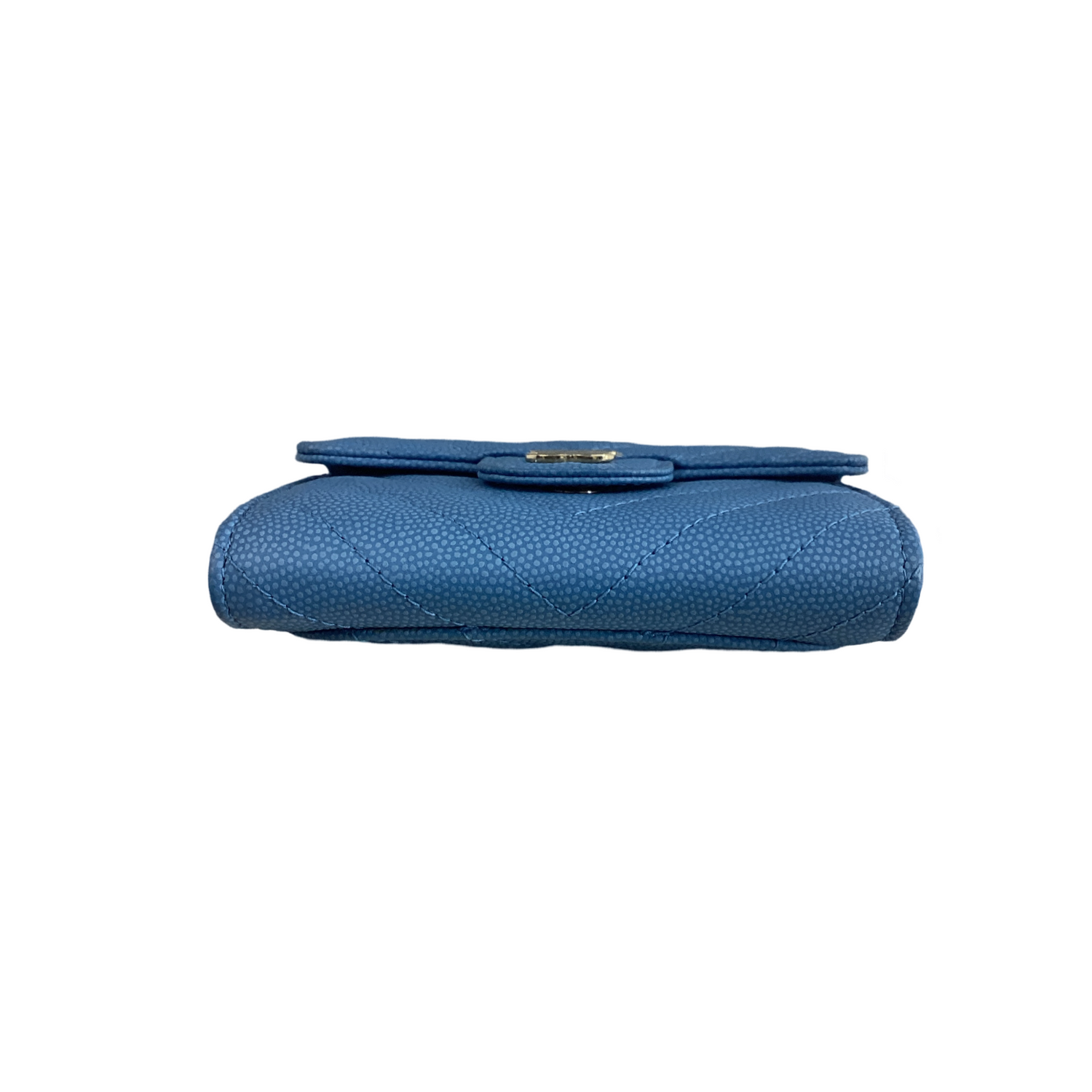 Chanel Chevron Quilted Card Holder with silver-toned hardware, crafted of chevron quilted caviar leather in blue, a back slip pocket, a front flap closure. Interior features a blue fabric interior with 2 compartments and a card pocket.