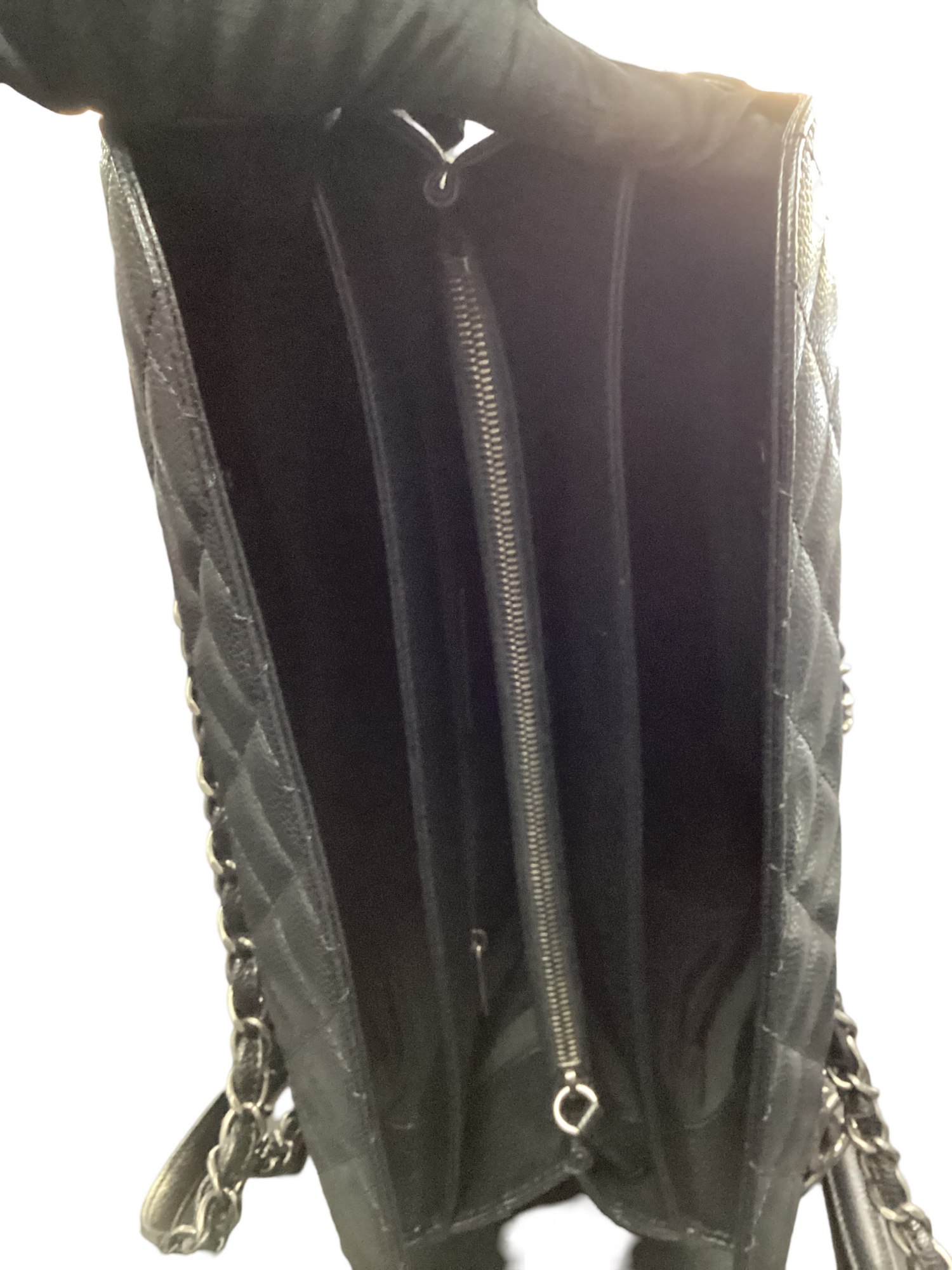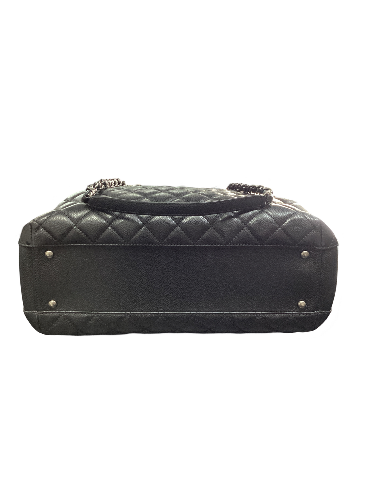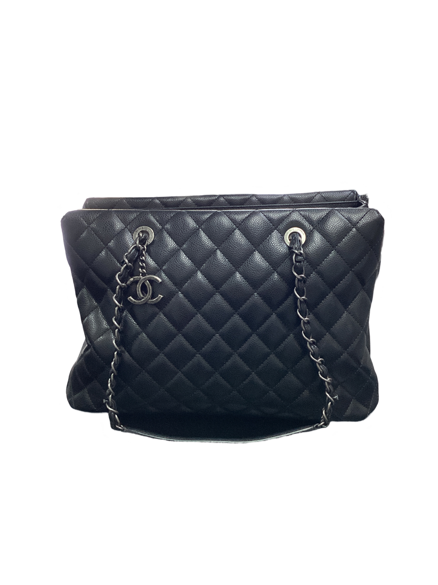 Chanel Black Caviar Quilted Shopping Tote with gunmetal-tone hardware, black caviar leather, double chain shoulder strap, exterior back slip pocket and double flap top closure. Interior features include black fabric lining. Four compartments and a zip compartment and a zip pocket.