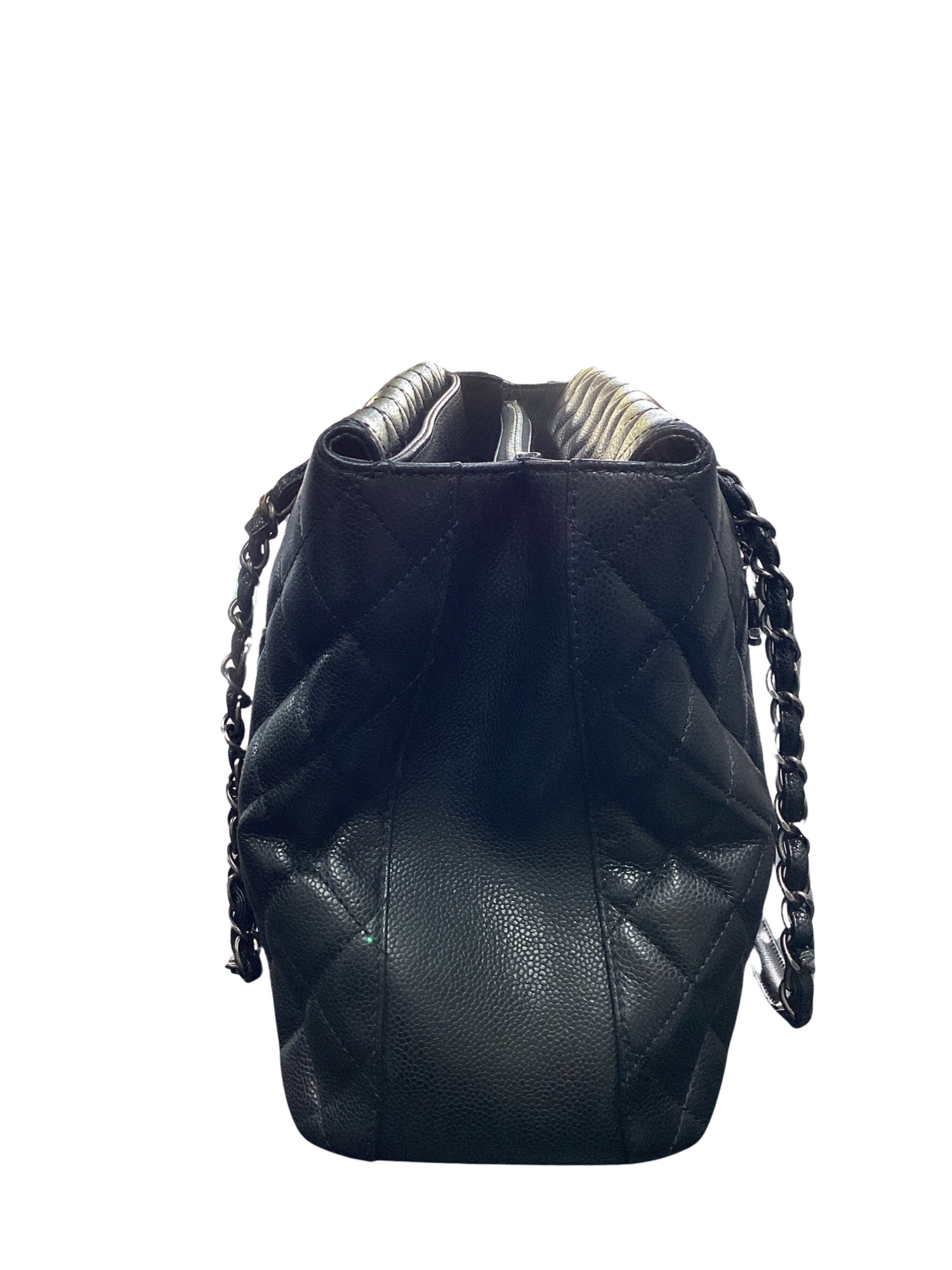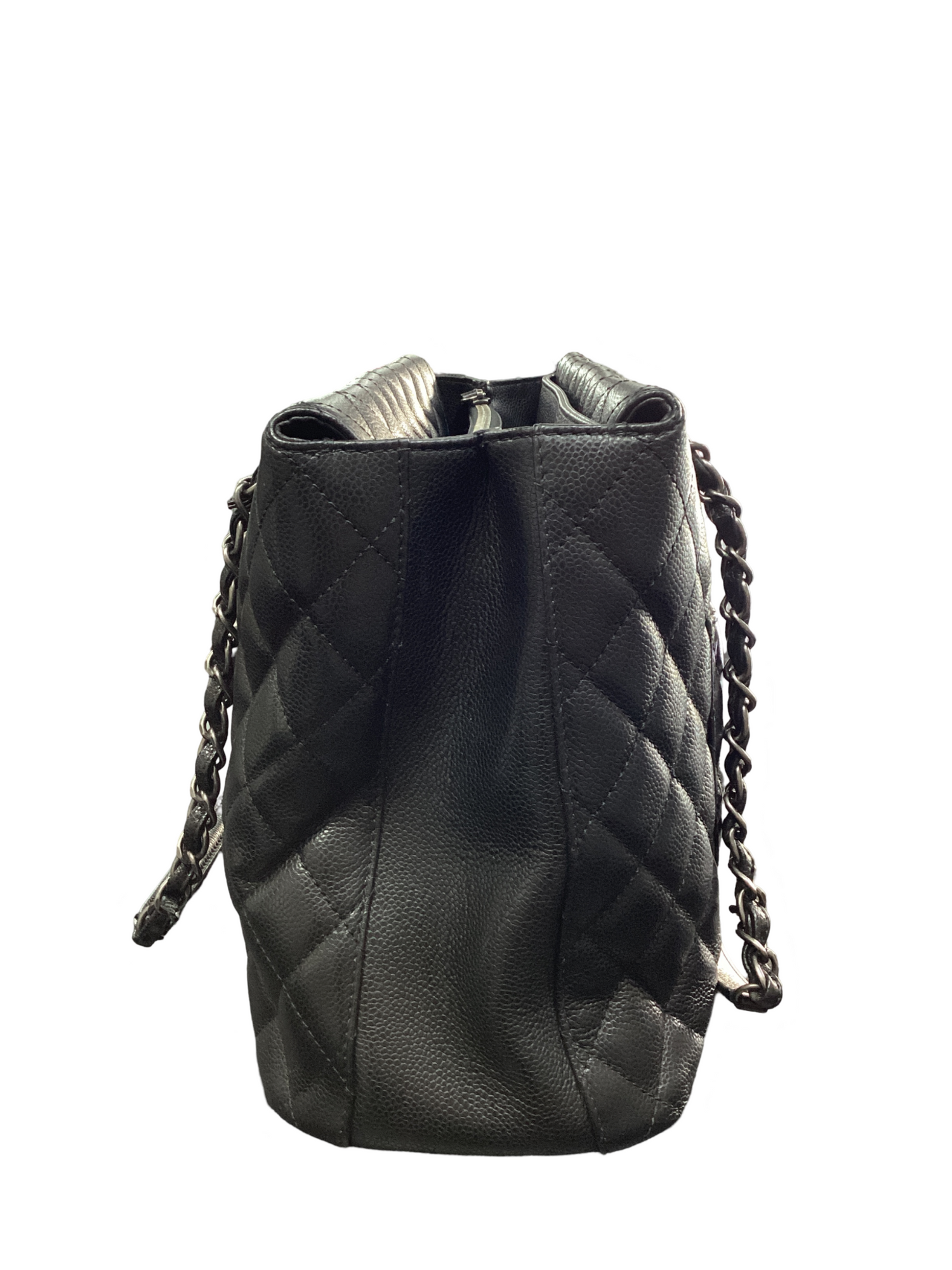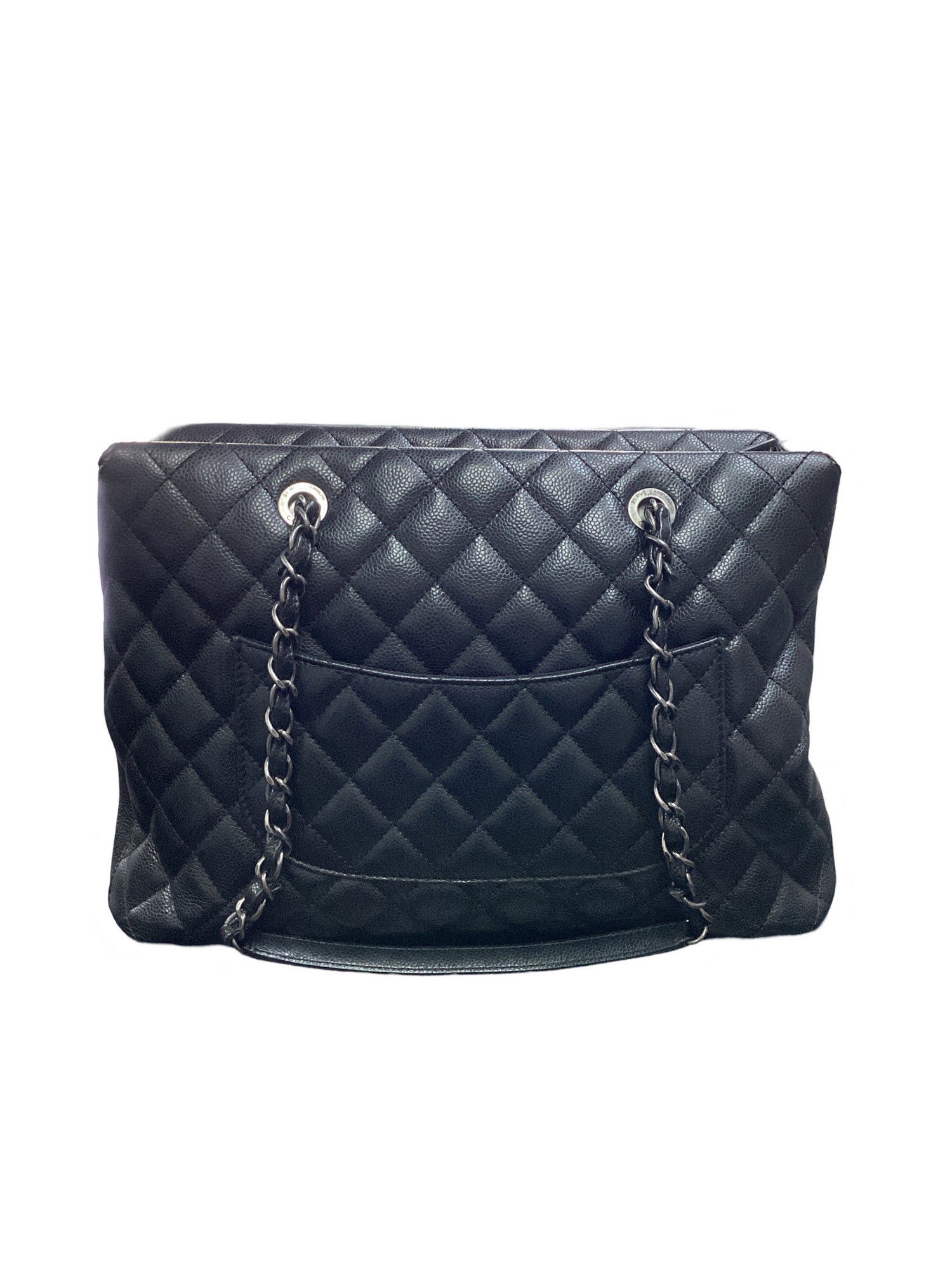 Chanel Black Caviar Quilted Shopping Tote with gunmetal-tone hardware, black caviar leather, double chain shoulder strap, exterior back slip pocket and double flap top closure. Interior features include black fabric lining. Four compartments and a zip compartment and a zip pocket.