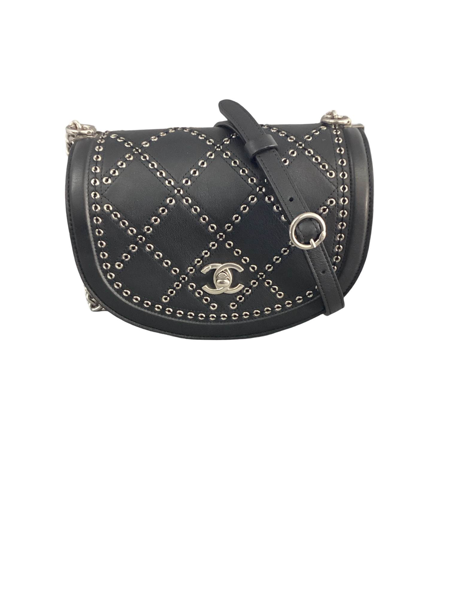 Chanel Coco Eyelets Flap Bag with silver-toned hardware, crafted of luxurious calfskin leather in black with a diamond pattern made from silver eyelets, a silver chain shoulder strap with a leather shoulder pad and a silver CC turn lock closure. Interior features opens to a black fabric interior a front flap interior pocket and a back zipper pocket.