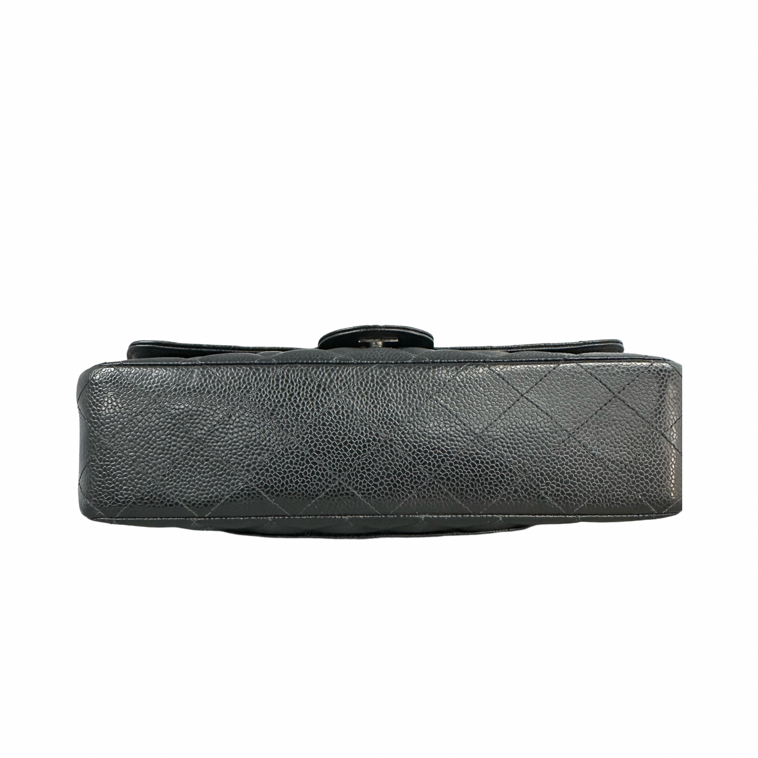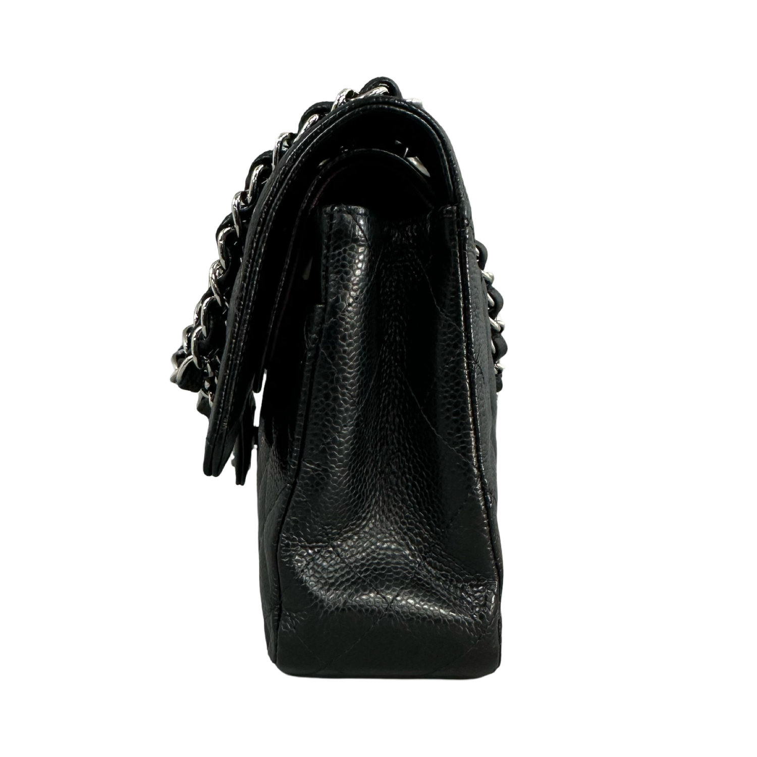Chanel Medium Caviar Double Flap Bag in Black with silver-toned hardware, crafted of luxurious caviar leather in black, polished silver-toned chain link leather threaded shoulder straps, a back slip pocket and Chanel CC interlocking turn lock for the front flap. Interior features an inner flap and an interior front slip pocket and a matching leather interior with patch pockets.