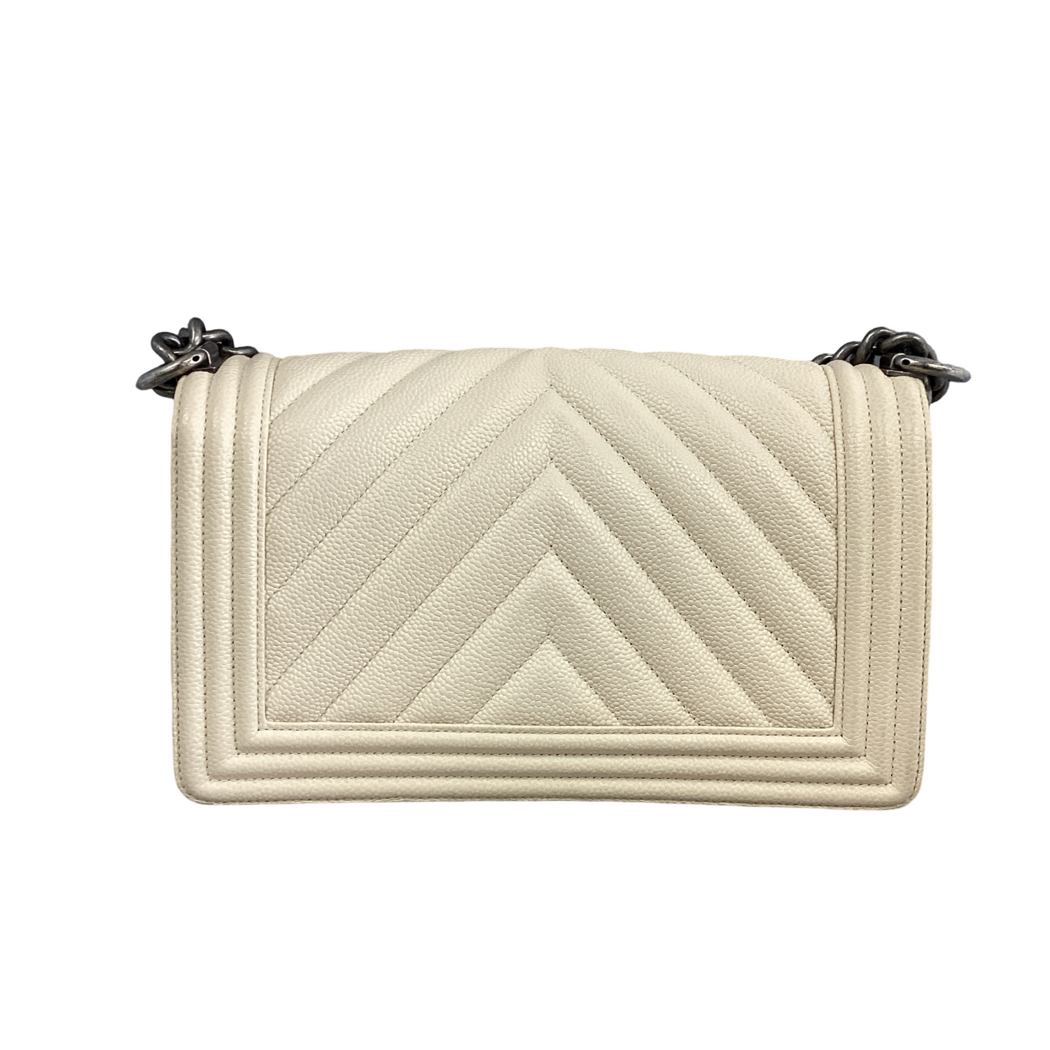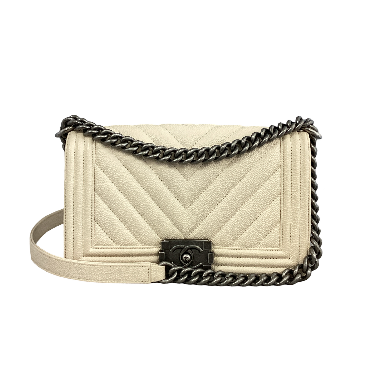 Chanel-Off White Caviar Boy Bag Medium with gunmetal hardware, aged gunmetal chain strap and a shoulder pad and a Chanel boy CC push lock on the flap. Interior features a cream fabric interior with a patch pocket.