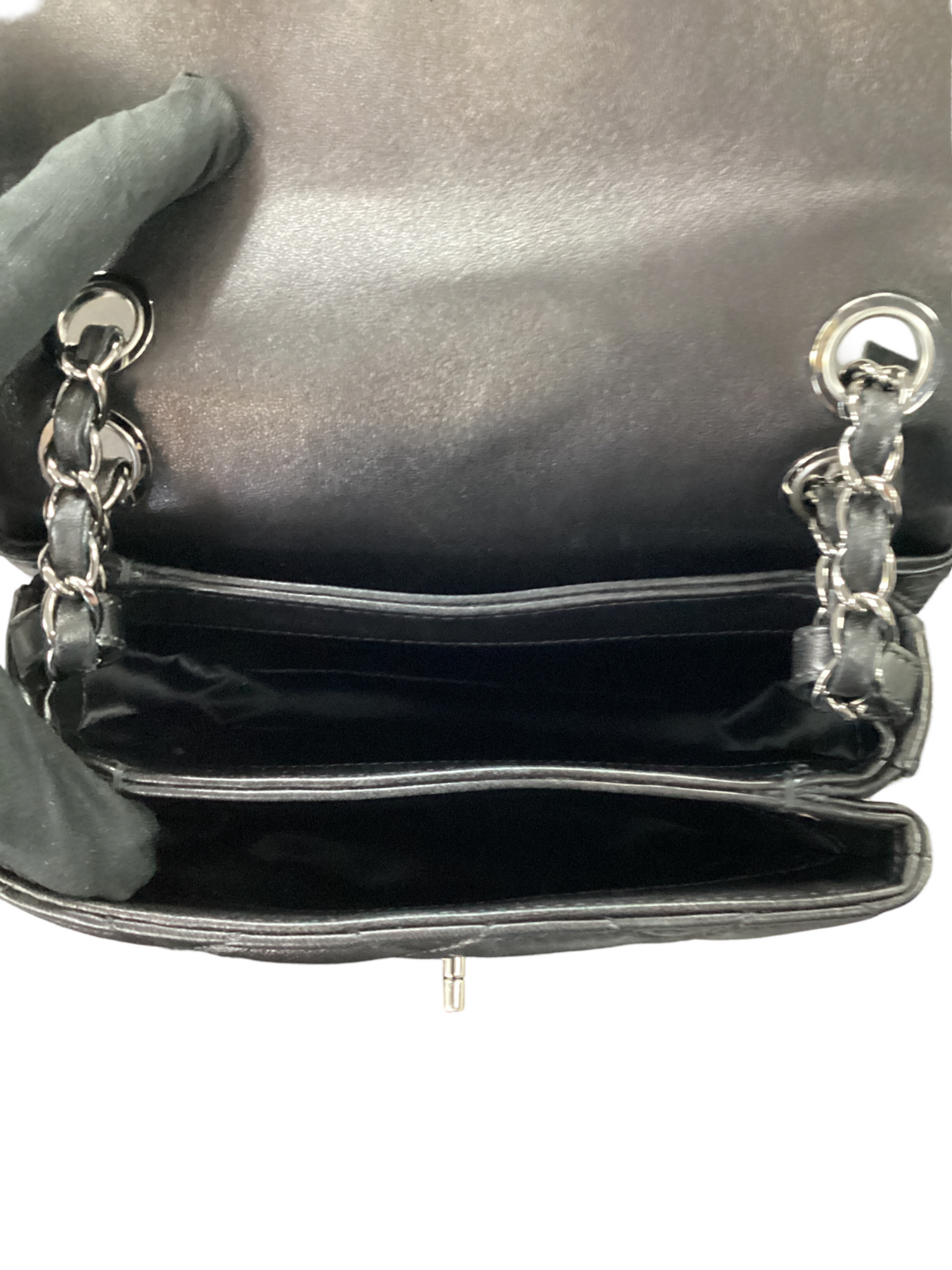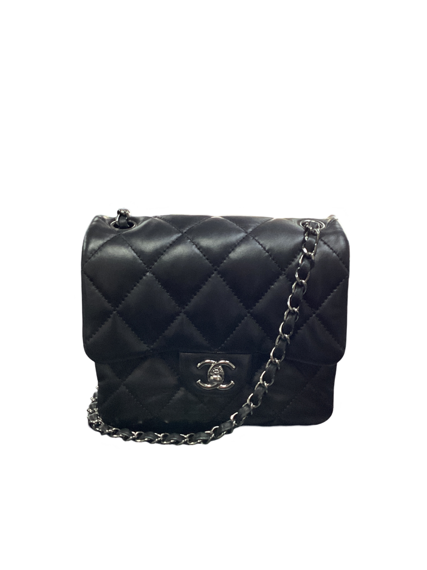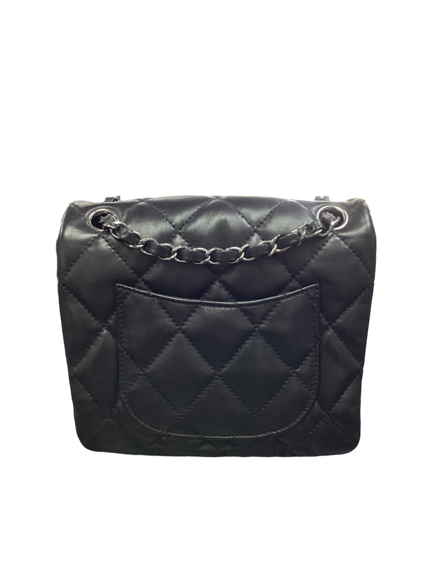 Chanel black leather Quilted Square Flap Bag with silver-tone hardware, back slip pocket, single chain shoulder strap, turn lock closure. Interior features include black satin lining, 2 compartments.