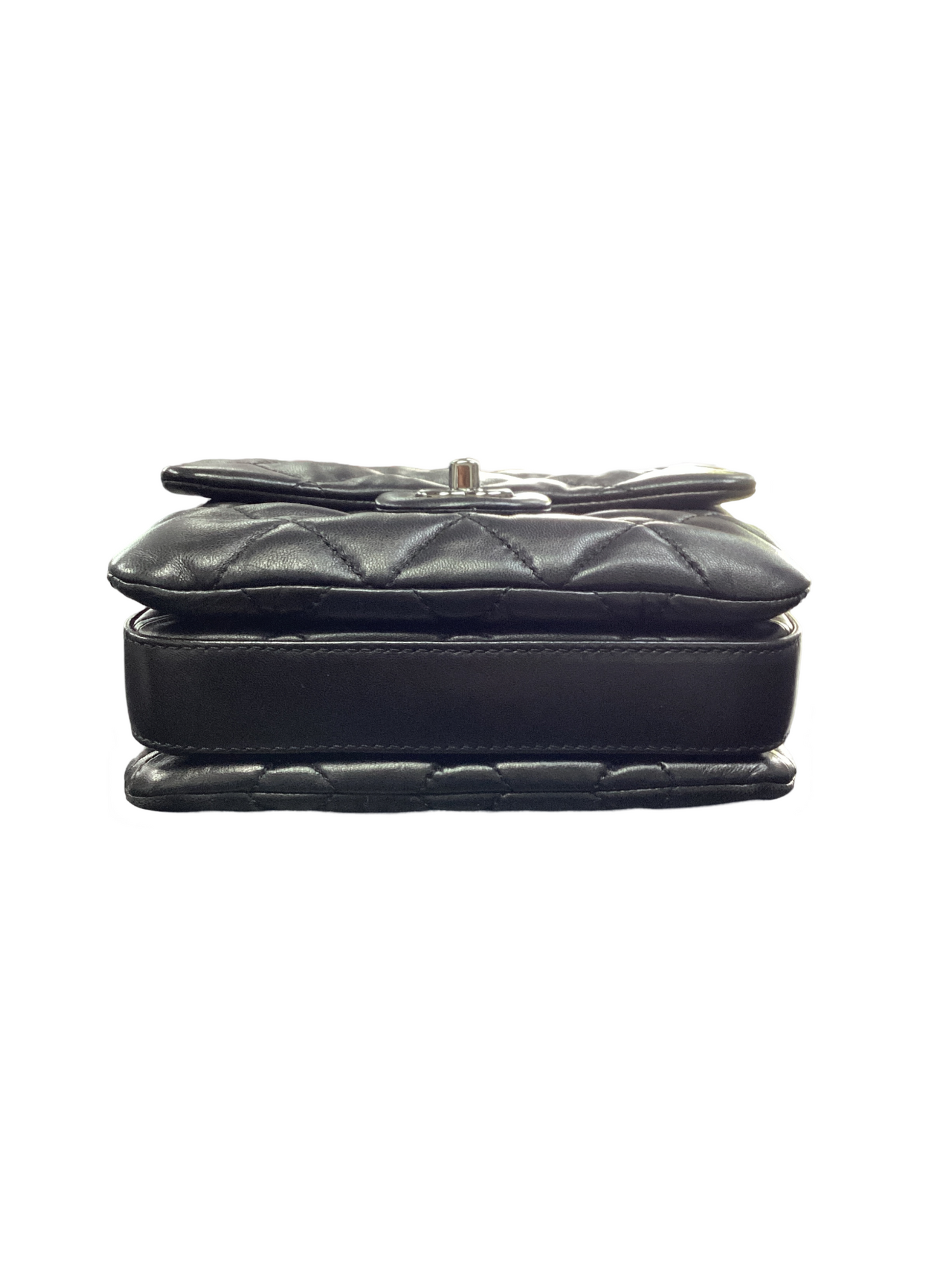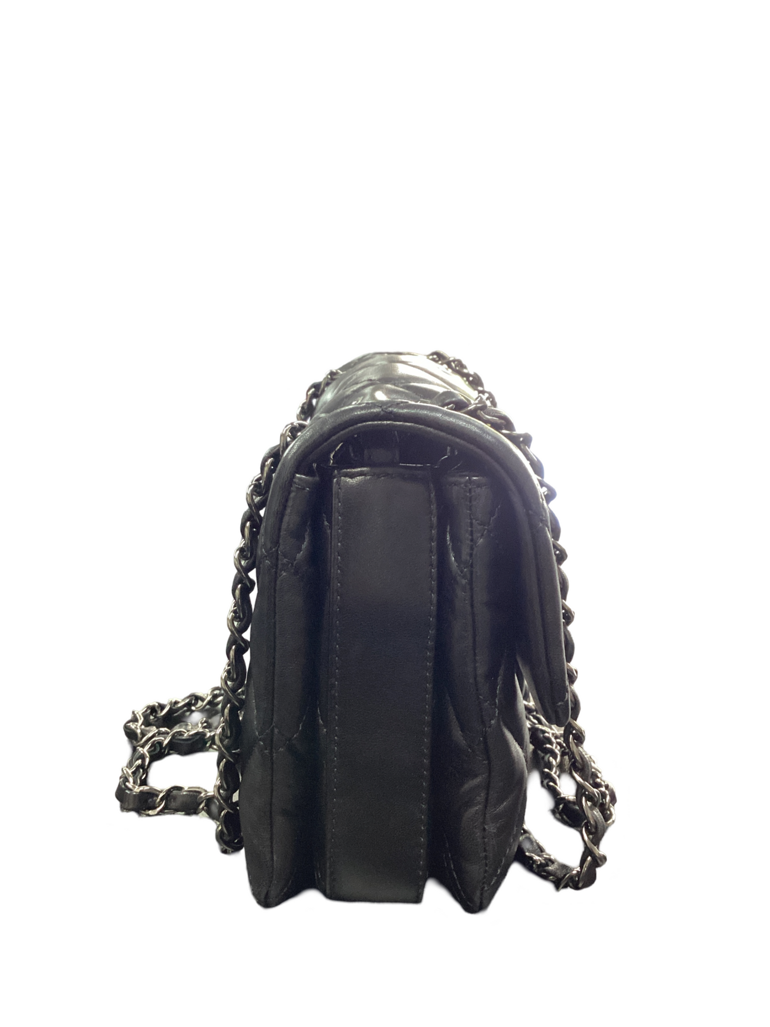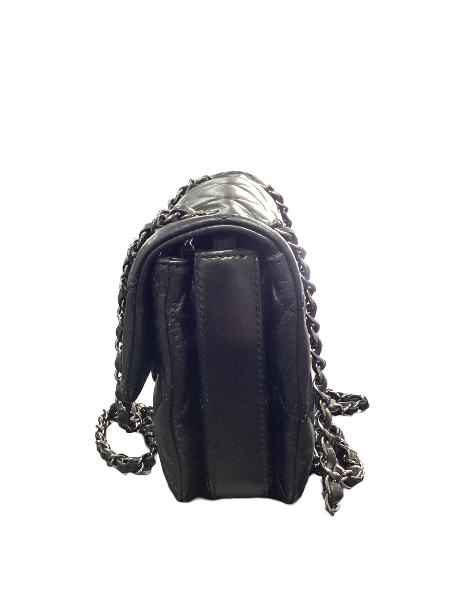 Chanel black leather Quilted Square Flap Bag with silver-tone hardware, back slip pocket, single chain shoulder strap, turn lock closure. Interior features include black satin lining, 2 compartments.