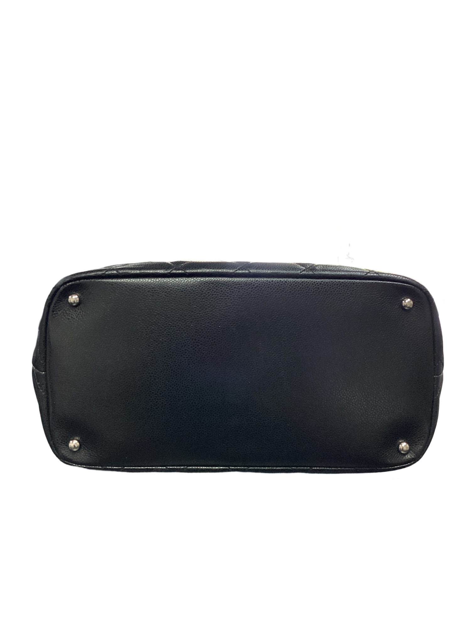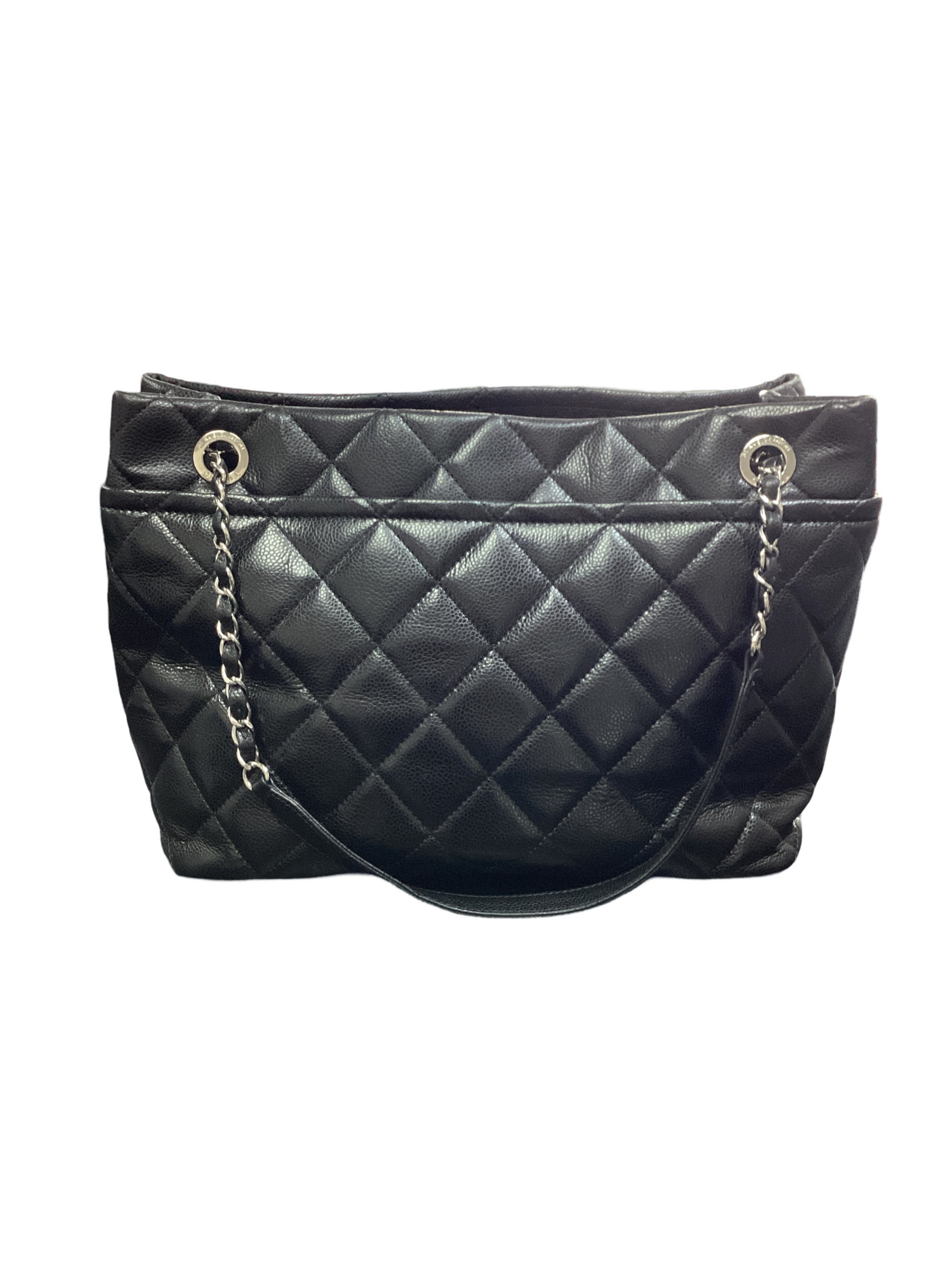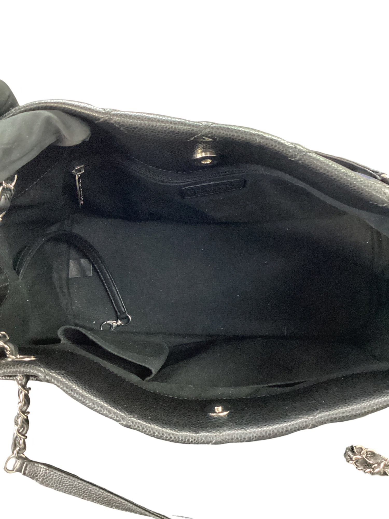Chanel Timeless Soft Shopper Tote with silver-tone hardware, a diamond quilted caviar leather in black, a leather threaded gold chain link shoulder straps, and a snap closure. Interior features black fabric lining and a zip pocket and two slip pockets.