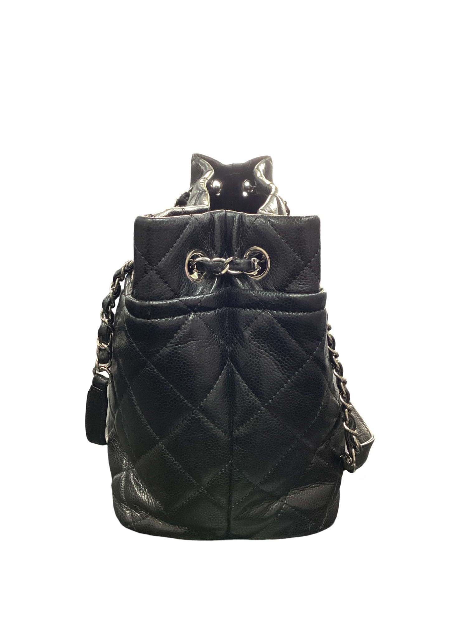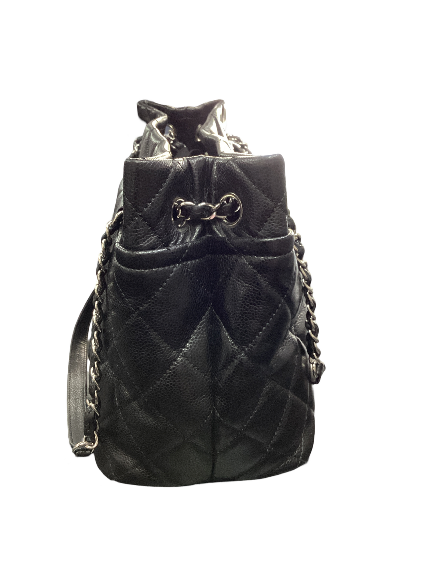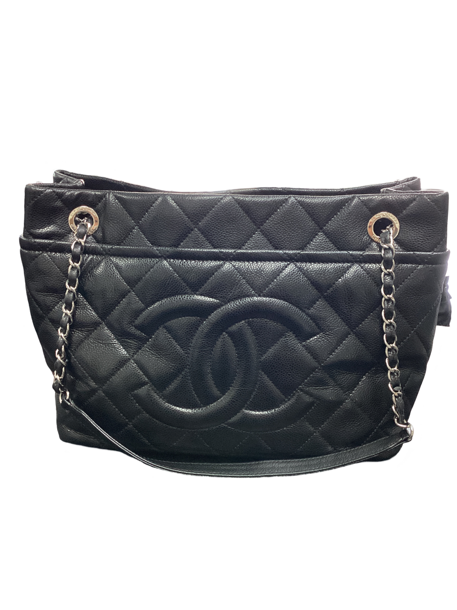 Chanel Timeless Soft Shopper Tote with silver-tone hardware, a diamond quilted caviar leather in black, a leather threaded gold chain link shoulder straps, and a snap closure. Interior features black fabric lining and a zip pocket and two slip pockets.