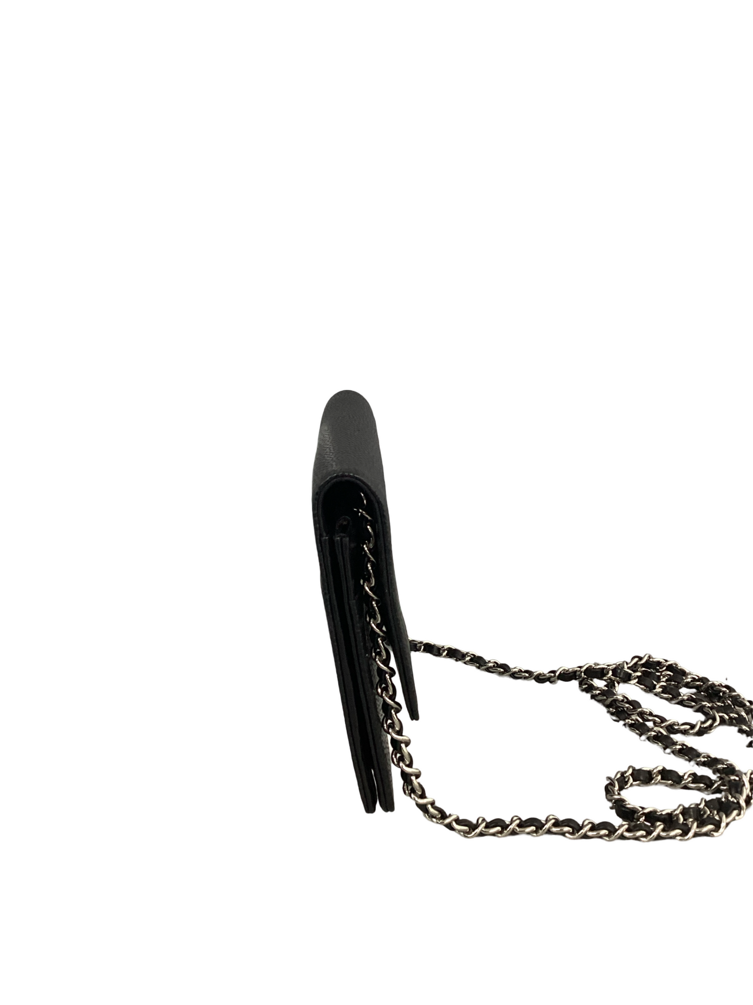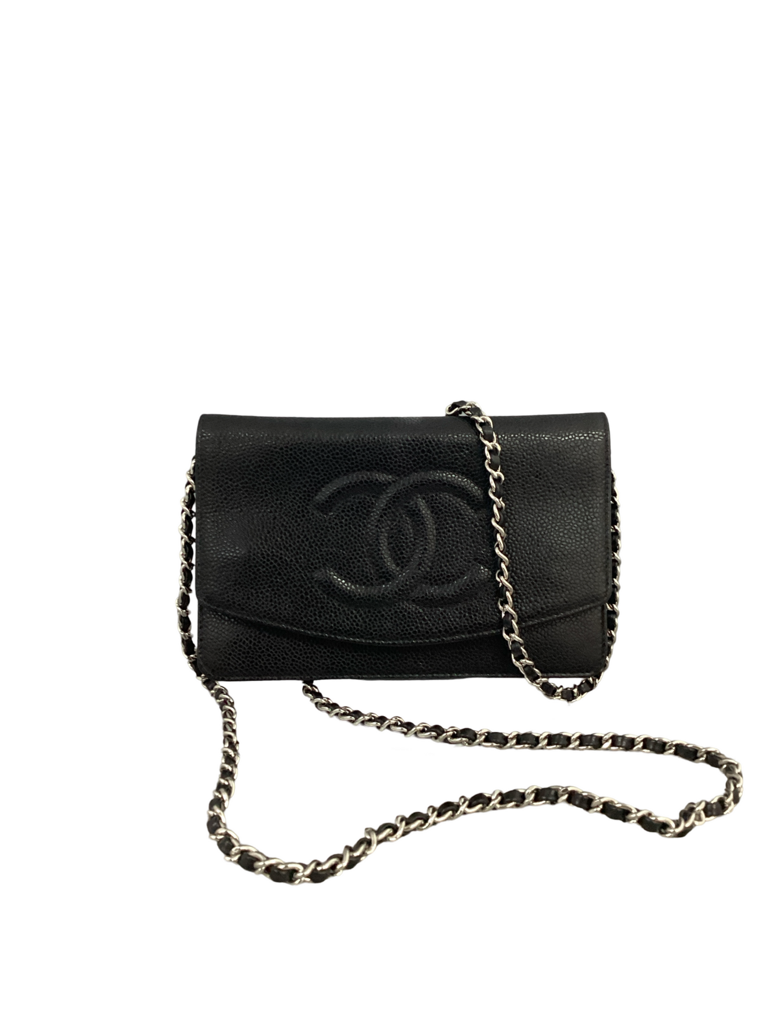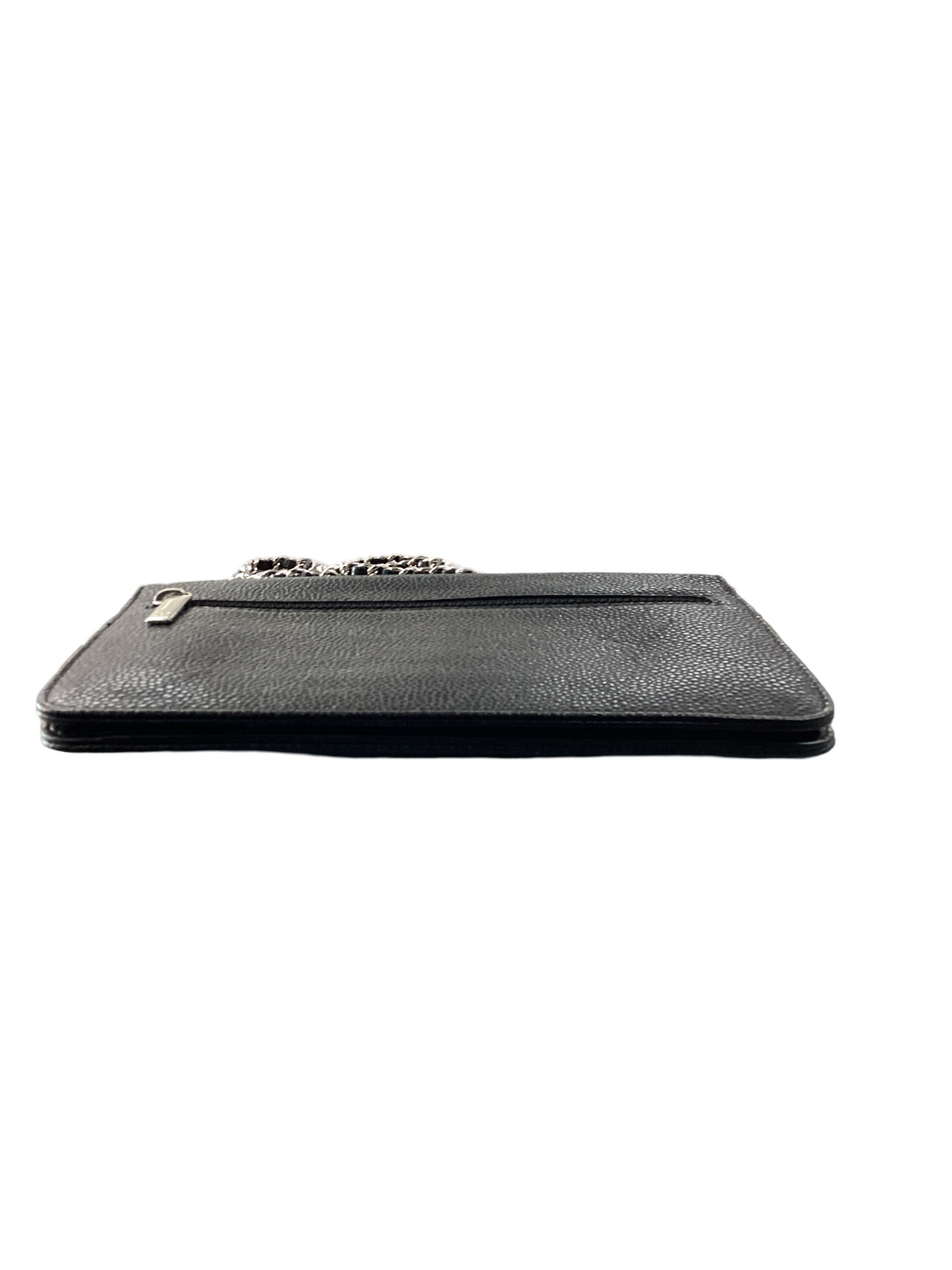 Chanel-Timeless Wallet On Chain with silver-tone hardware, black caviar leather, leather threaded silver chain-link shoulder strap and a crossover flap and snap button closure. Interior features black fabric and leather interior with 6 card slots, front patch pocket, and a zipper compartment as well as a zipper patch pocket.