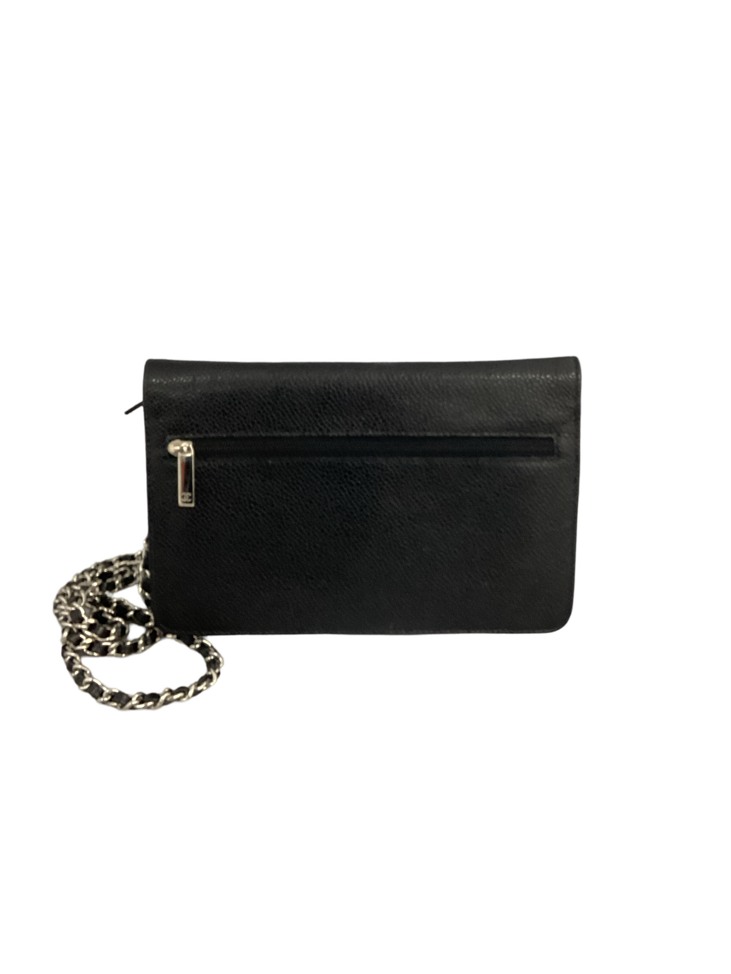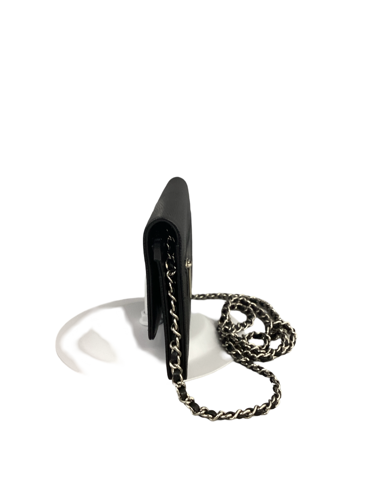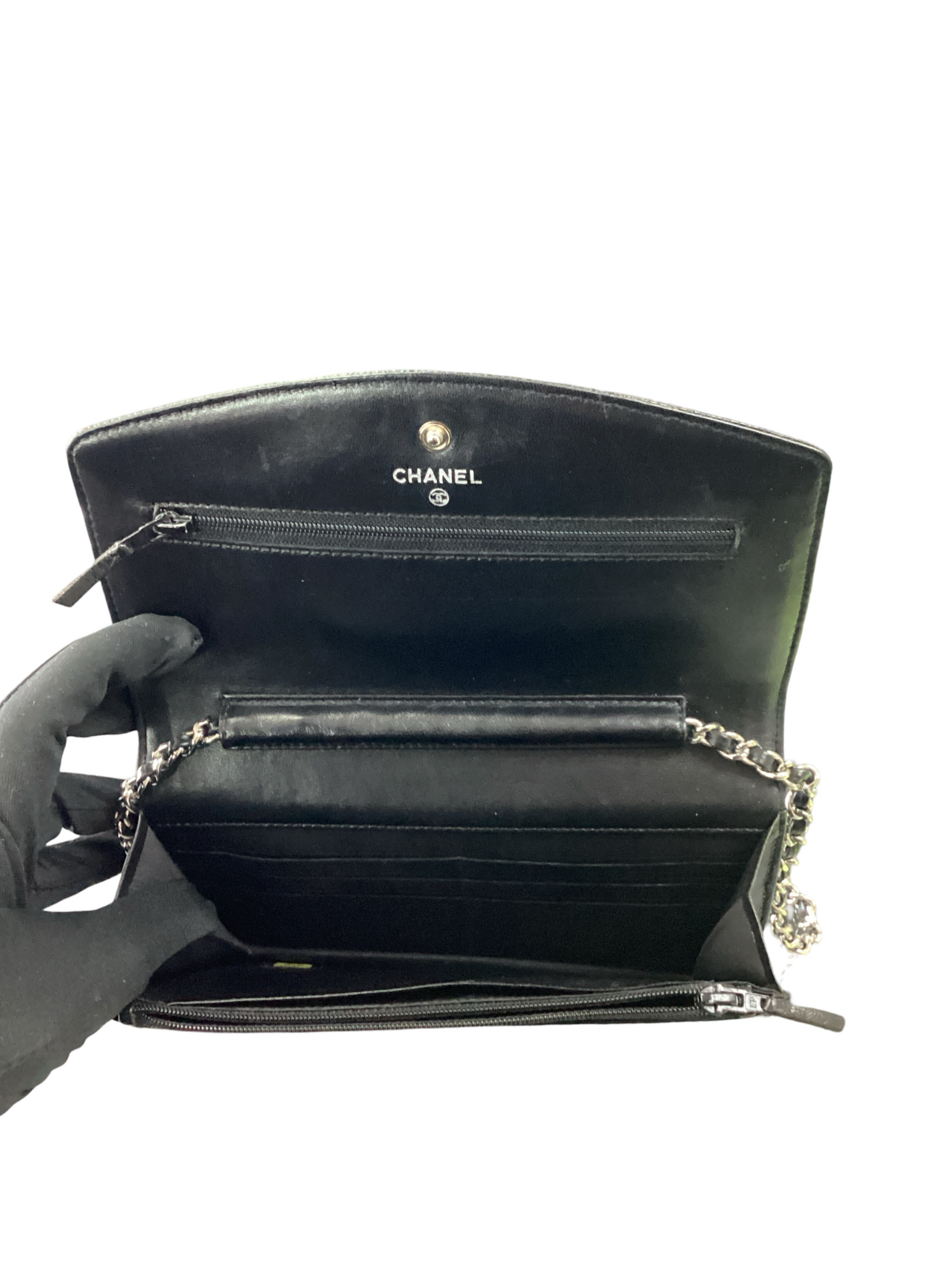 Chanel-Timeless Wallet On Chain with silver-tone hardware, black caviar leather, leather threaded silver chain-link shoulder strap and a crossover flap and snap button closure. Interior features black fabric and leather interior with 6 card slots, front patch pocket, and a zipper compartment as well as a zipper patch pocket.
