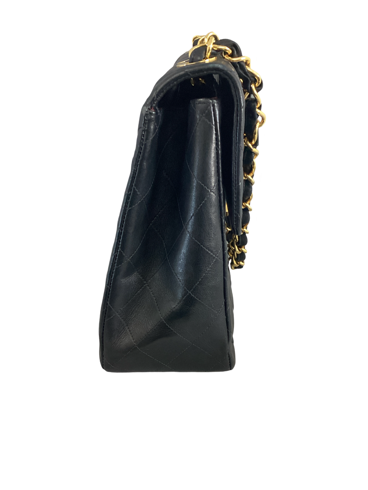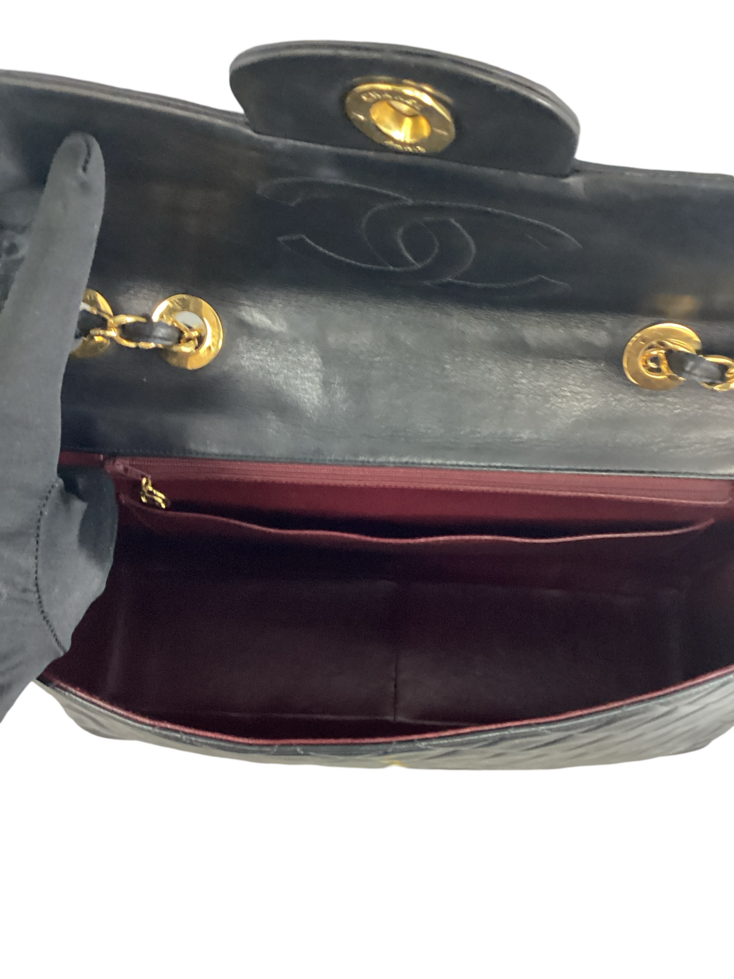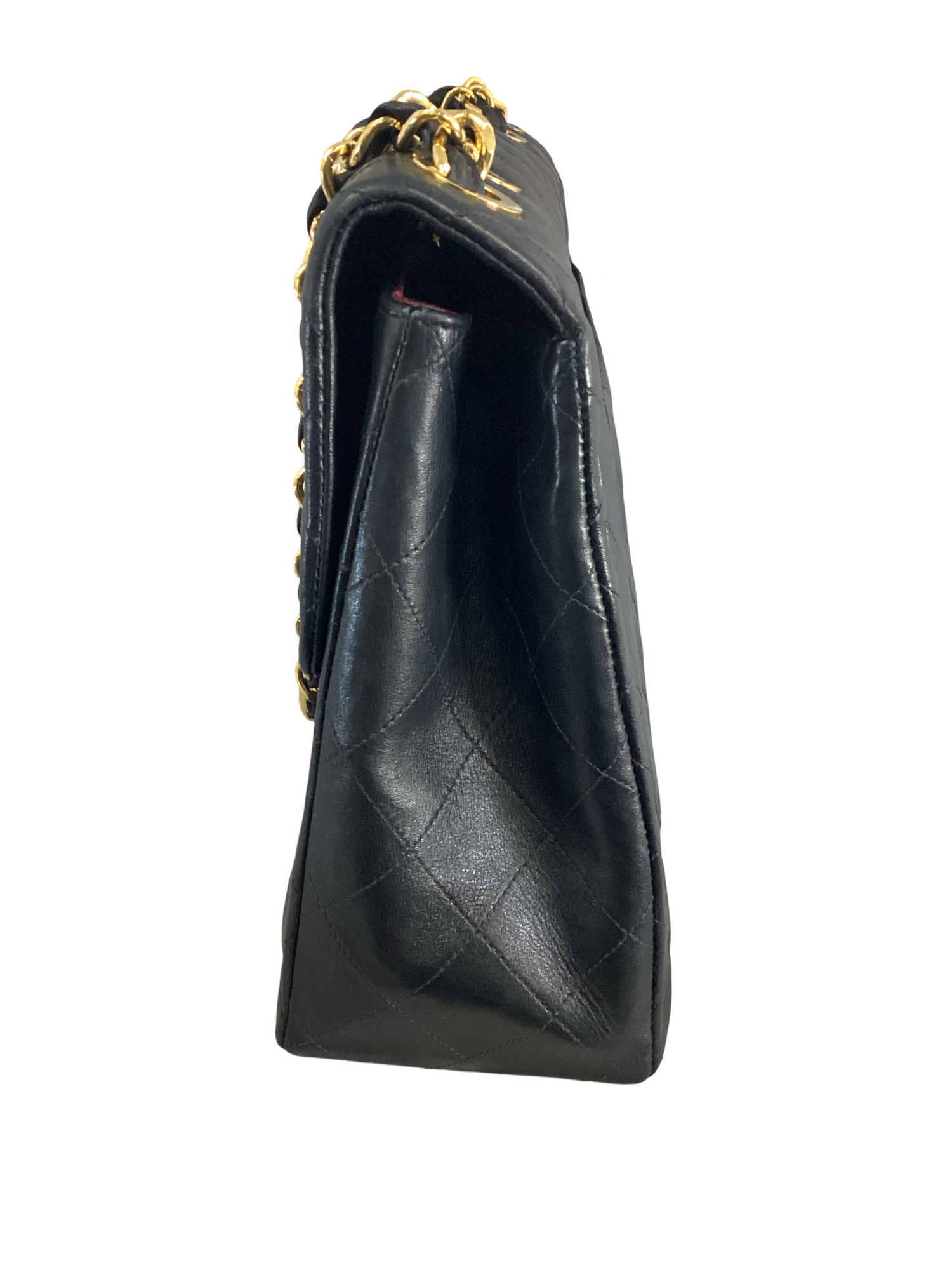 Chanel Vintage Jumbo XL Maxi Flap Bag with 24K gold-plated hardware, made in lambskin leather in black, chain-link strap and back exterior pocket and flap cc-turn lock closure, Interior features red leather lining, a slip pocket and interior zipper pocket.