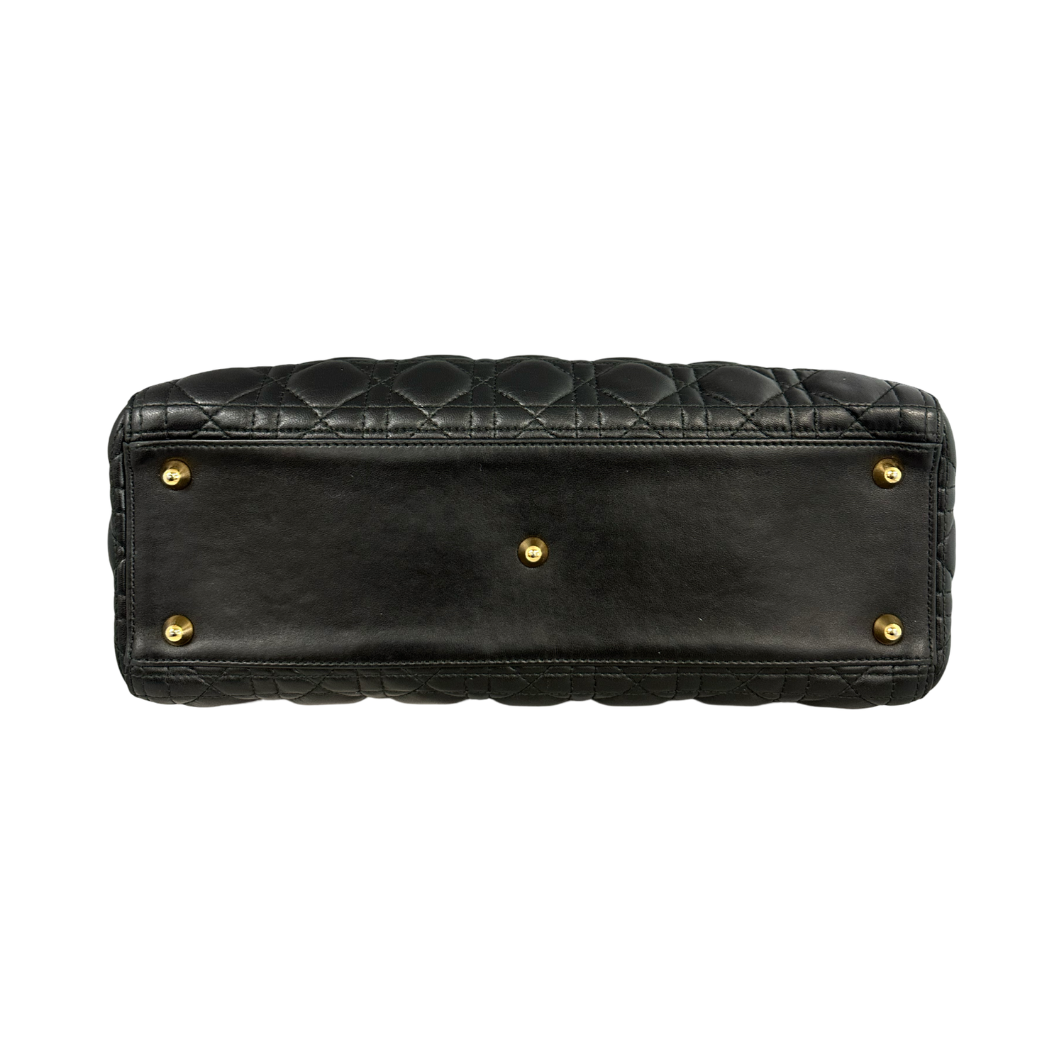 Christian Dior-Black Cannage Leather Large Lady Dior with gold-tone hardware, crafted of black lambskin leather with diamond quilting, a sturdy leather top handles, hanging Dior initials logo charms and top zipper closure. Interior features red fabric lining interior with zipper pocket.