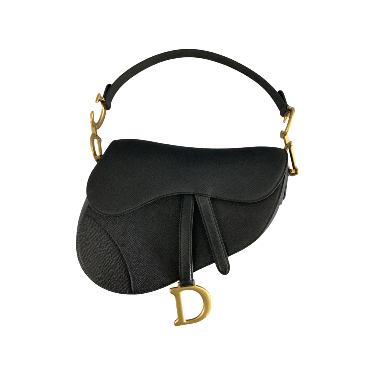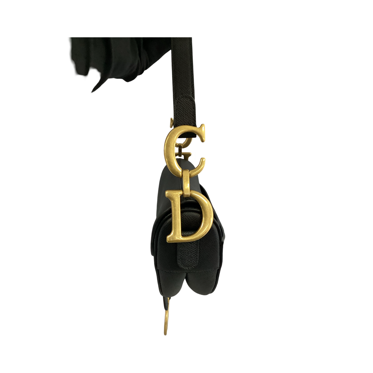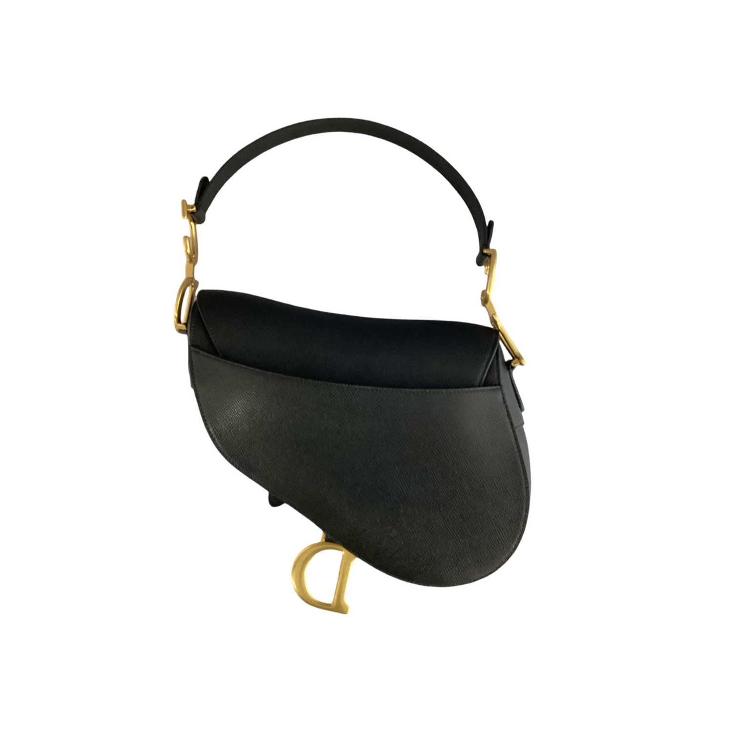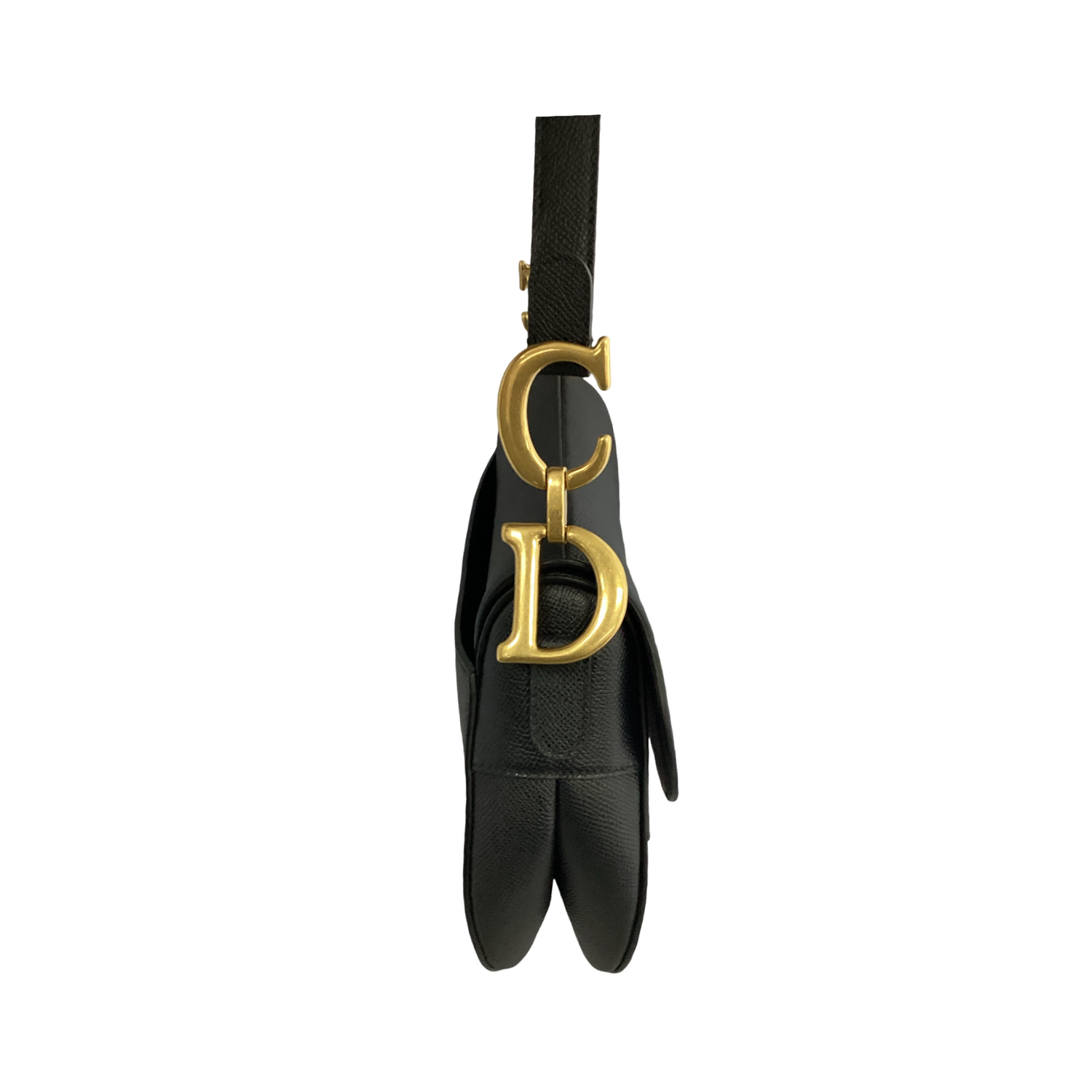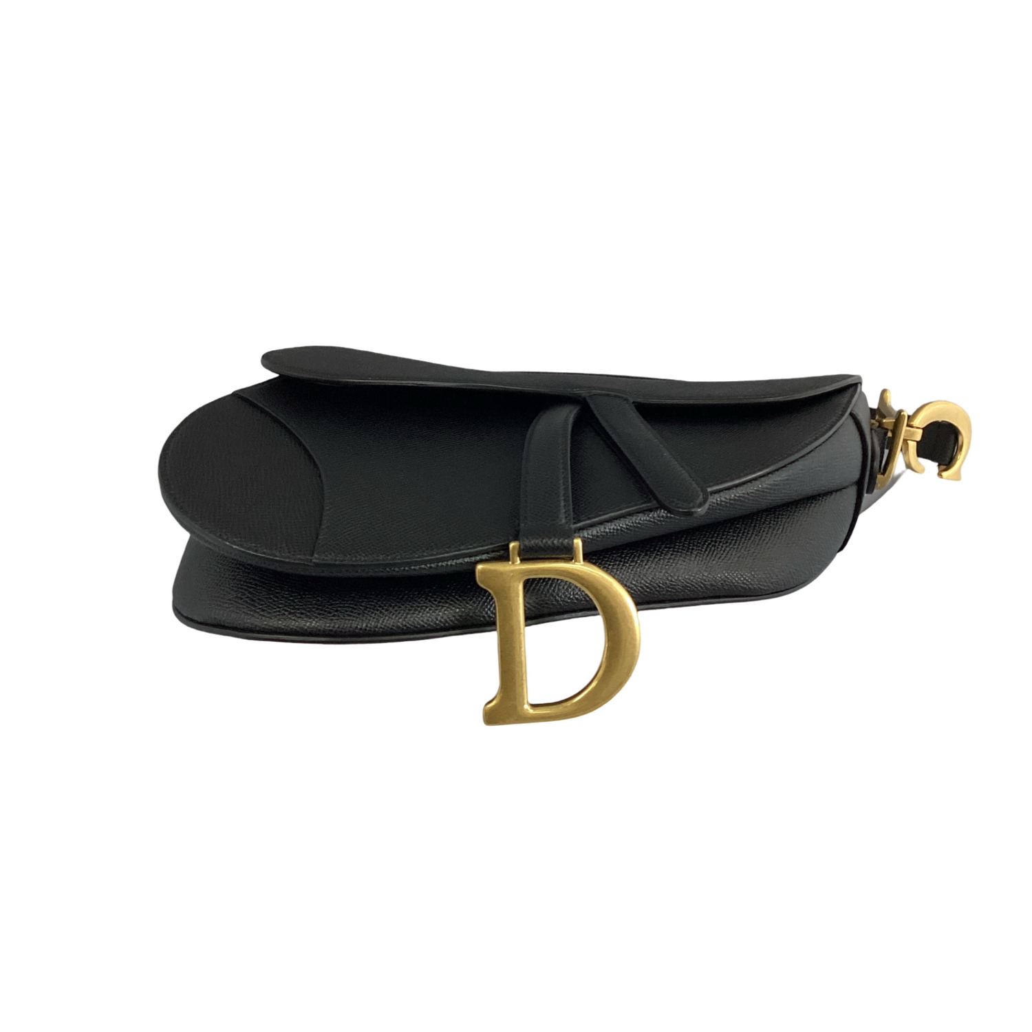 Christian Dior-Black Leather Saddle with gold-toned hardware, crafted of calfskin leather in black, features the saddle bag shape, a short leather shoulder strap with polished brass "C" and "D" anchors on either end of the handle for the handle, and a prominent hanging Dior "D" charm, also comes with an elegant embroidered detachable Christian Dior Strap and a magnetic flap closure . Interior features a black fabric interior with a zipper pocket.