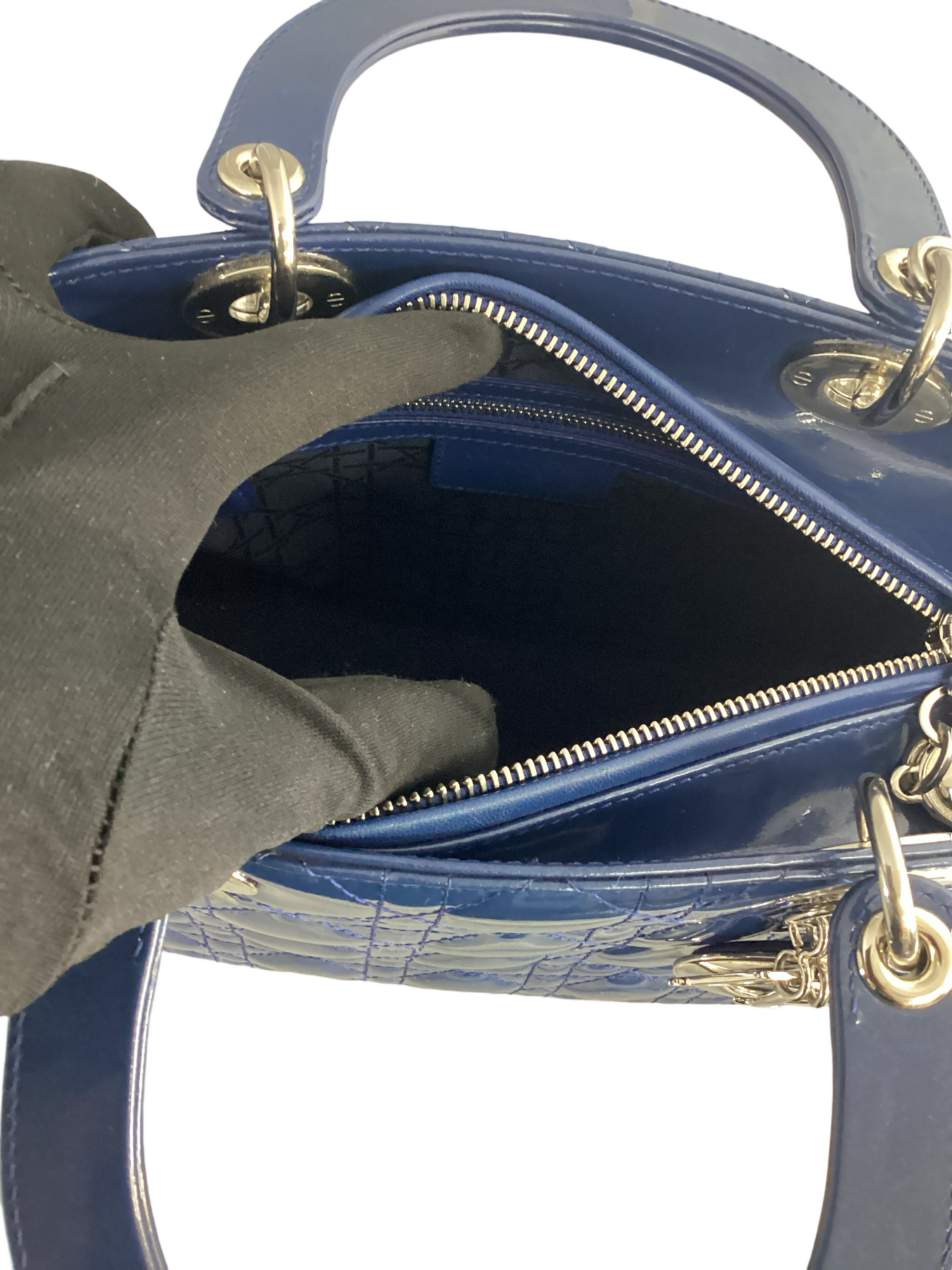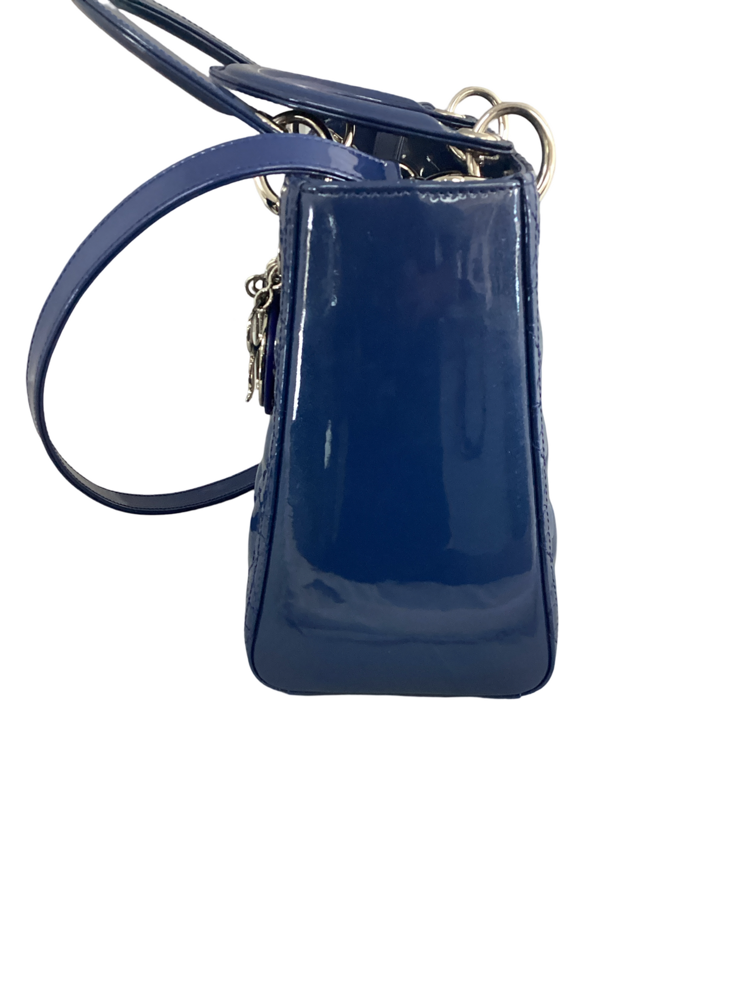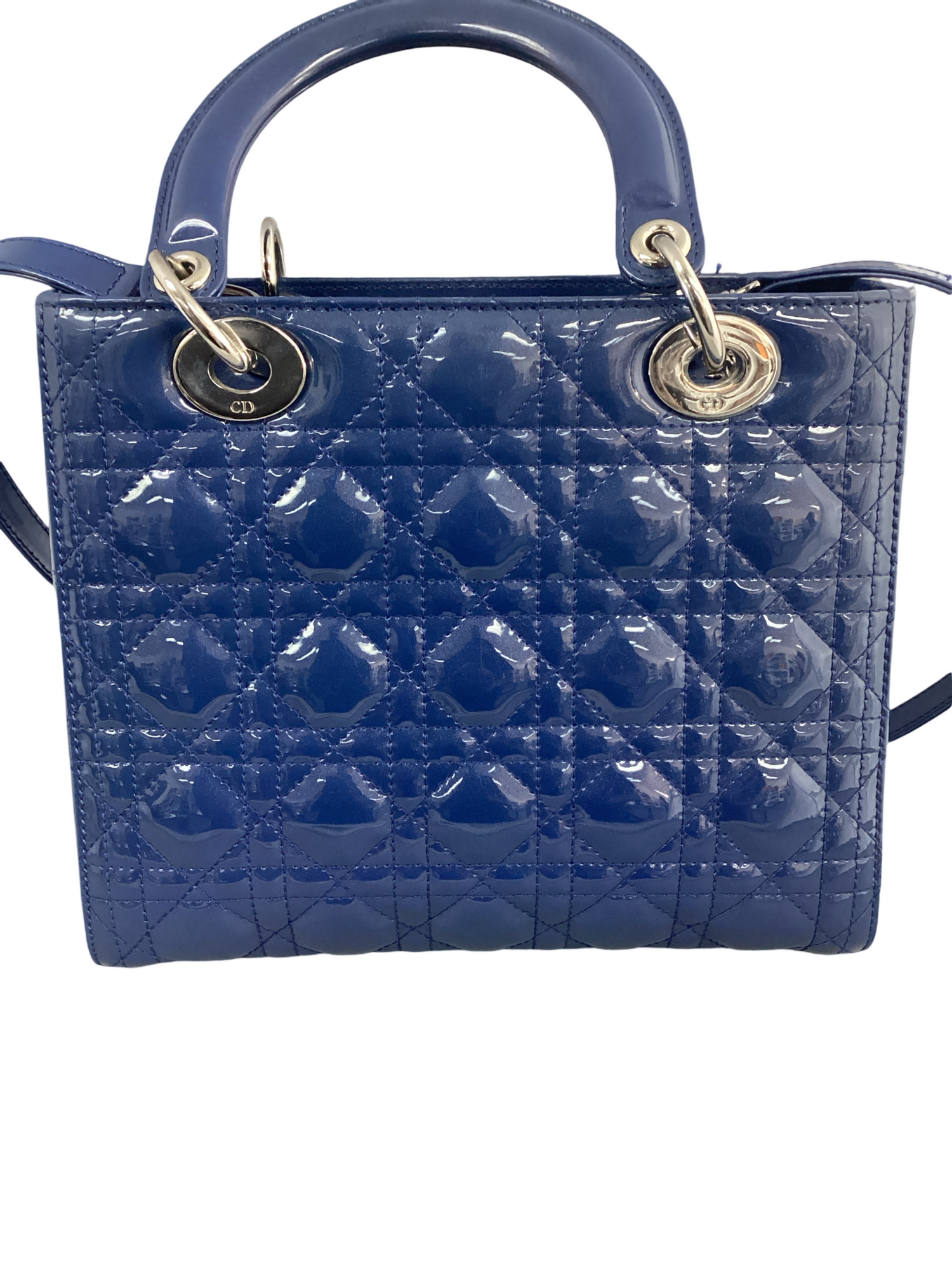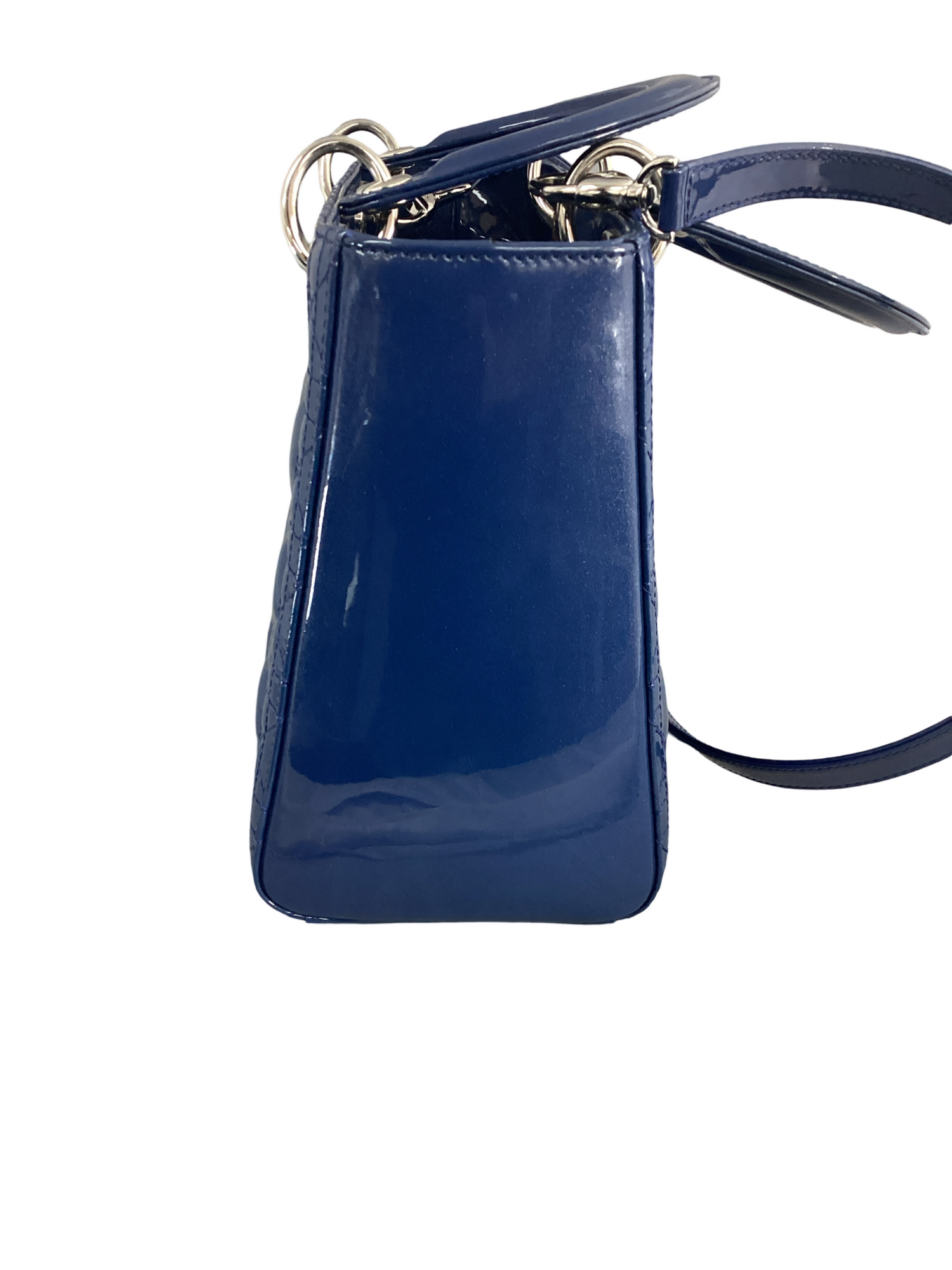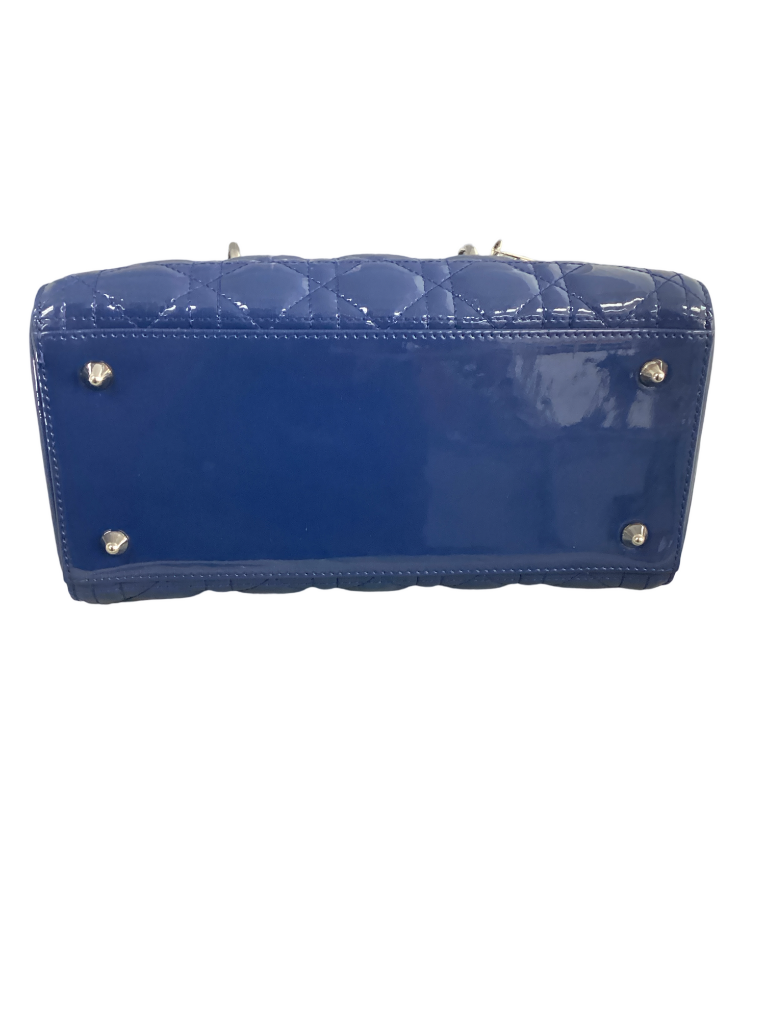 Christian Dior Blue Medium Cannage Lady Dior with silver-toned hardware, geometric quilted patent leather in blue, a matching patent leather top handles and a chain and patent leather detachable strap and a zipper closure. Interior features a black Dior monogram fabric interior and zipper pocket.