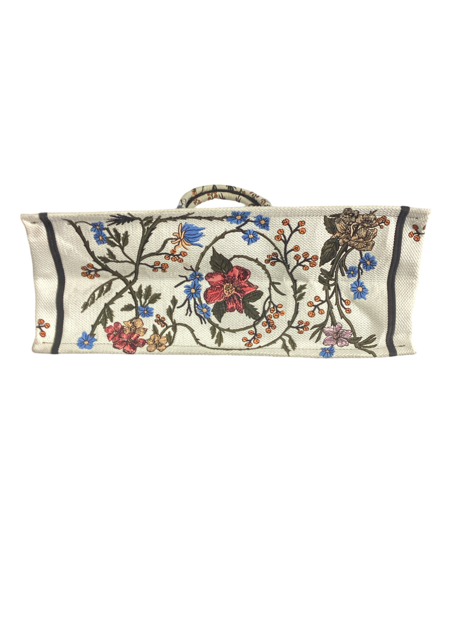 Christian Dior Floral Embroidered Canvas Book Tote with a bold botanical motif. The bag features matching canvas rolled top handles, with the CHRISTIAN DIOR logo embroidered across the front panel. The bag opens to an unlined fabric interior.