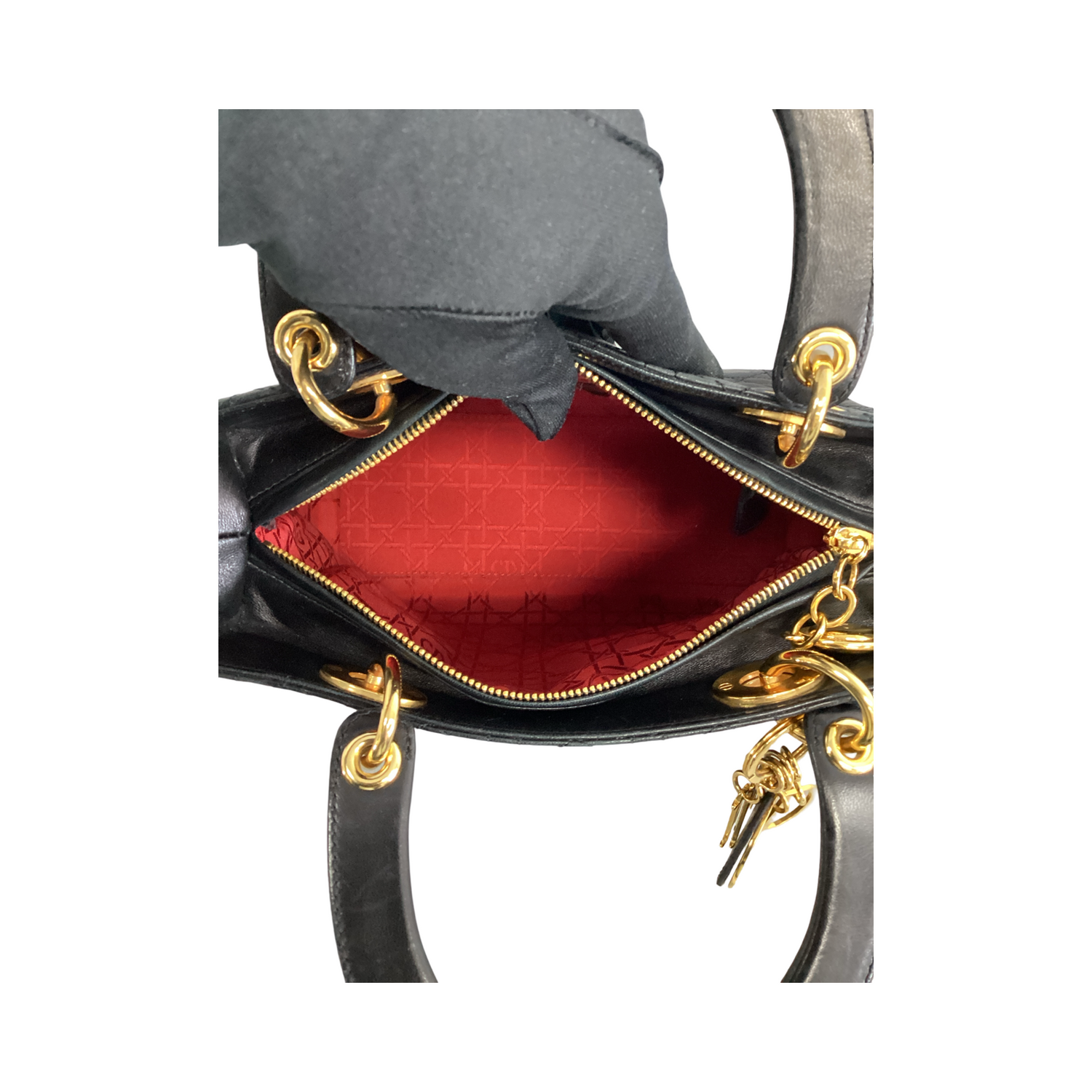 Christian Dior Medium Cannage Leather Lady Dior with gold-tone hardware, crafted of black lambskin leather with diamond quilting, a sturdy leather top handles, matte black hardware and hanging Dior initials logo charms and top zipper closure. Interior features red fabric lining interior with zipper pocket.