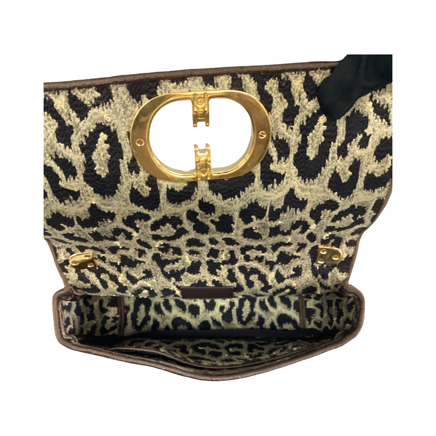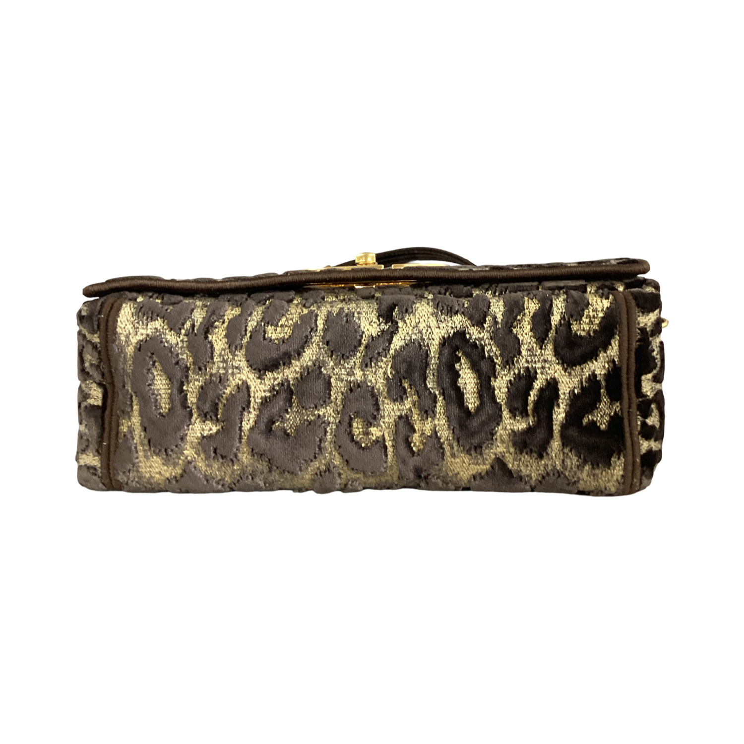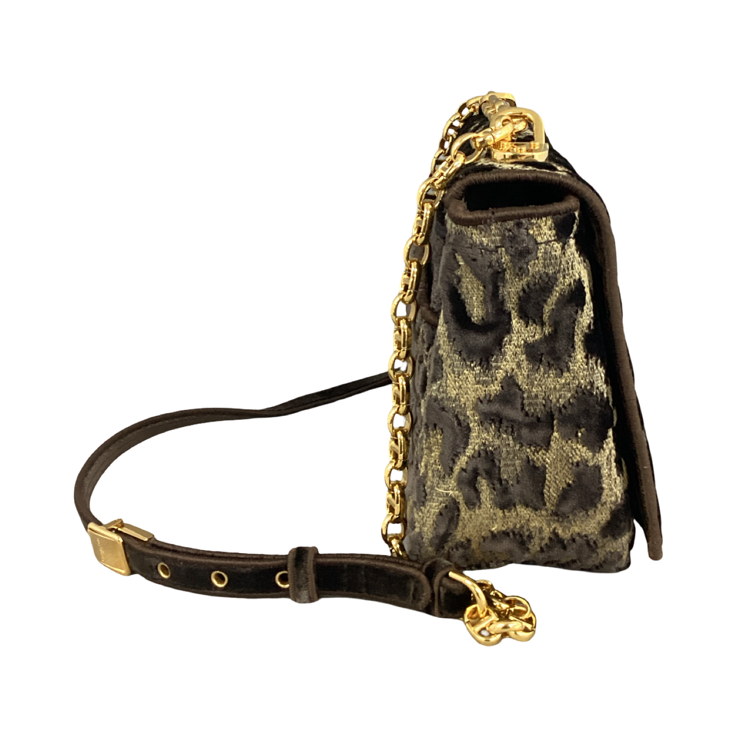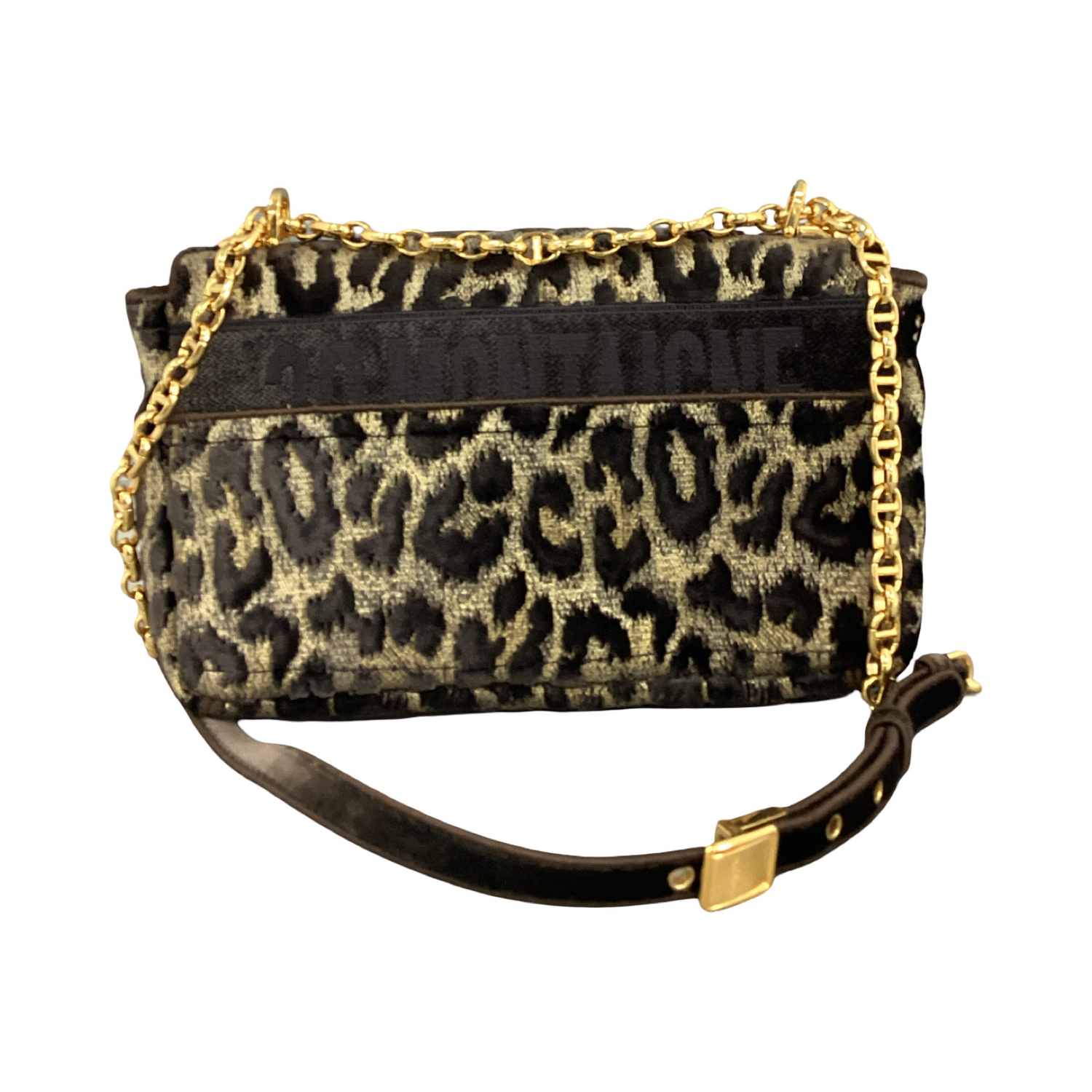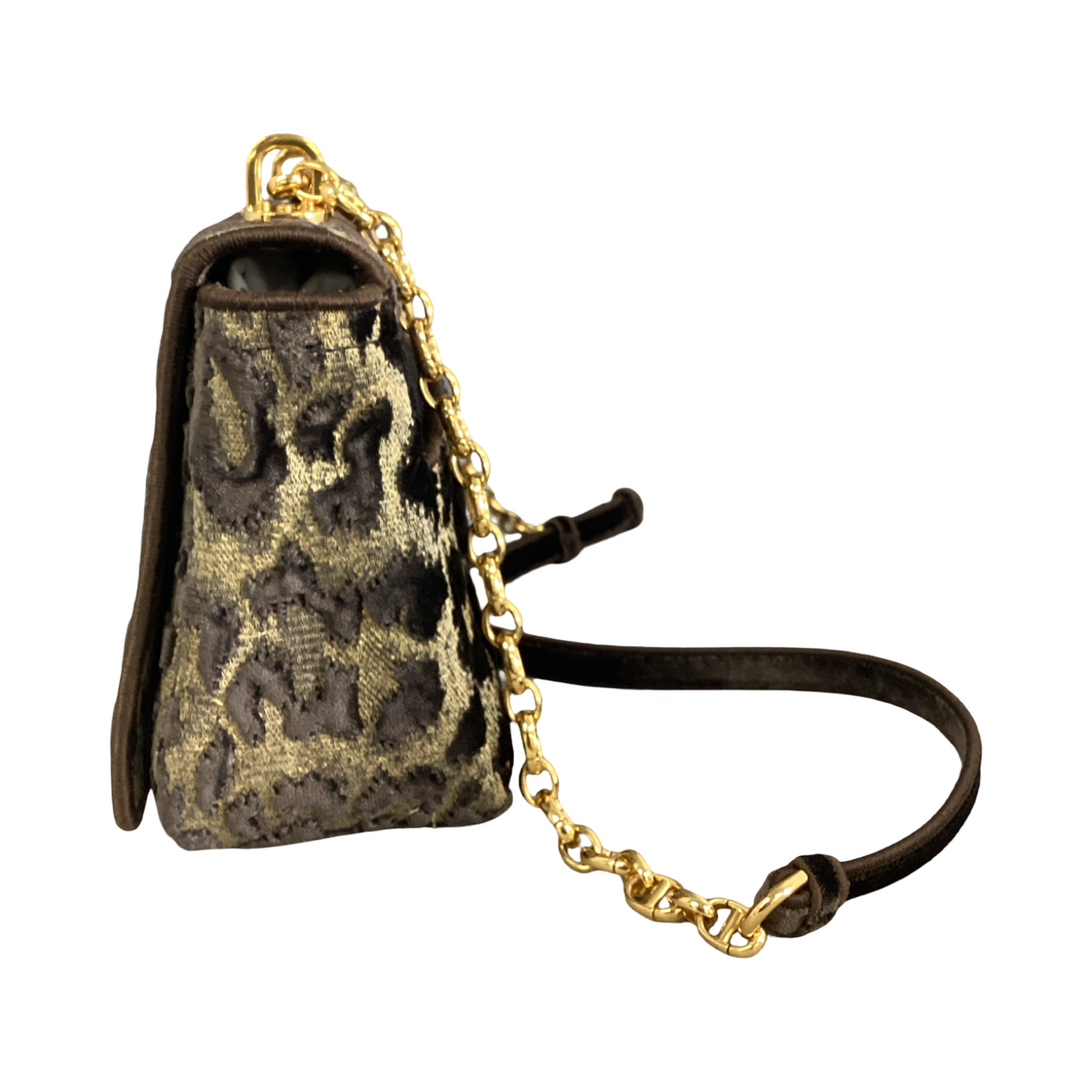 Christian Dior Velvet Missa Medium Caro Bag with gold-toned hardware, crafted in beige velvet with black velvet animal print, a gold chain shoulder strap with a velvet shoulder pad, exterior patch pocket, and a front flap gold CD turn lock. Interior features a matching canvas interior with a patch pocket.