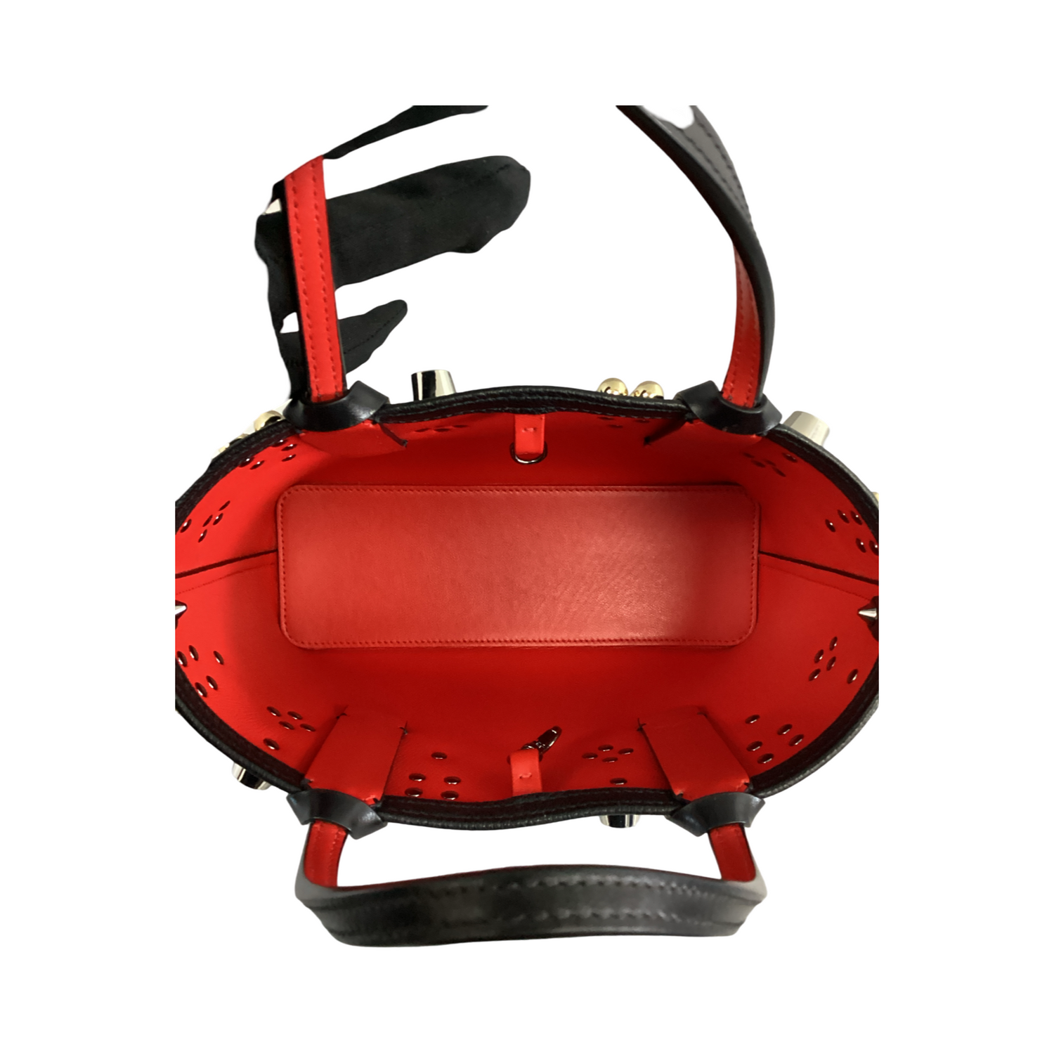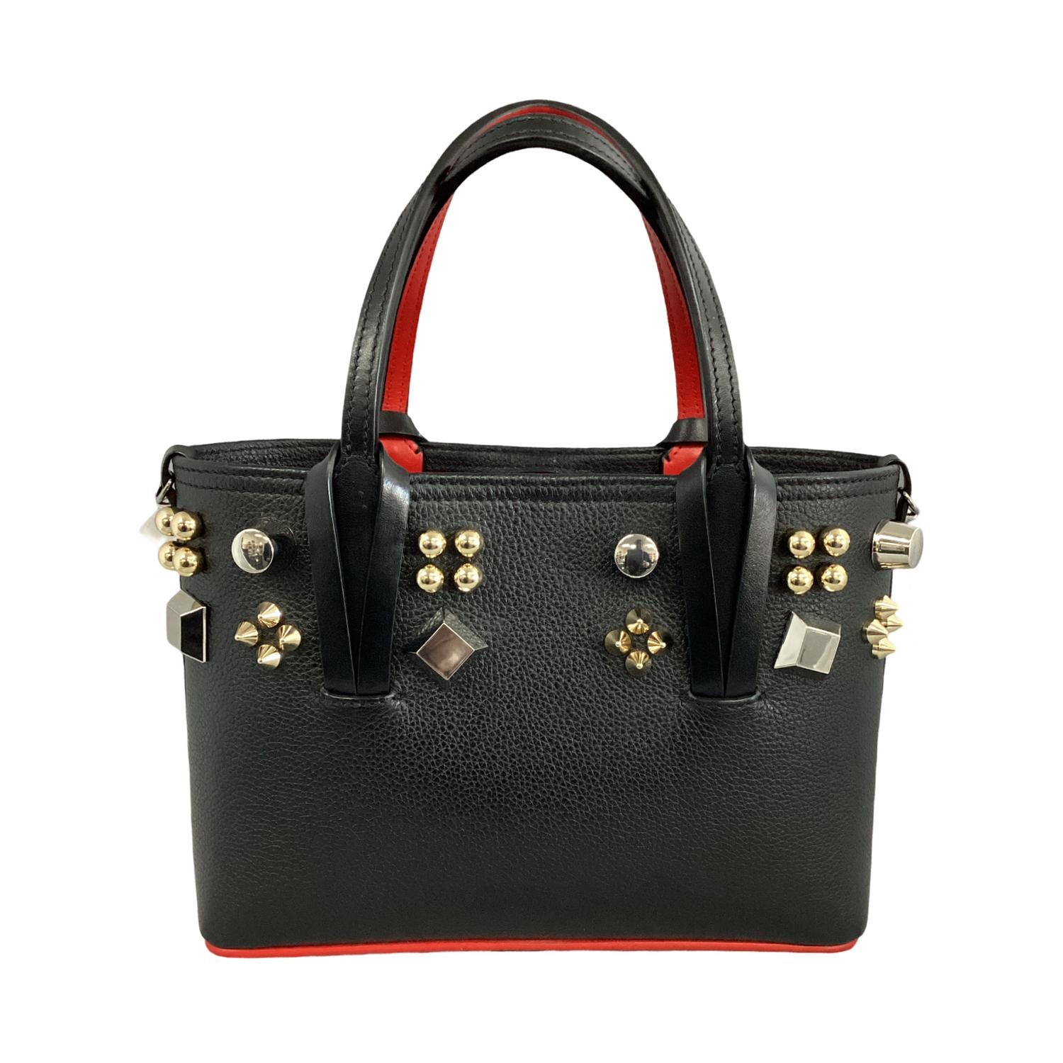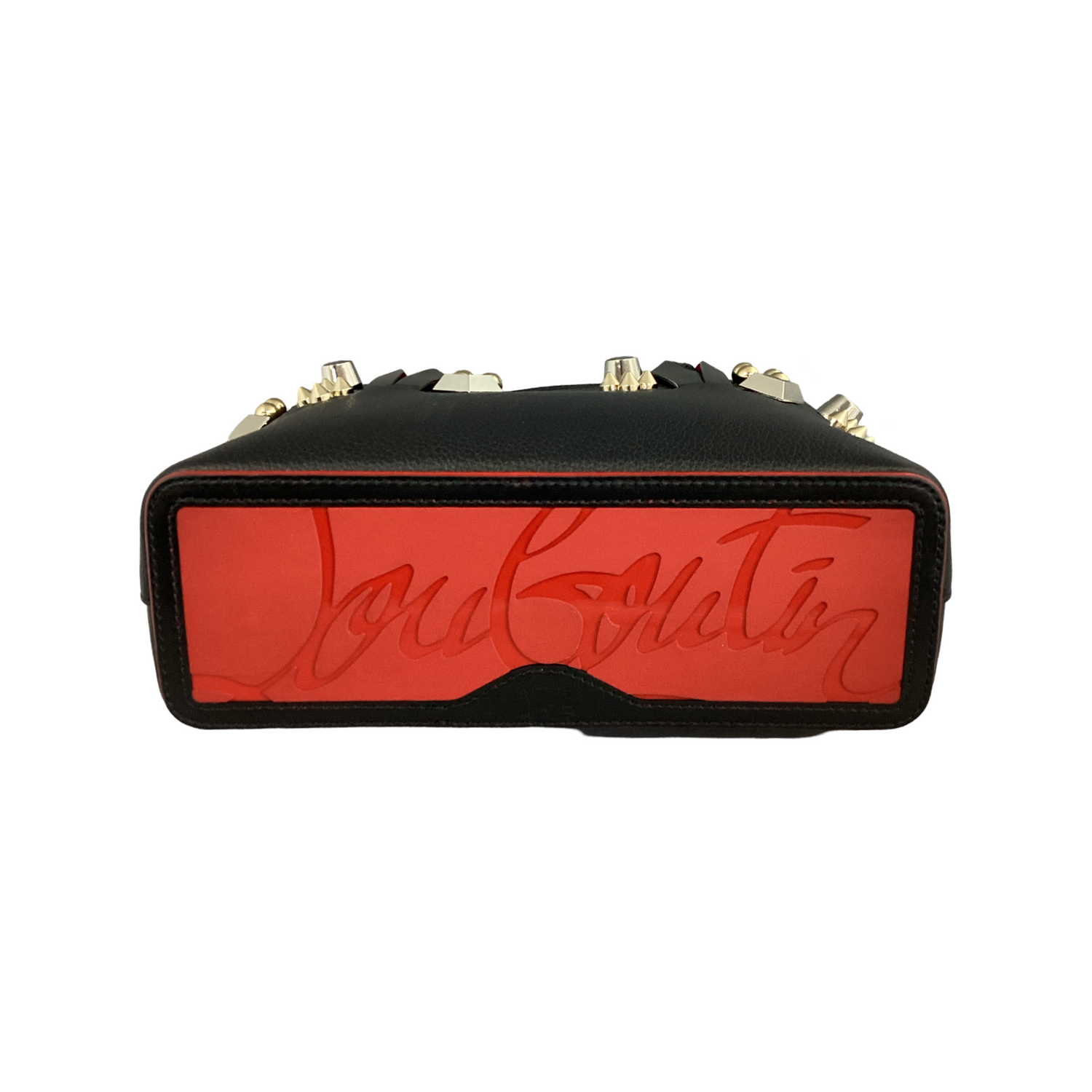 Christian Louboutin-Empire Cabata Spike Small with silver-toned hardware, crafted of calfskin leather in black, detachable leather strap, and dual black leather top handle with silver studs and a red rubber base and hook clasp closure. Interior features a red leather interior.