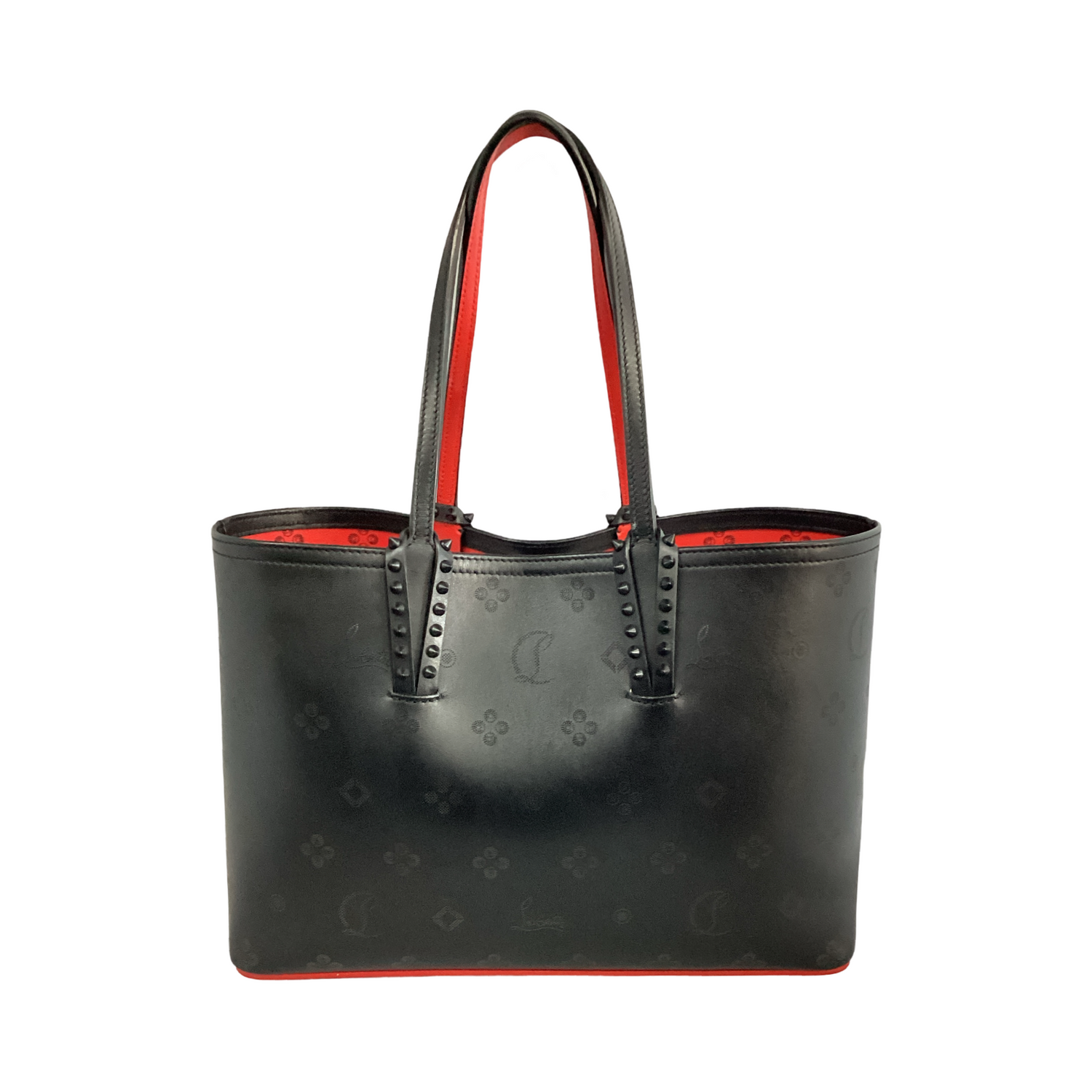 Christian Louboutin-Loubinthesky Cabata Black Tote with black hardware, crafted of smooth leather with a bold print in black, dual leather strap handles with matte black studs accents and an embossed logo script across the base and hook clasp closure. Interior features a red leather interior with a matching removable pouch.