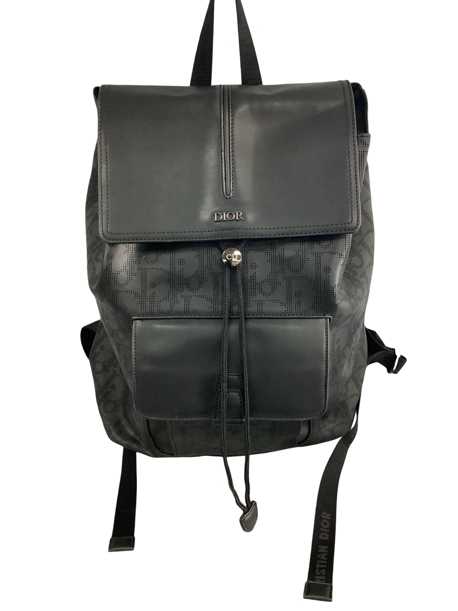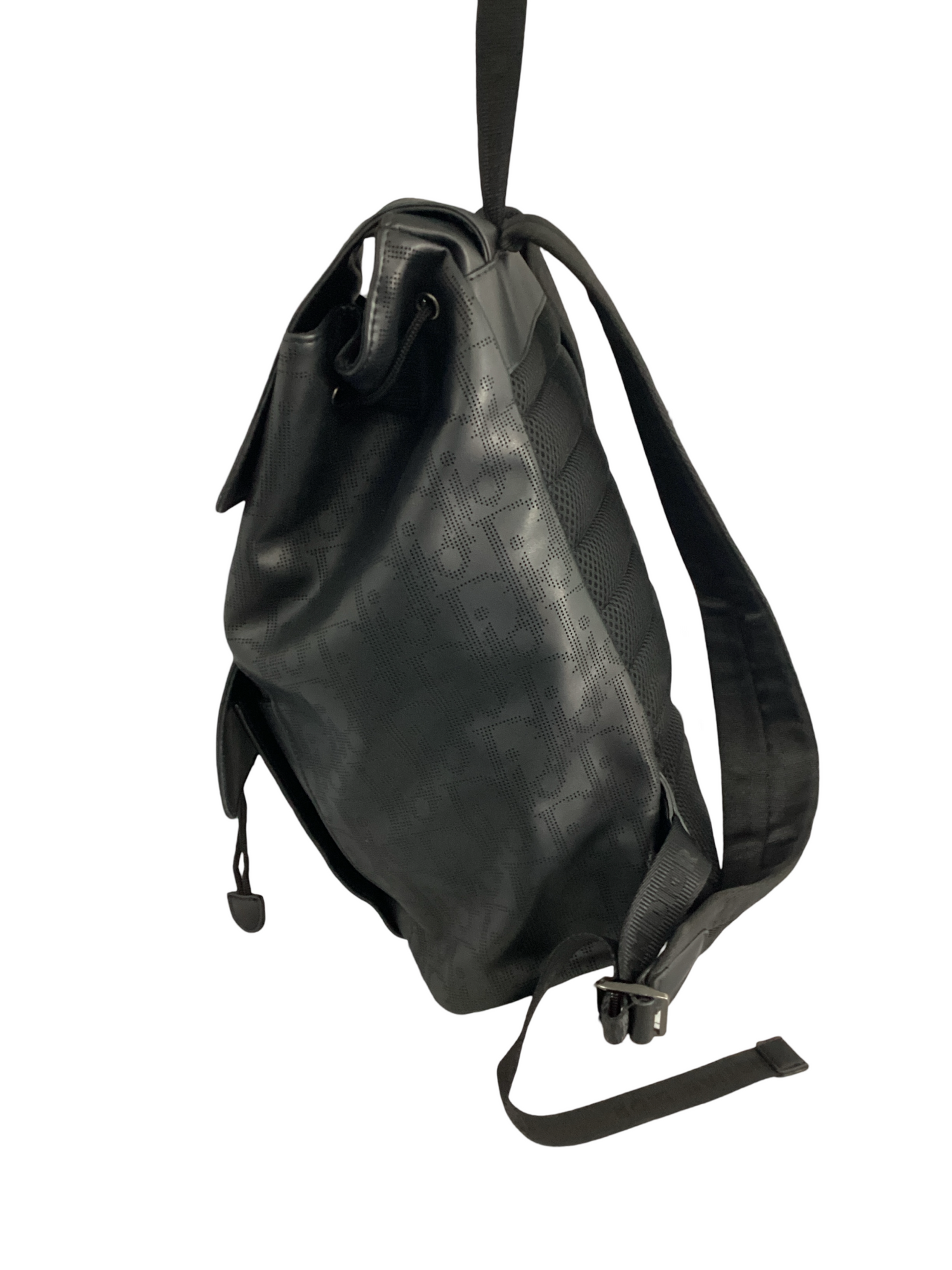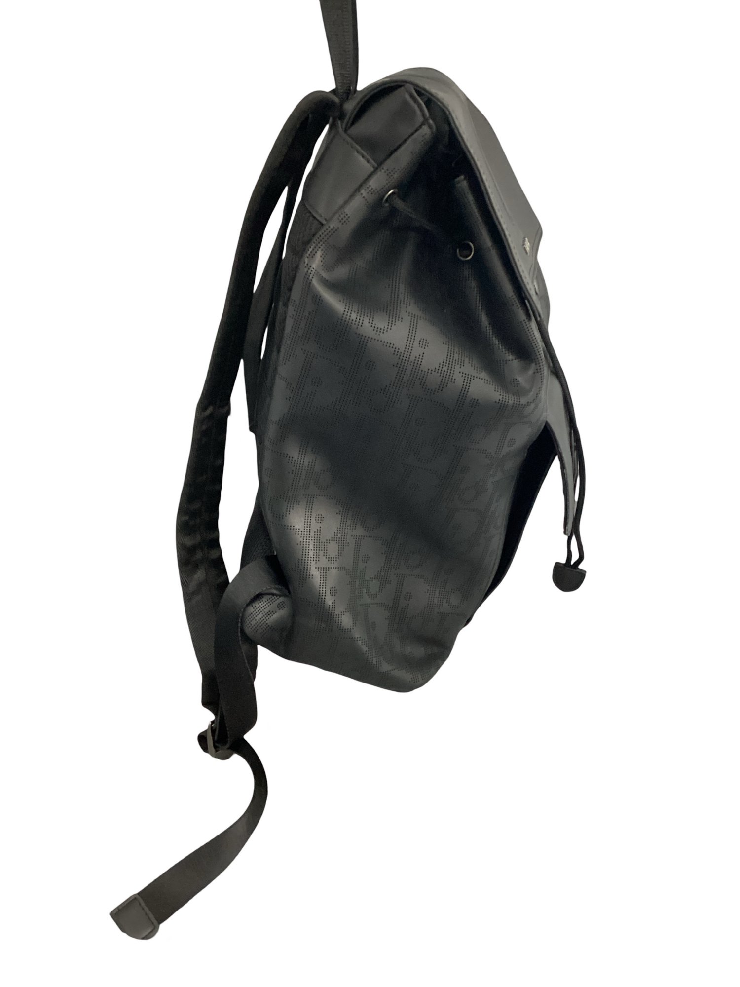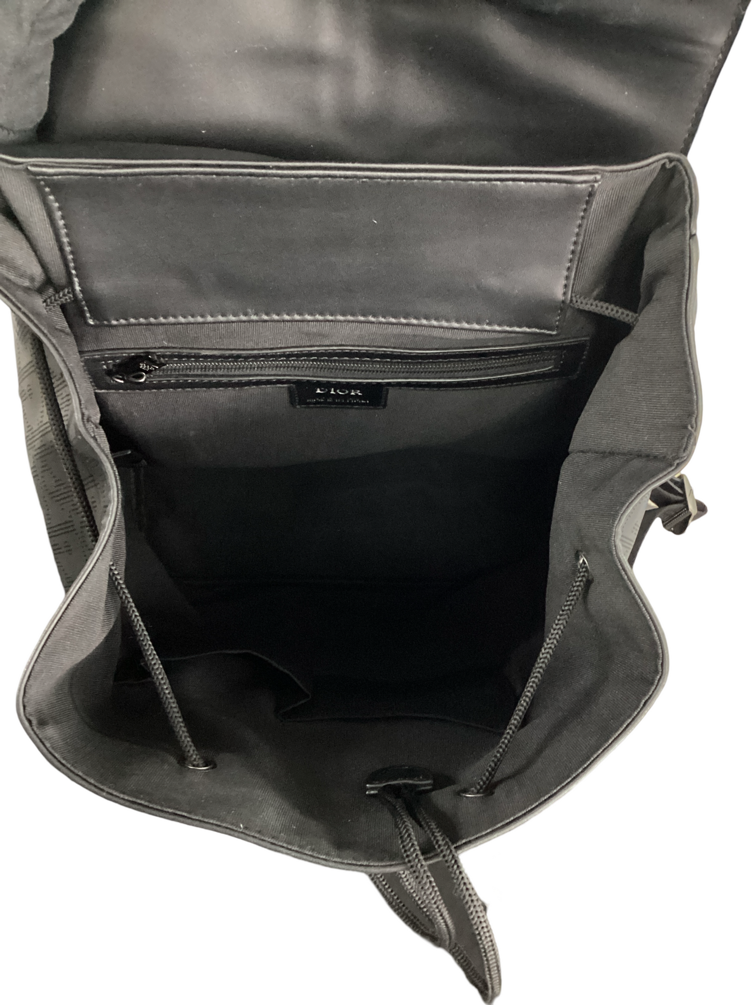 Dior 2021 Motion Backpack with gunmetal-tone hardware, black Dior oblique embroidered canvas, a front flap pocket, leather trimmed trop grip, adjustable nylon straps, drawstring cinch cord and snap closure. Interior features black fabric interior with two slip pockets and interior zipper pocket.
