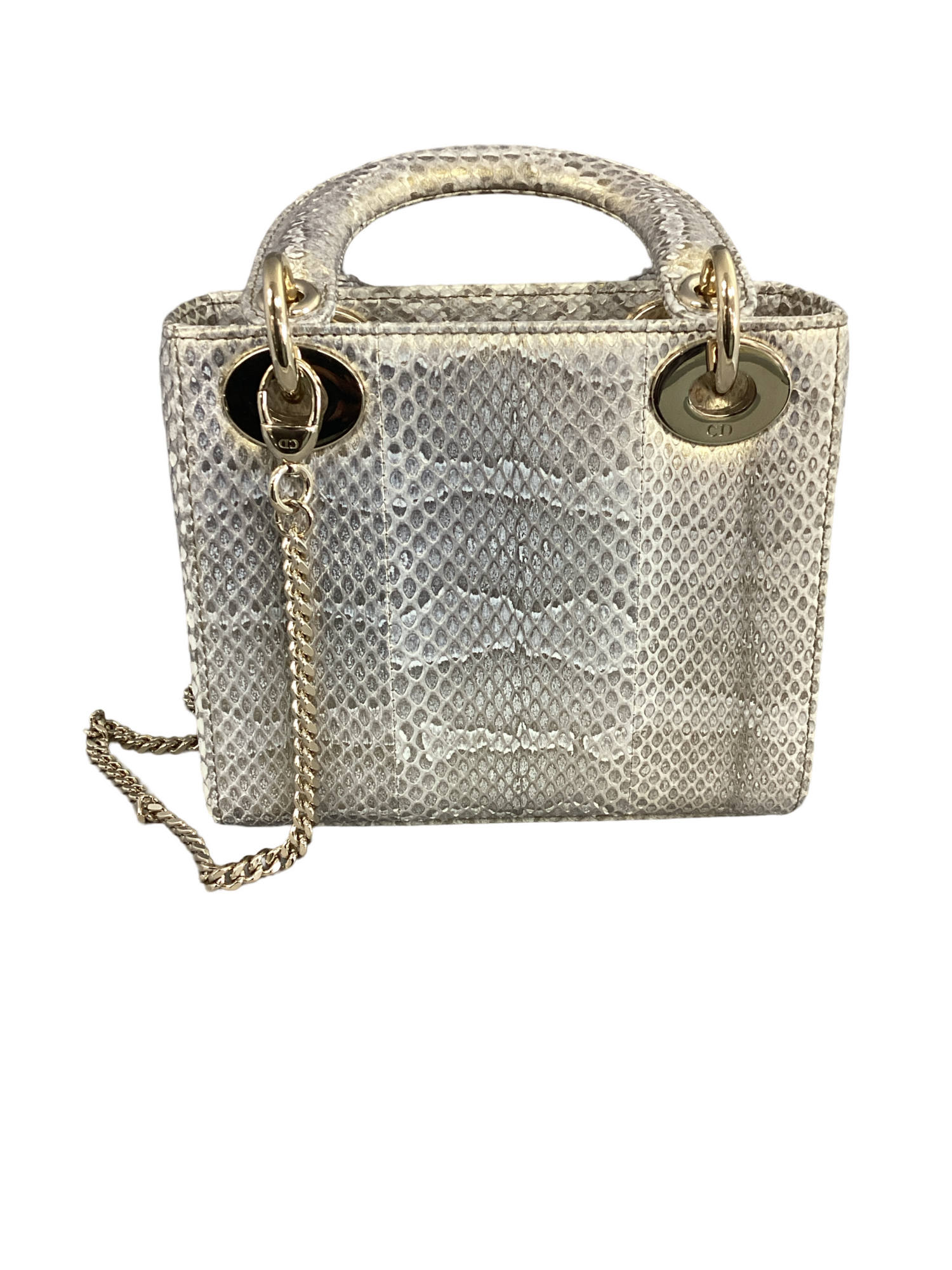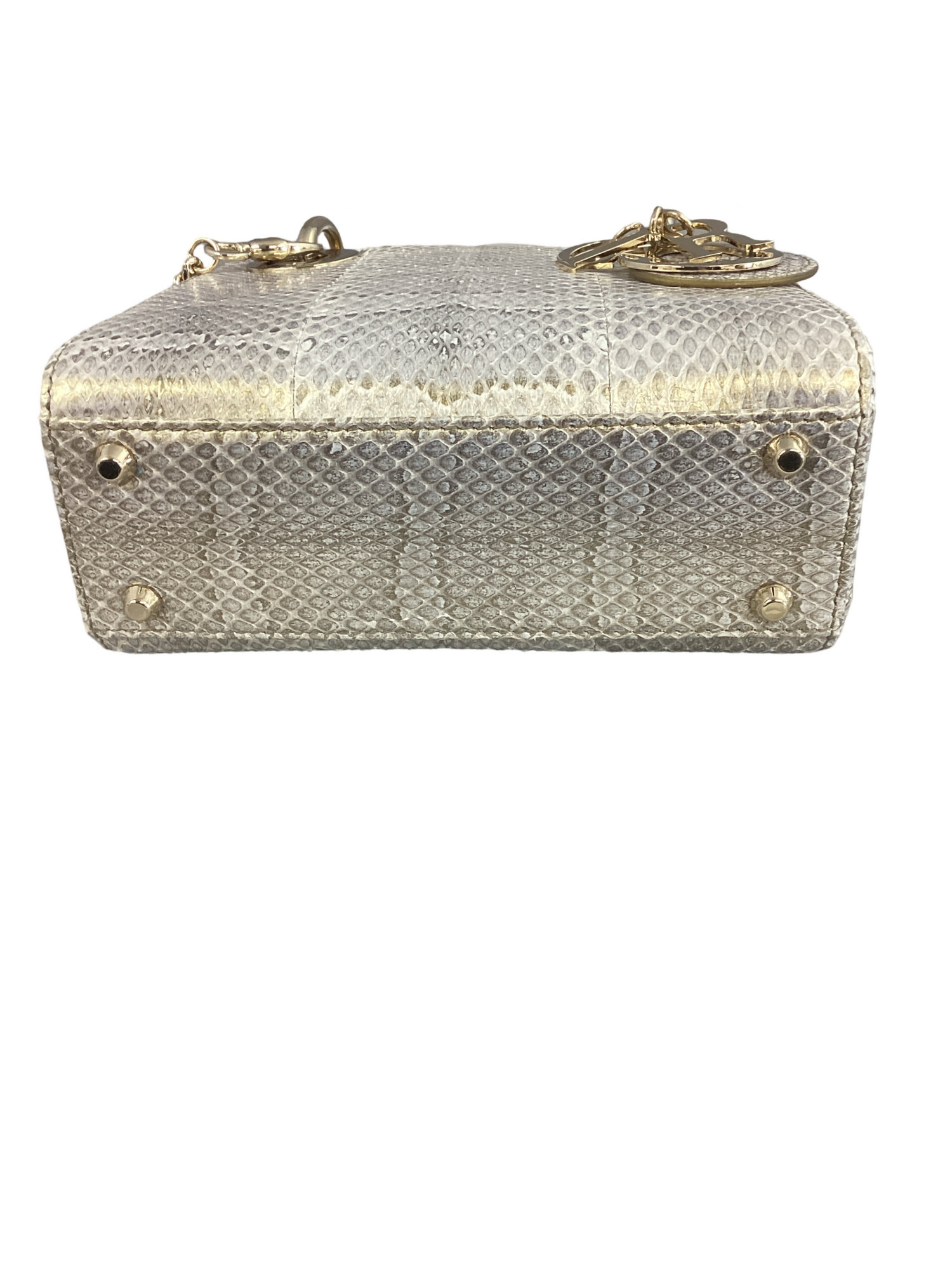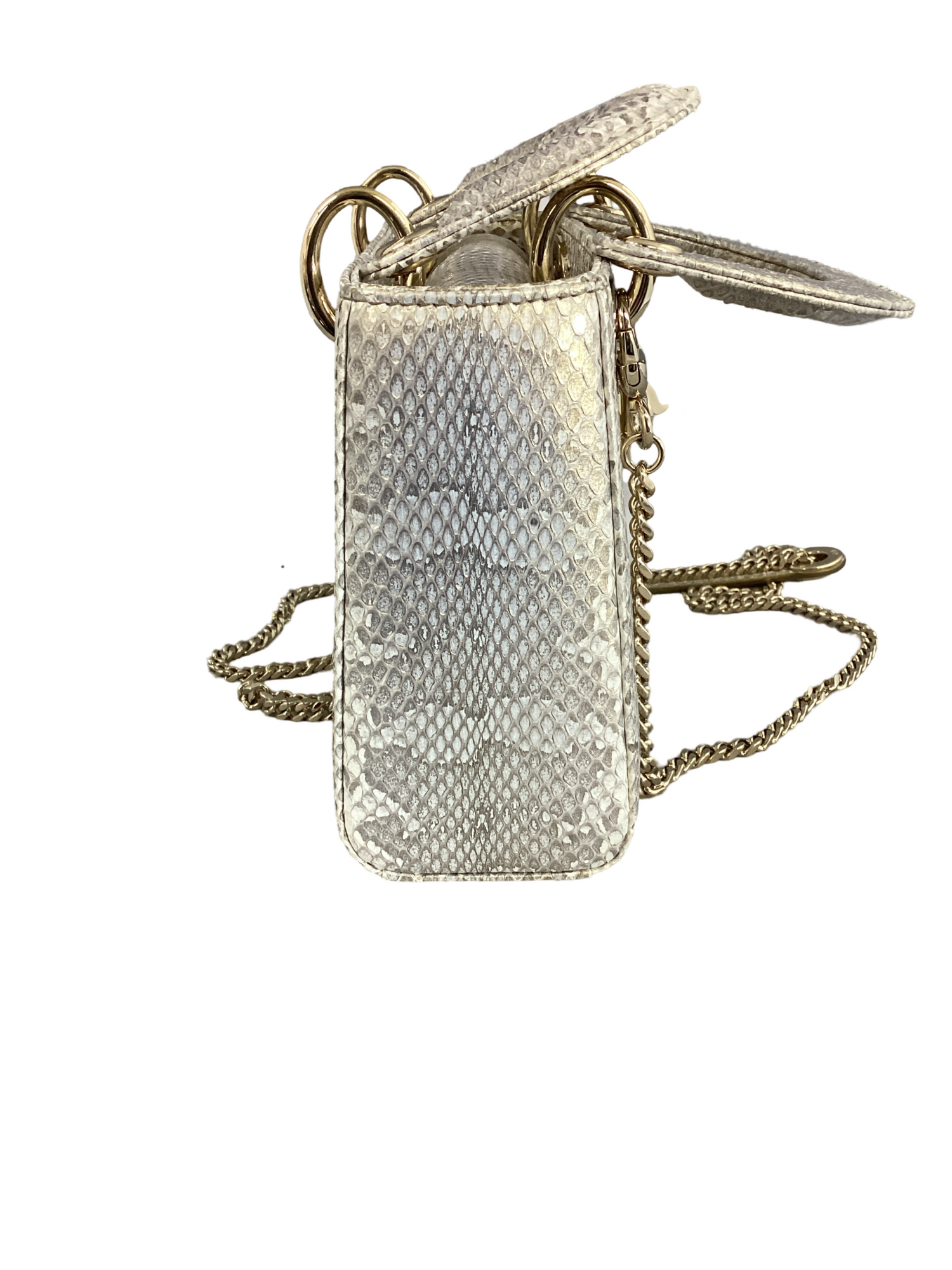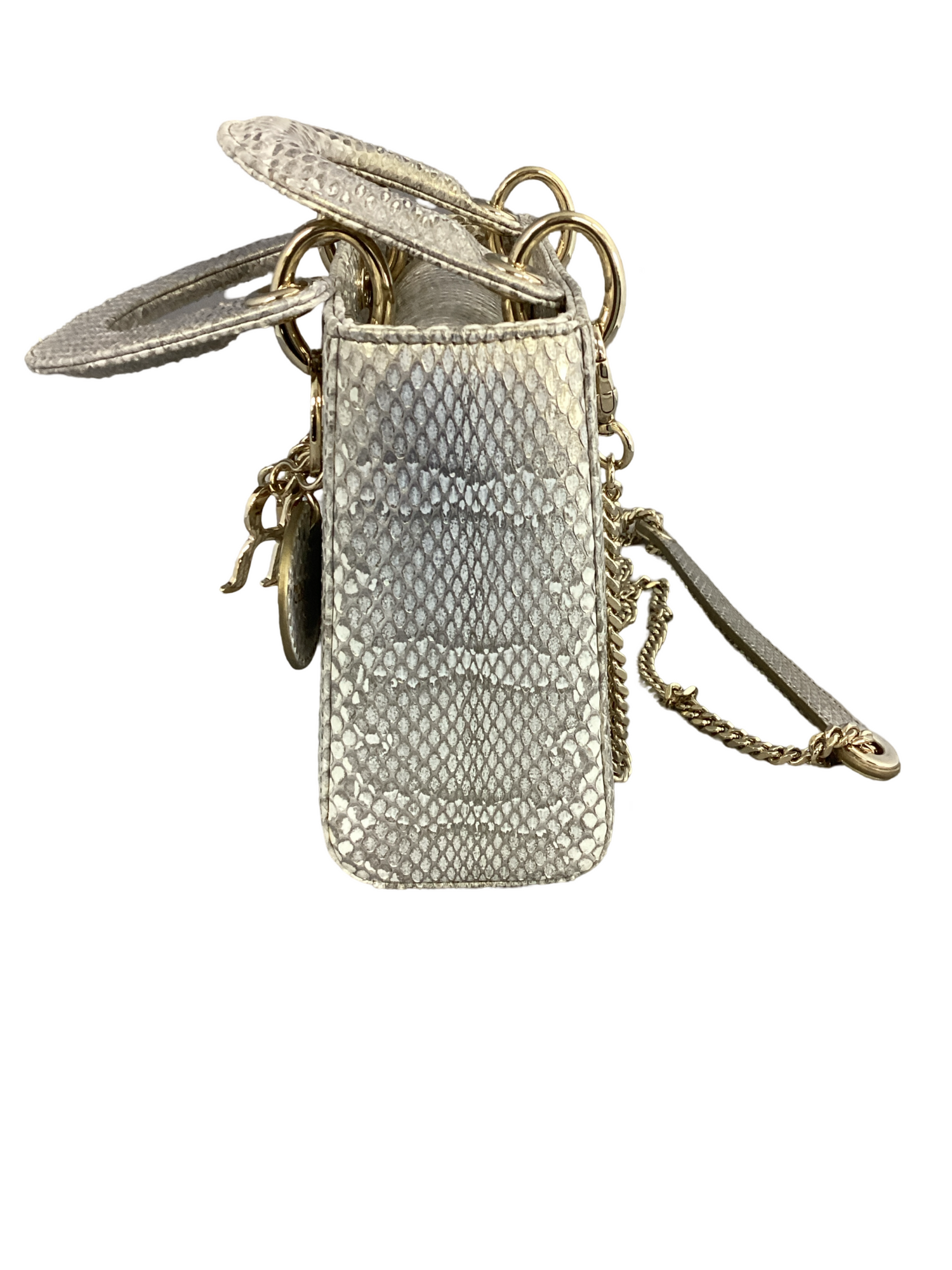 Dior Python Mini Lady Dior with gold-toned hardware, crafted of beautifully iridescent silver snakeskin, complimented by hanging gold-toned embellished Dior charms, detachable gold-toned link and leather shoulder strap and an interior flap top closure. Interior features a beige leather interior with a zipper pocket.