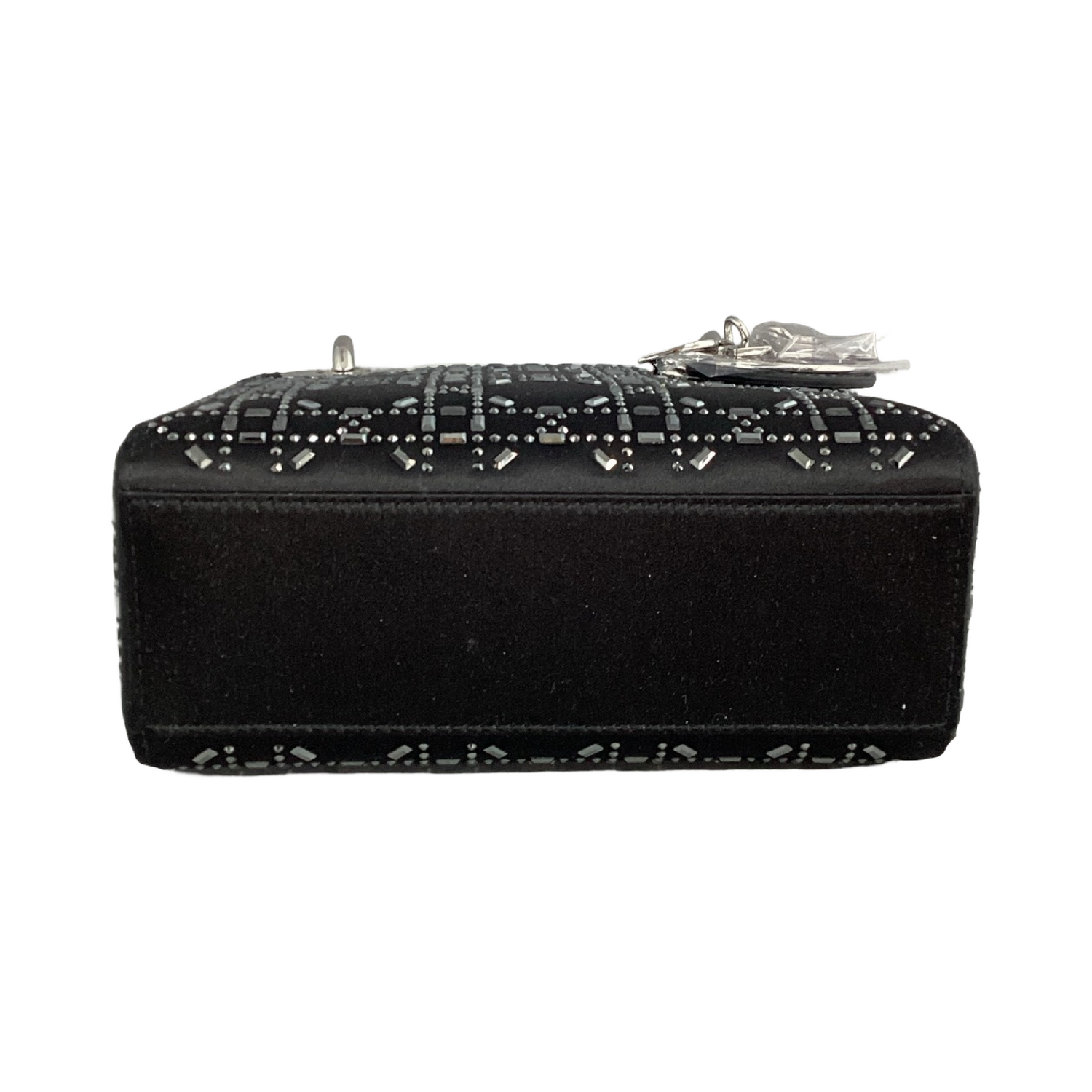 New In Box Dior Satin Crystal Cannage Mini Lady Dior with silver tone hardware, detachable adjustable crossbody strap, dual top handles, fold in flap closure. Interior features include black silk lining, 1 zipper pocket.