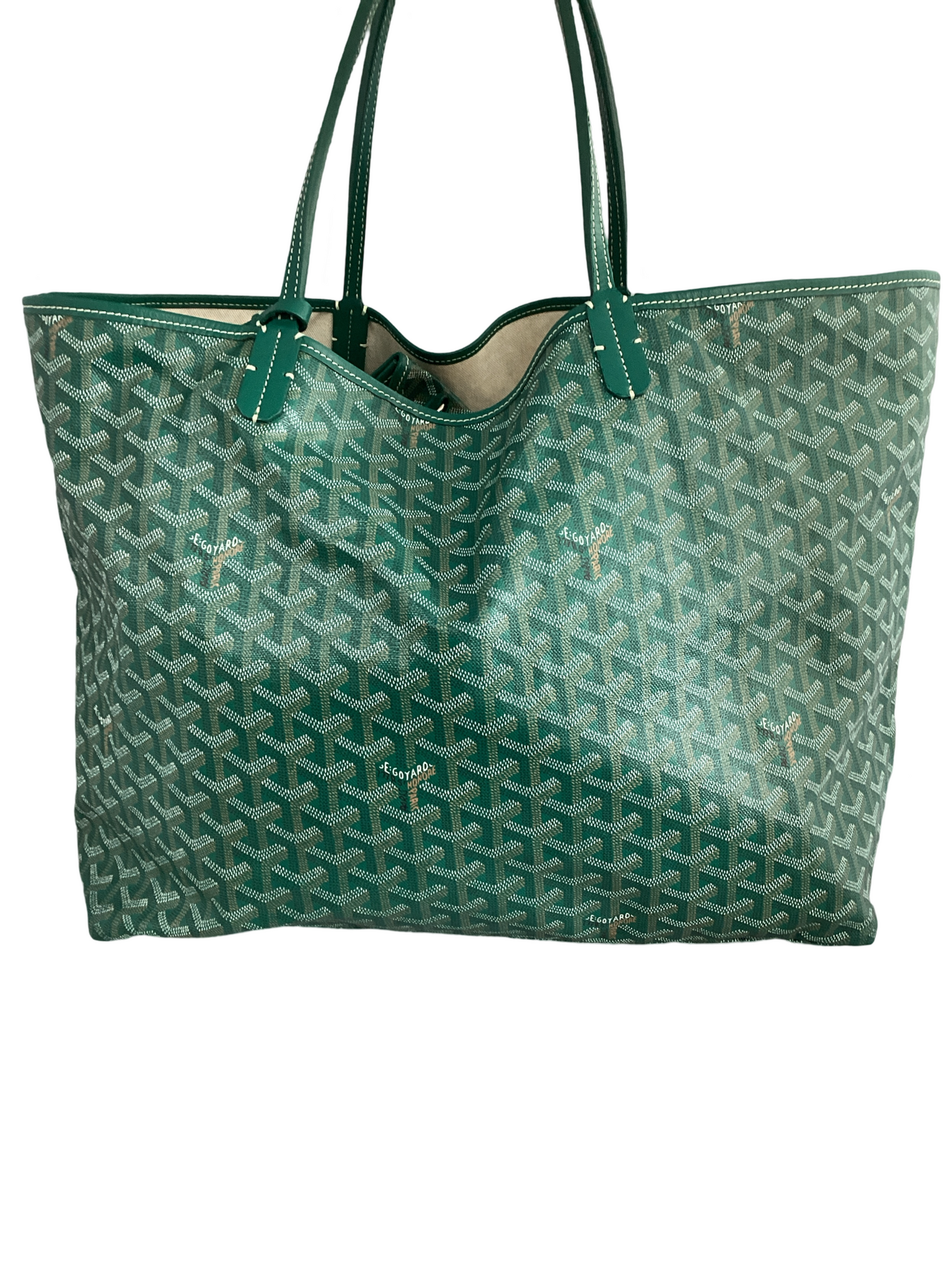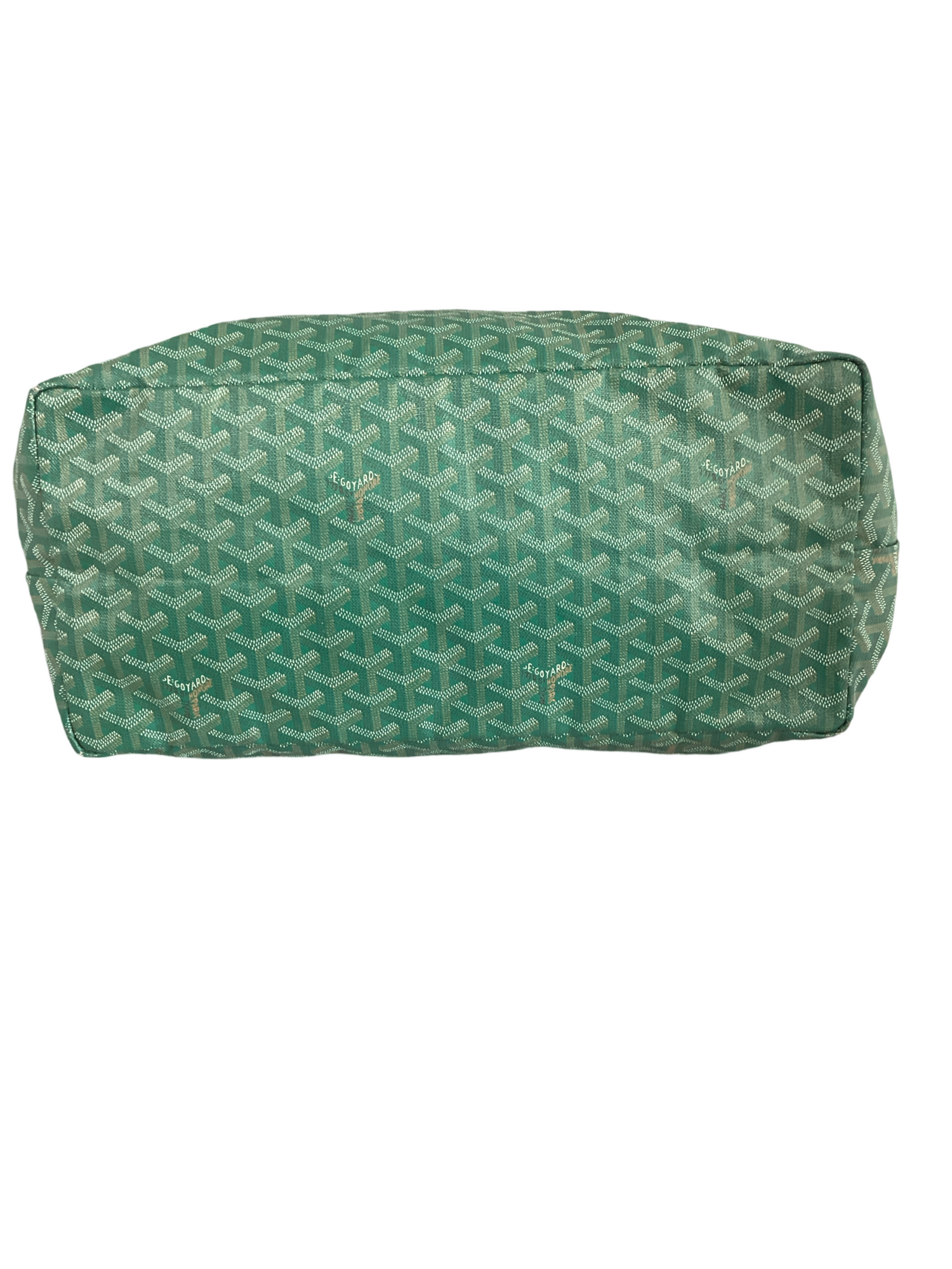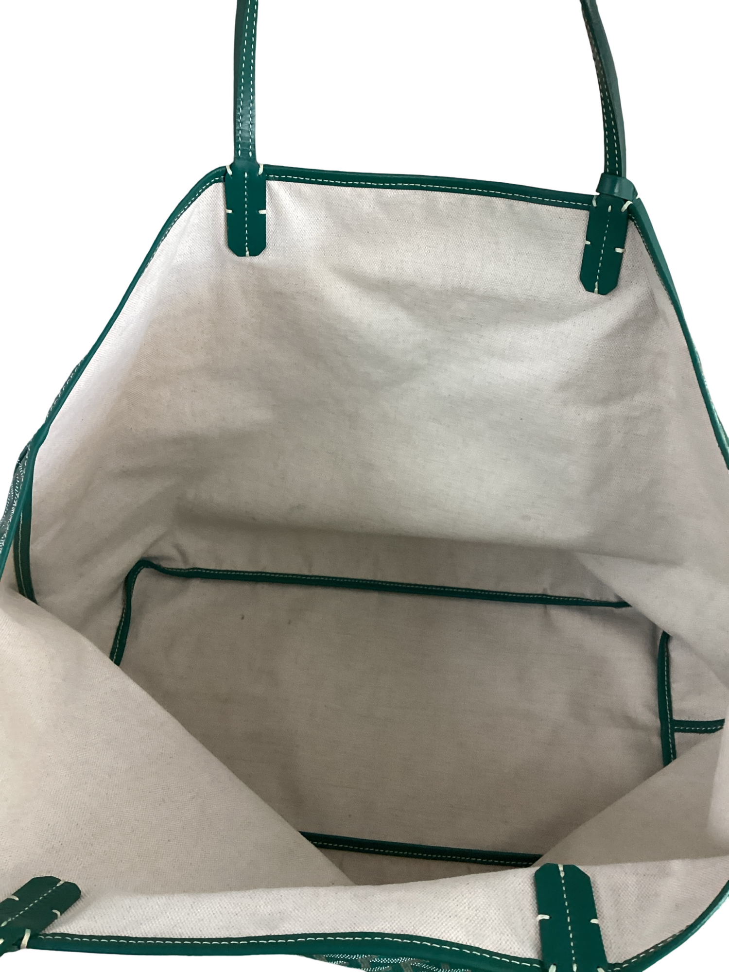 Goyard green Saint Louis GM Tote with silver-tone hardware, dual top handles. Interior features include tan canvas lining, detachable pouch.