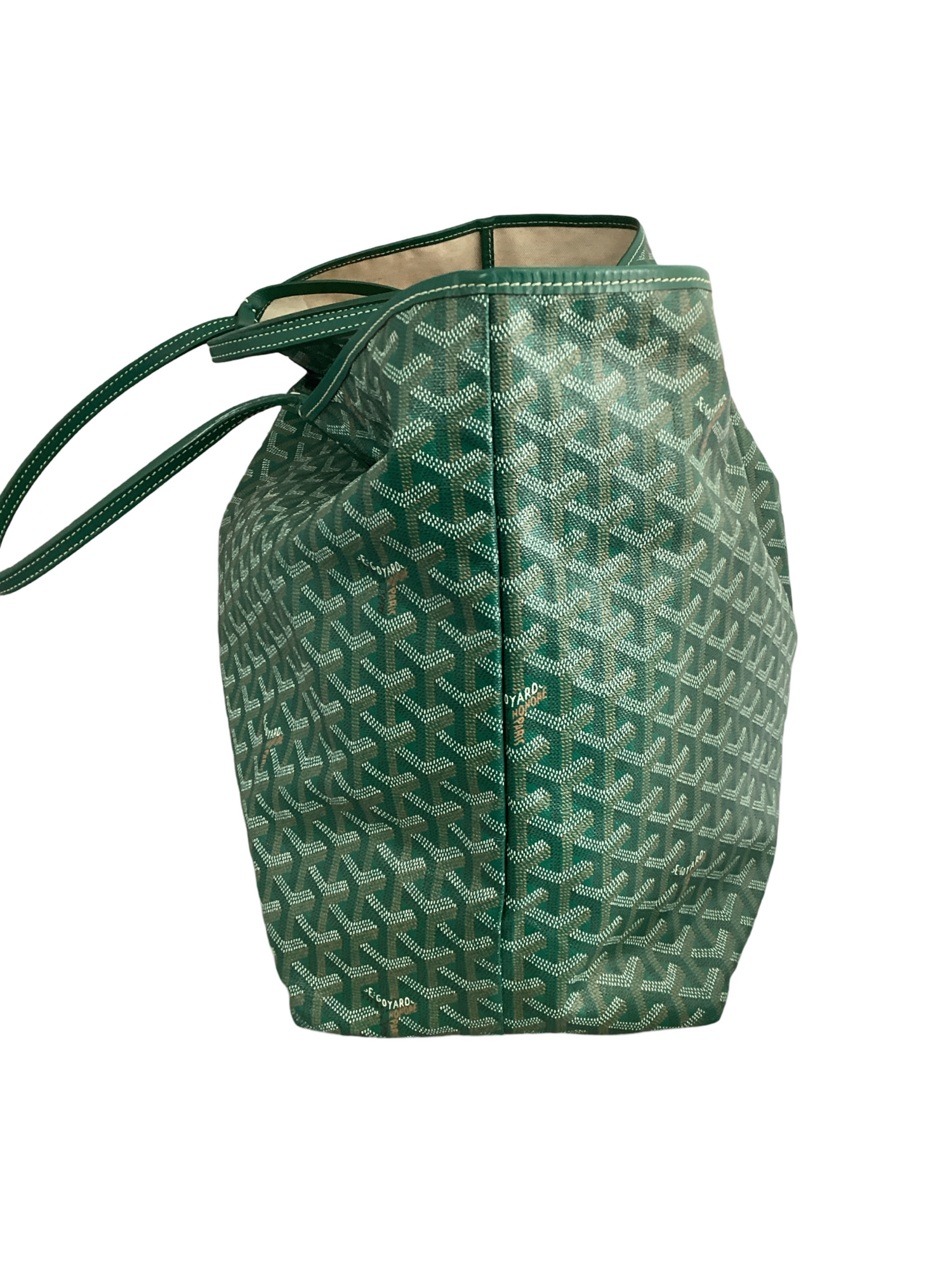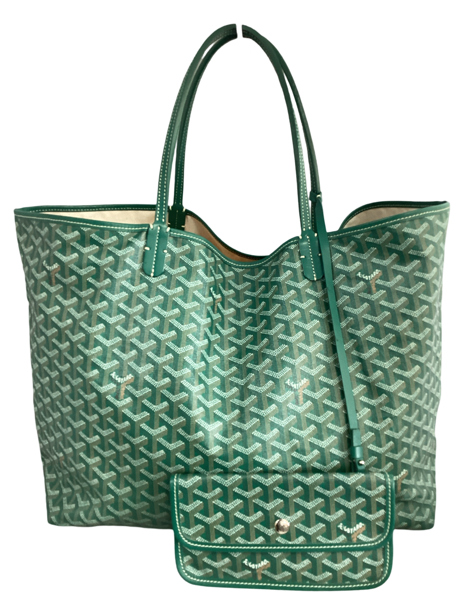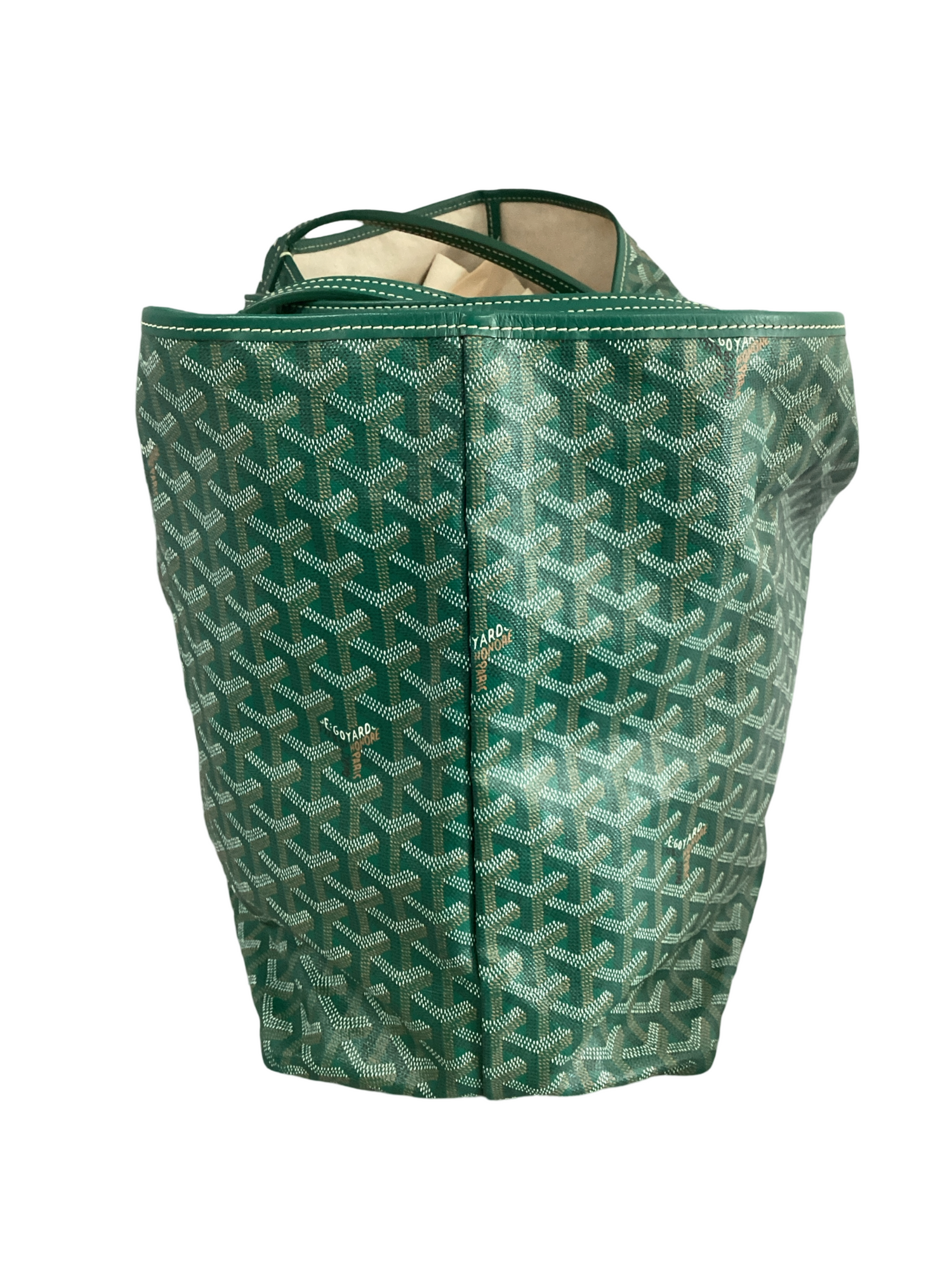 Goyard green Saint Louis GM Tote with silver-tone hardware, dual top handles. Interior features include tan canvas lining, detachable pouch.