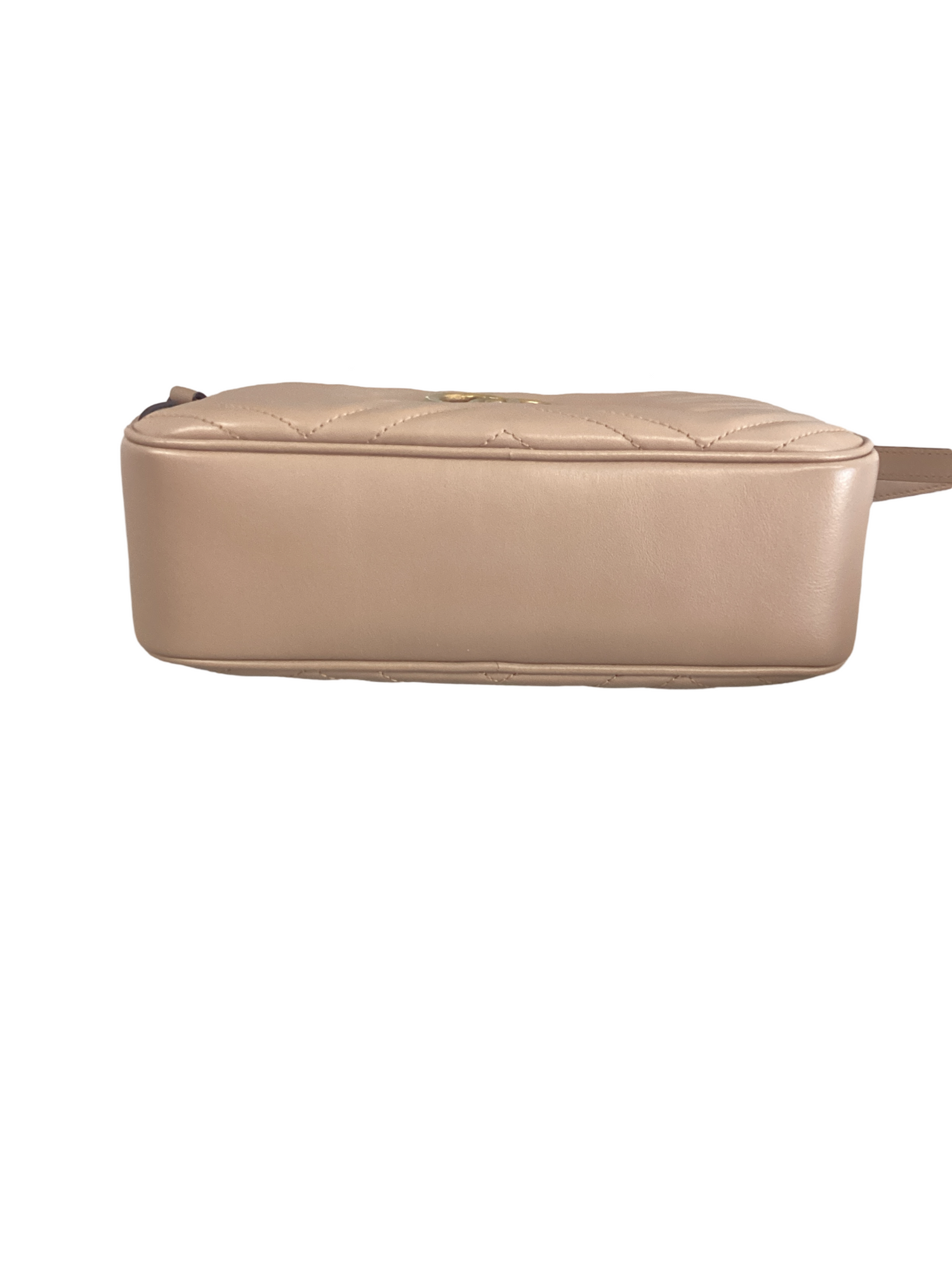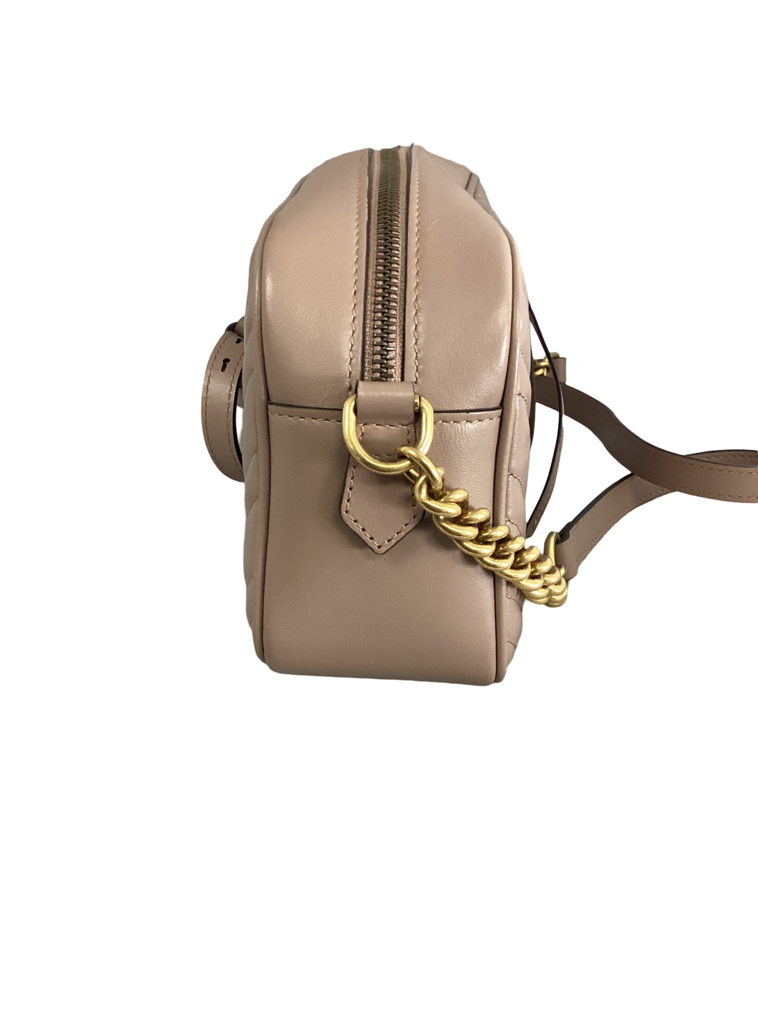 Gucci Beige GG Marmont Matelasse Crossbody with aged gold-toned hardware, a smooth and supple calfskin leather in beige, adjustable leather and chain strap, and a front GG logo and a zipper top closure. Interior features a beige fabric interior and a leather slip pocket.