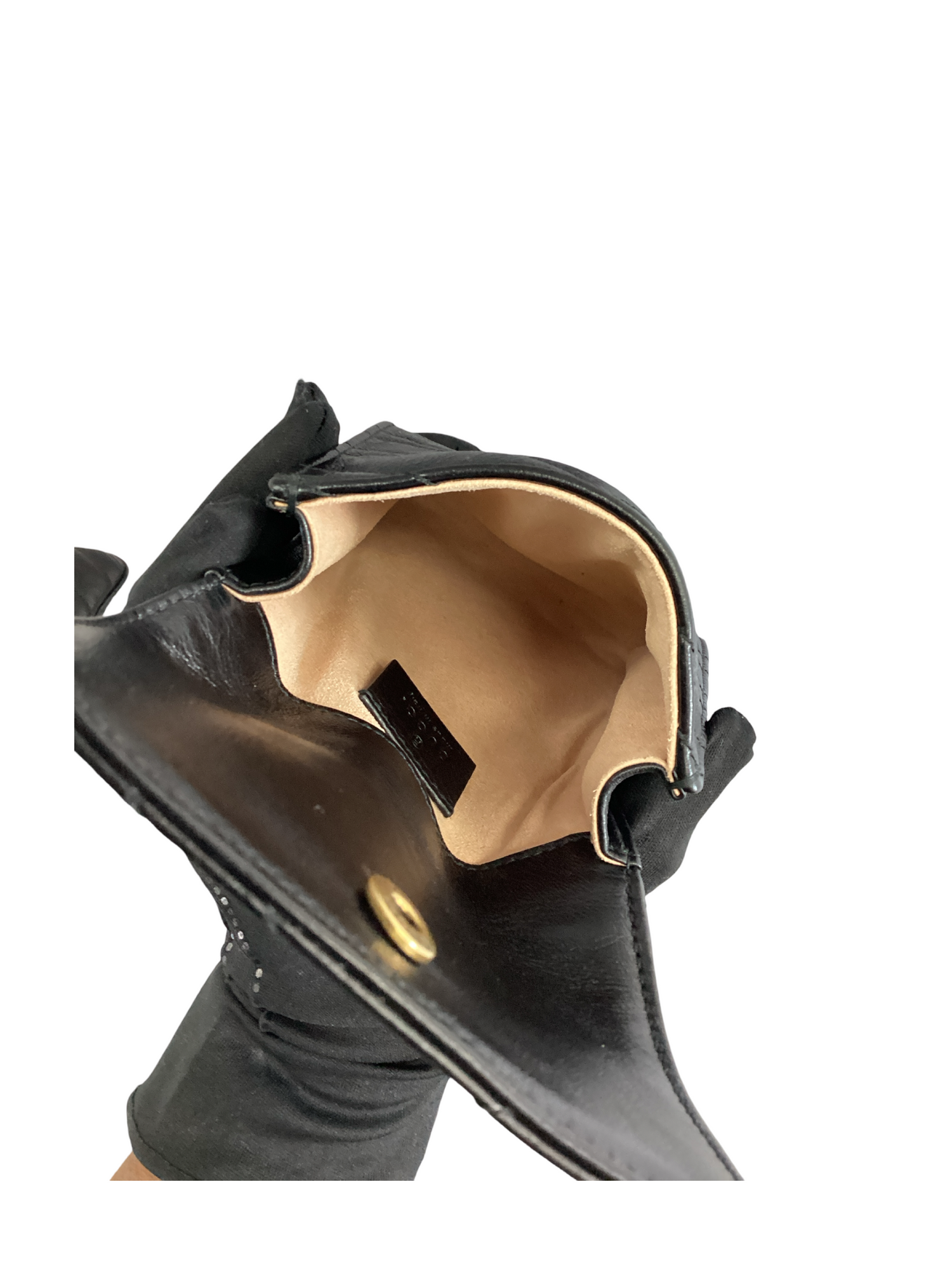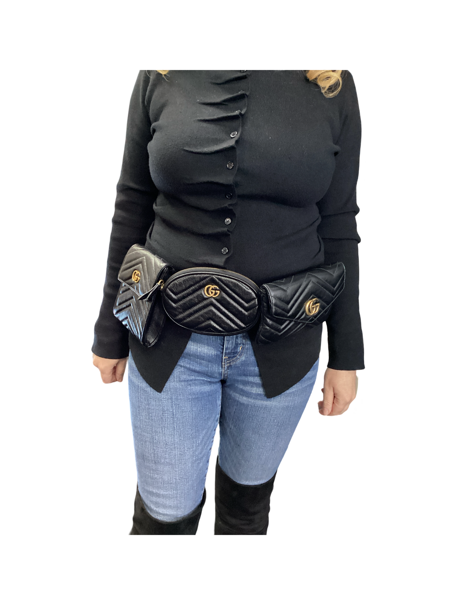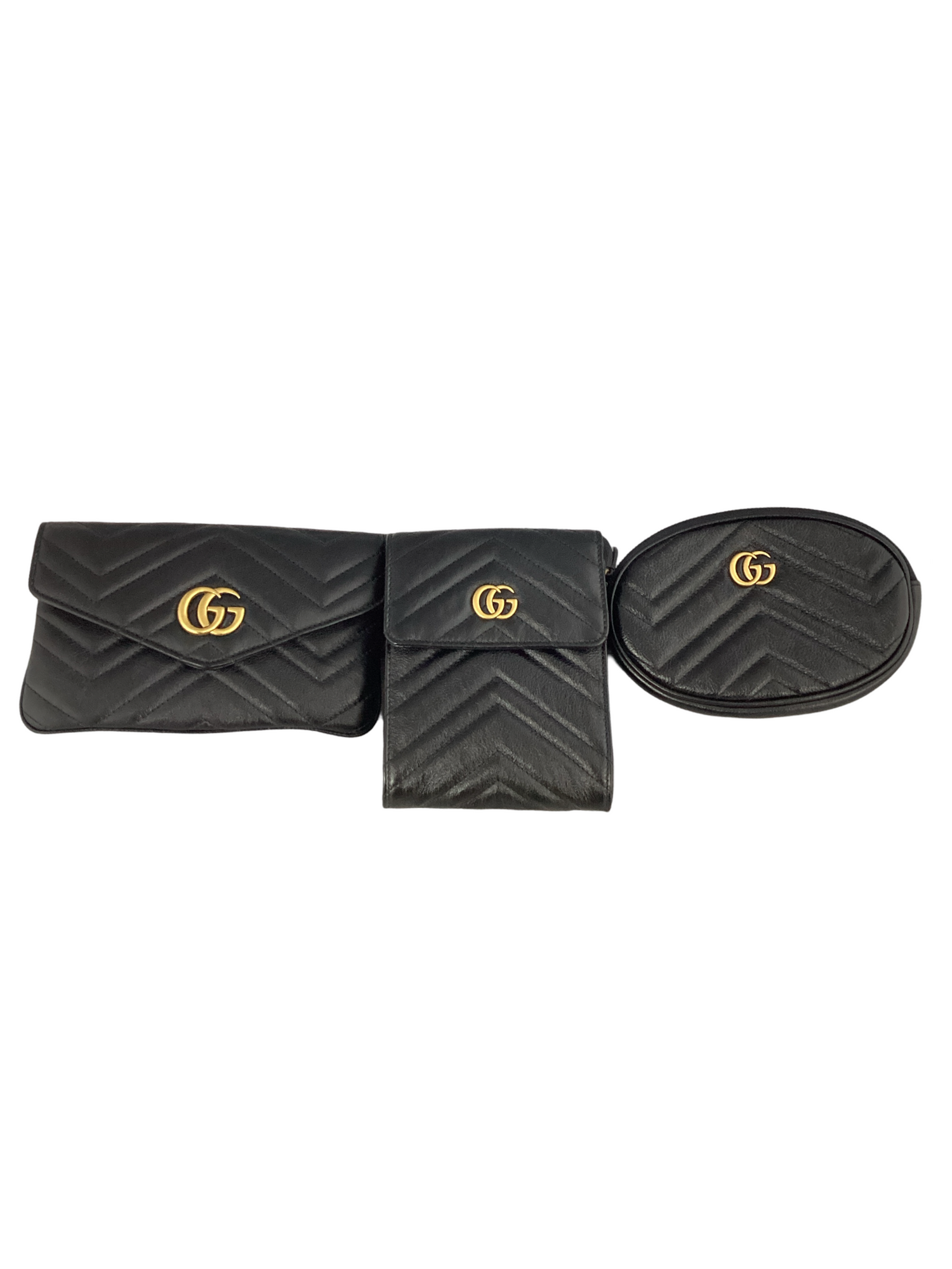 Gucci Black Double G Marmont Belt Bag Trio with gold-tone hardware, adjustable waist strap, 3 detachable pouches, 1 zipper closure, 2 magnetic snap closures. Interior features include tan suede fabric lining, 1 pouch with 1 slip pocket.