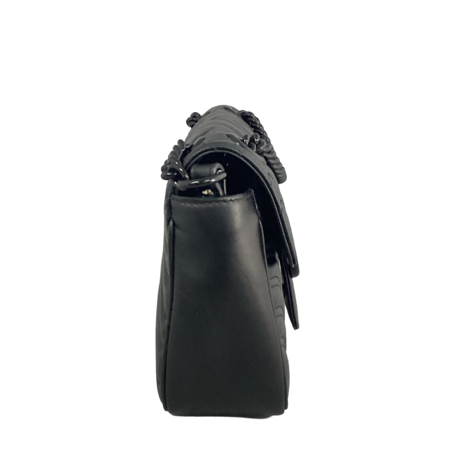 Gucci-Black GG Marmont Shoulder Bag Small with black-tone hardware, crafted of smooth and supple calfskin leather in black, a leather shoulder pad and a Gucci GG logo on the front and push lock closure. Interior features a black microfiber interior with a zipper pocket.
