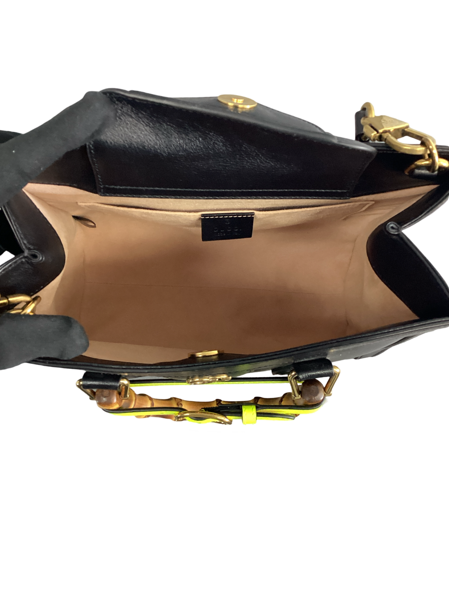 Gucci Black Leather Diana Bamboo Small Tote Bag, with gold-toned hardware, crafted of black calfskin leather, a looping bamboo top handles, an optional shoulder strap and a magnetic snap closure. Interior features a beige fabric suede interior with a patch pocket.