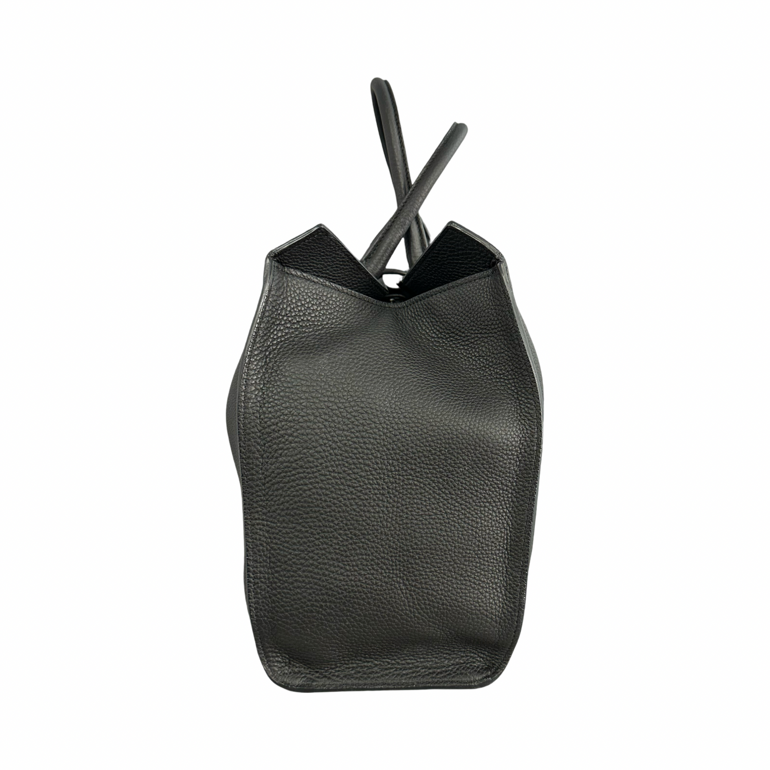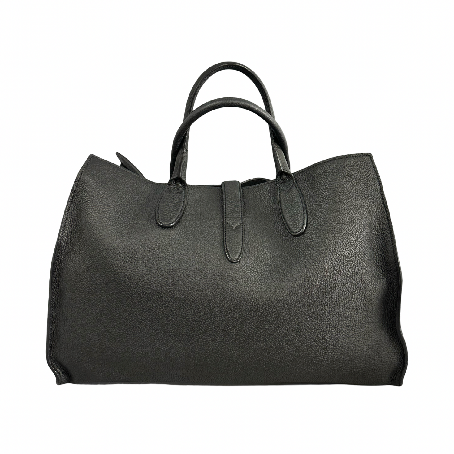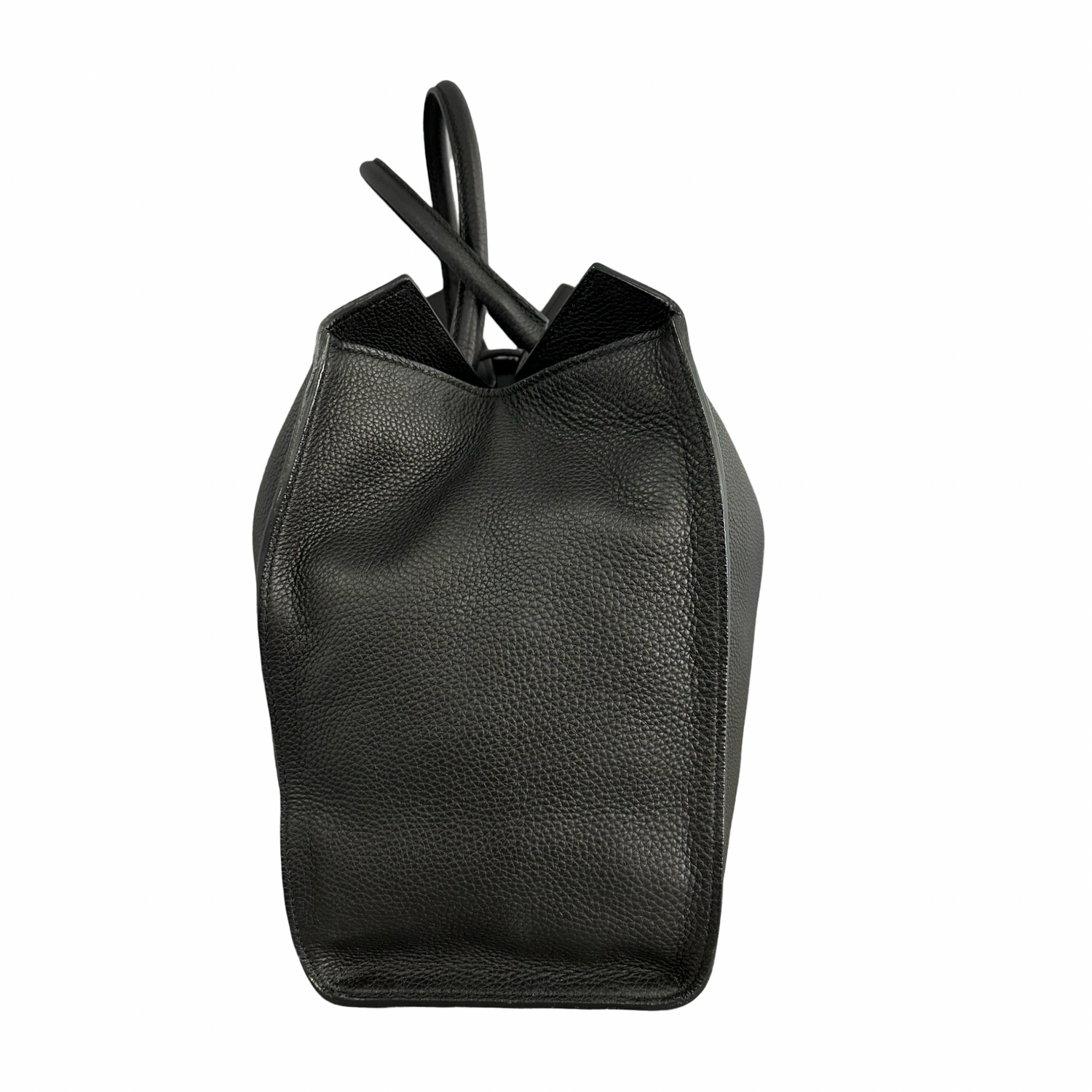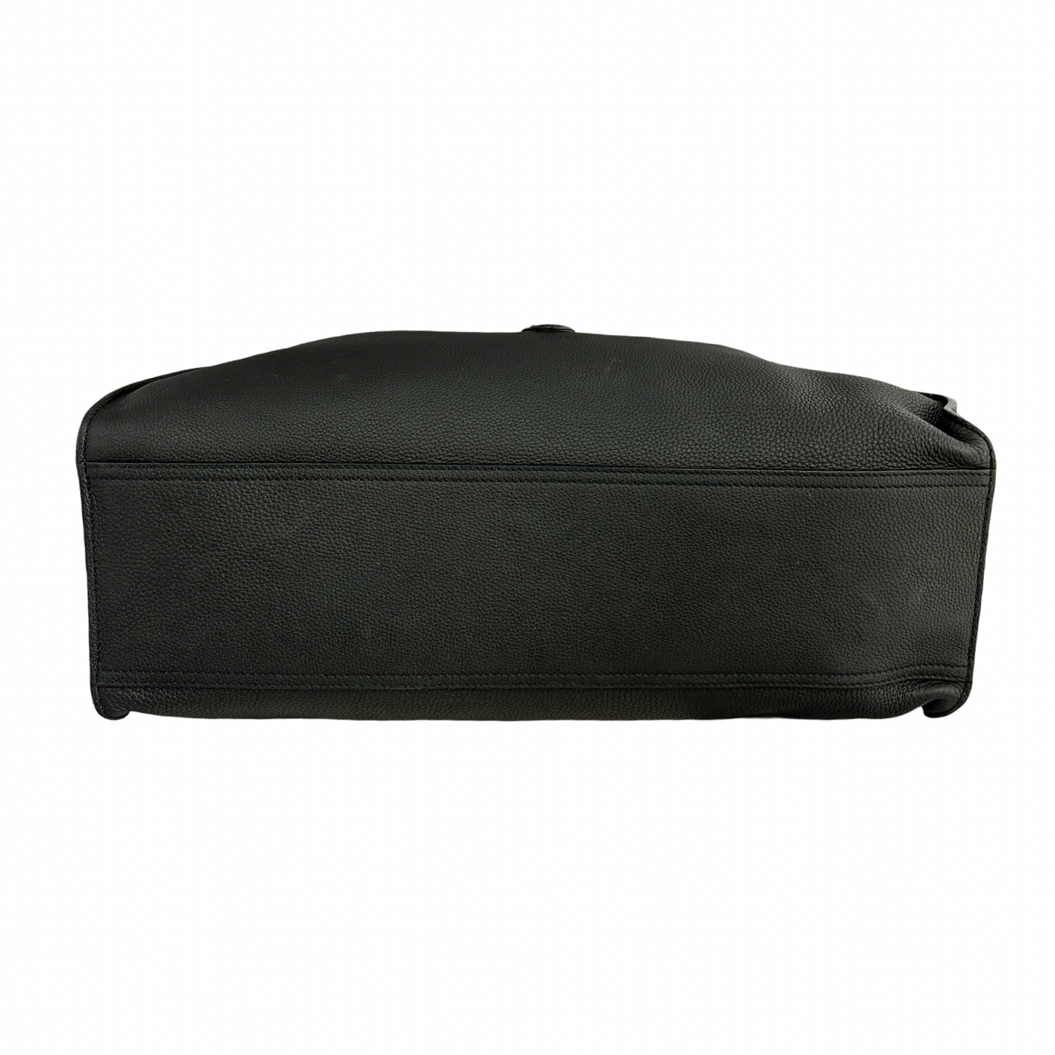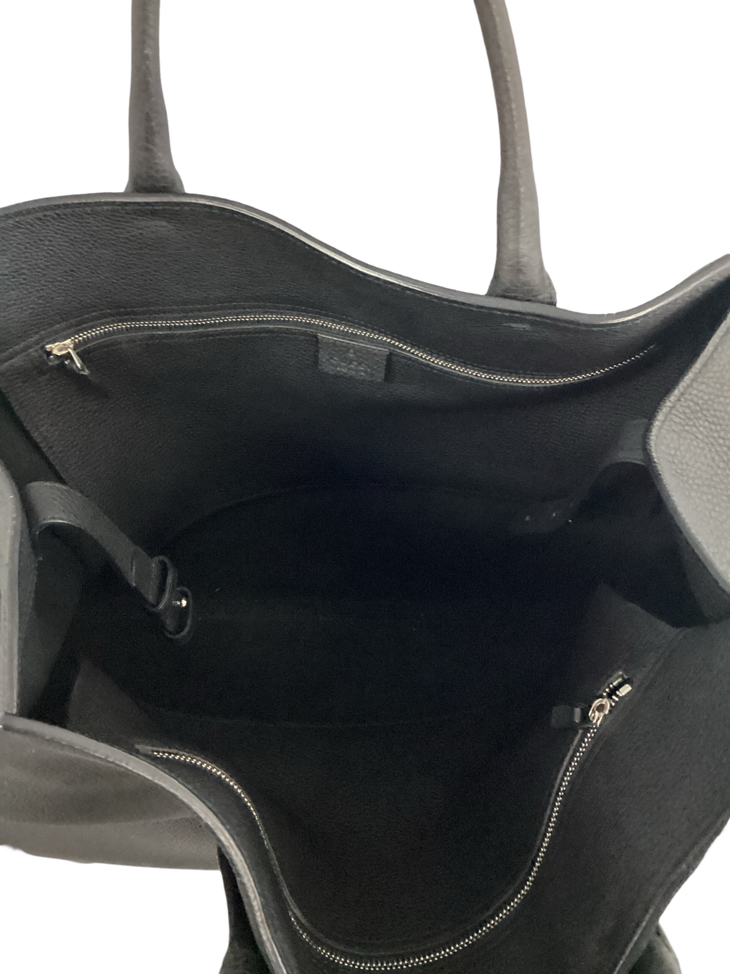 Gucci black leather Jackie Tote with silver-tone hardware, dual rolled top handles, turn lock closure. Interior features include black leather lining, 2 zipper pockets.