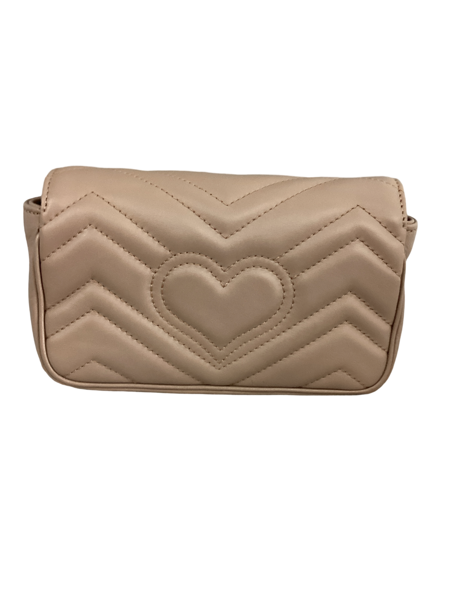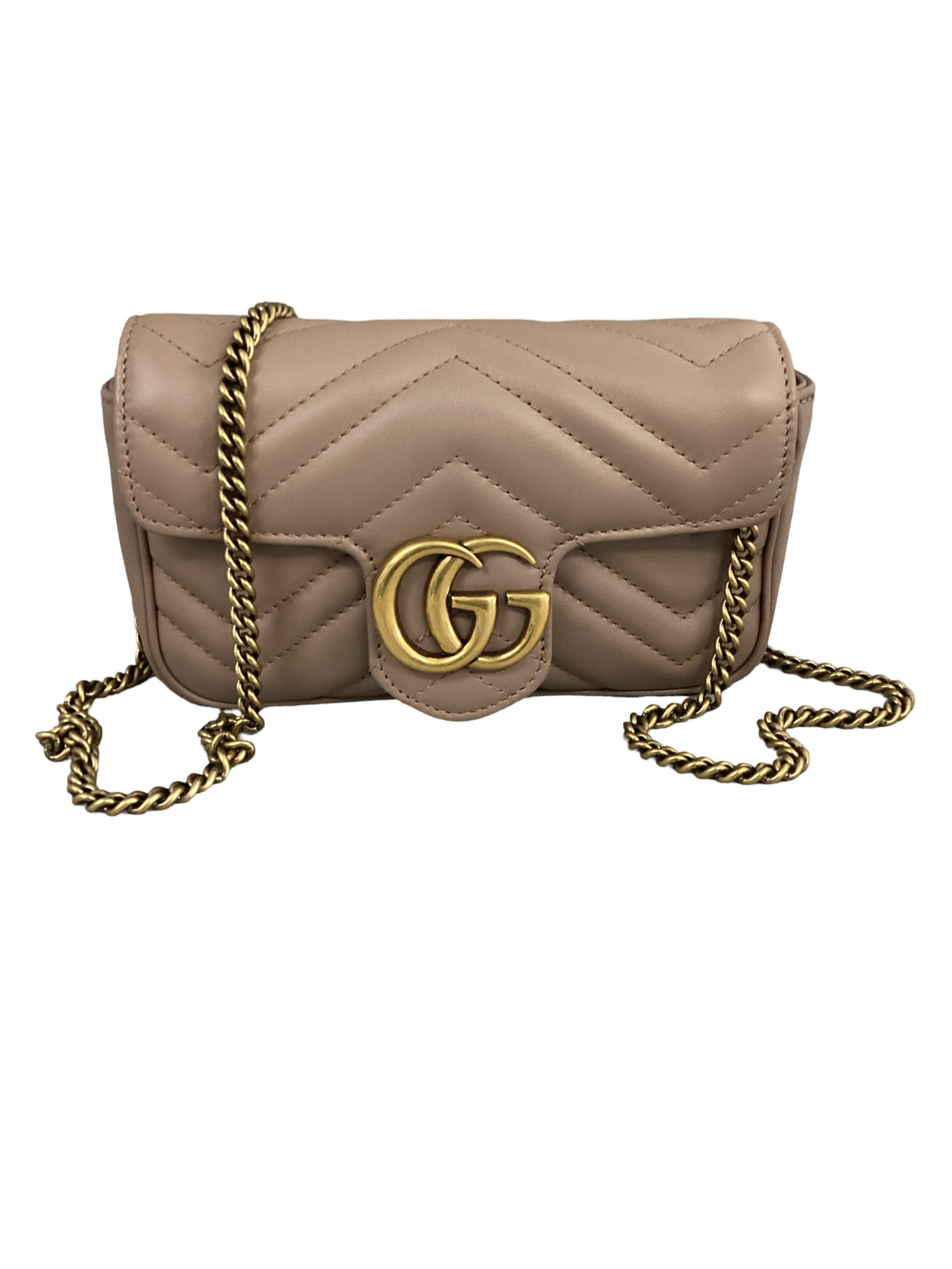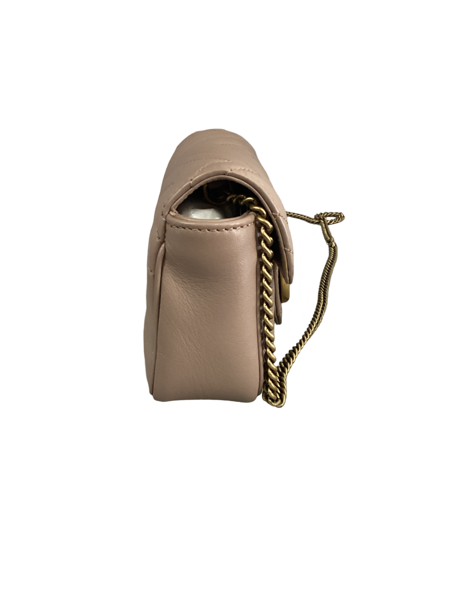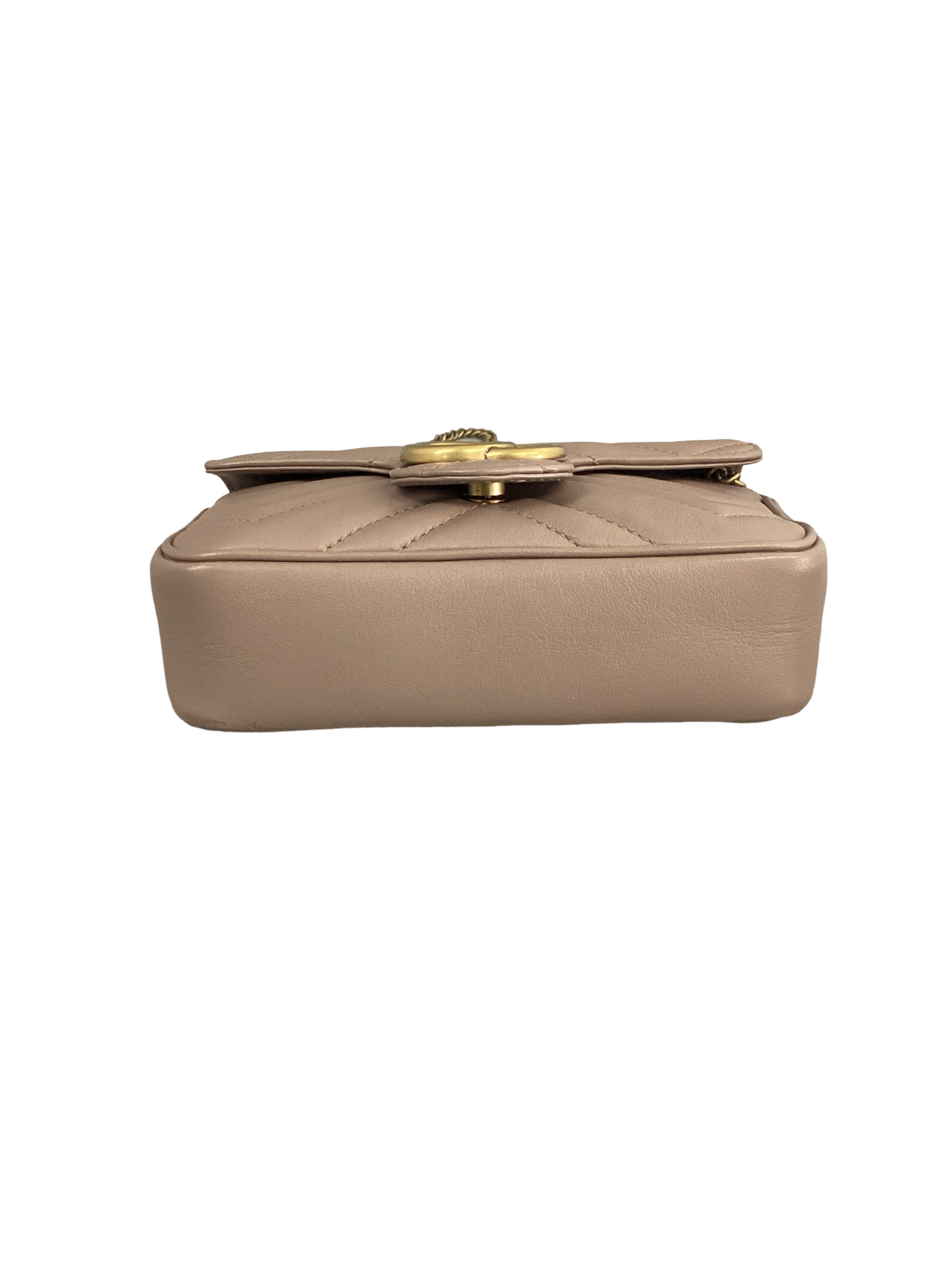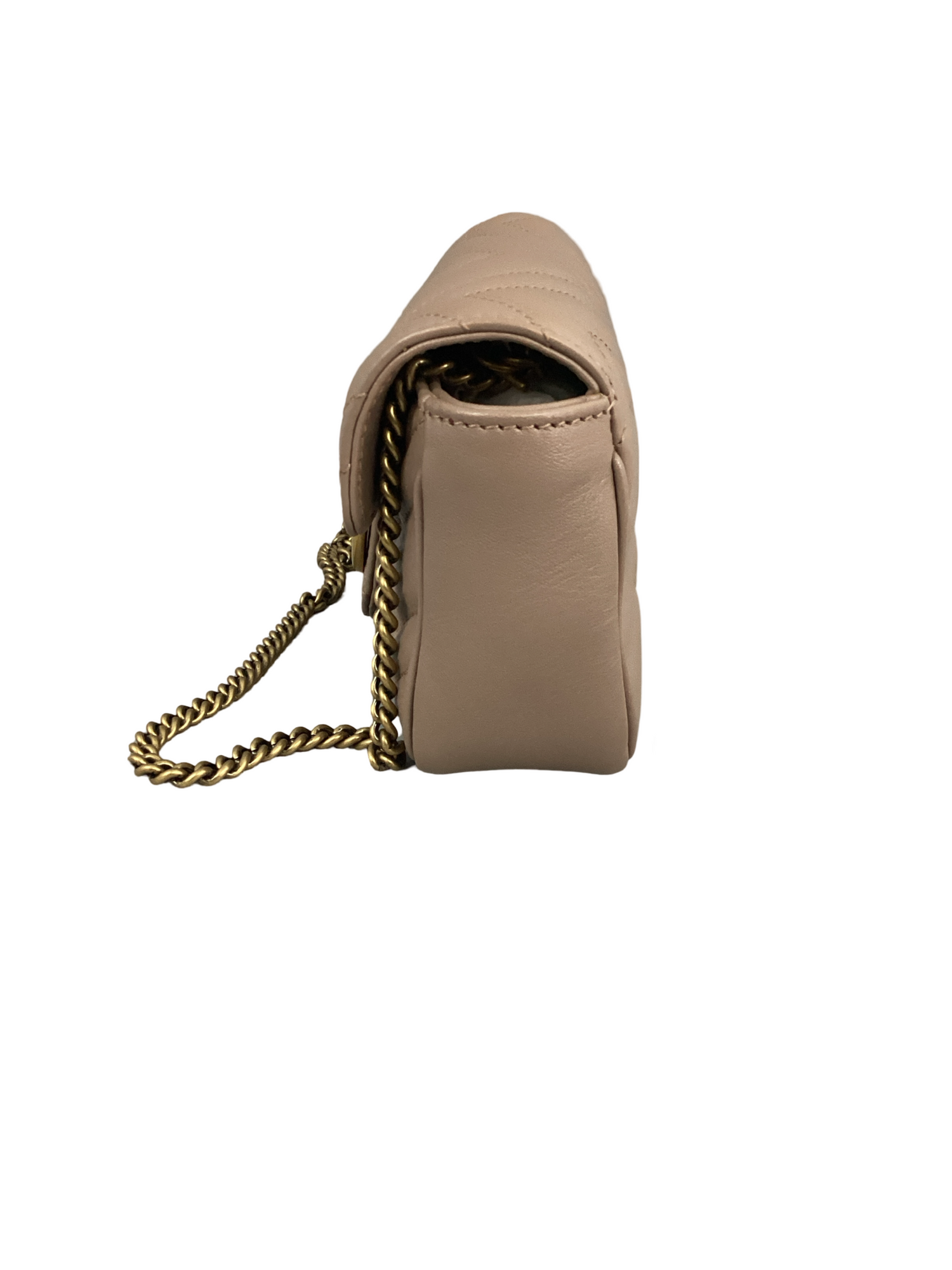 Gucci Double GG Marmont Shoulder Bag with gold-tone hardware, beige matelassé chevron leather, chain strap, push lock closure. Interior features attached key ring, leather and suede fabric lining.