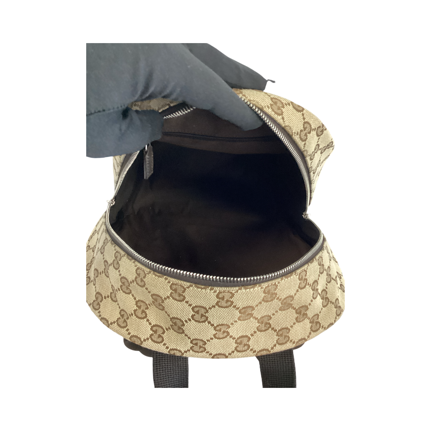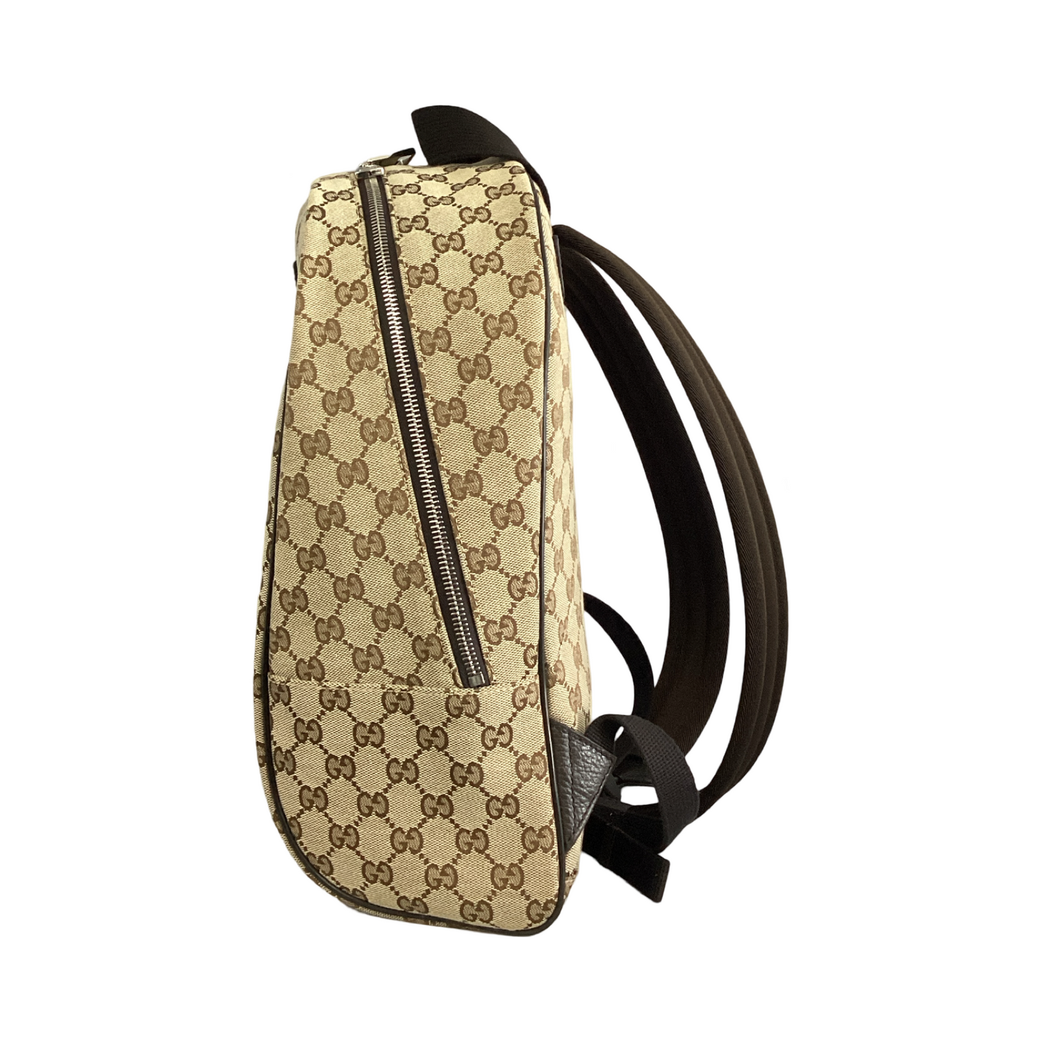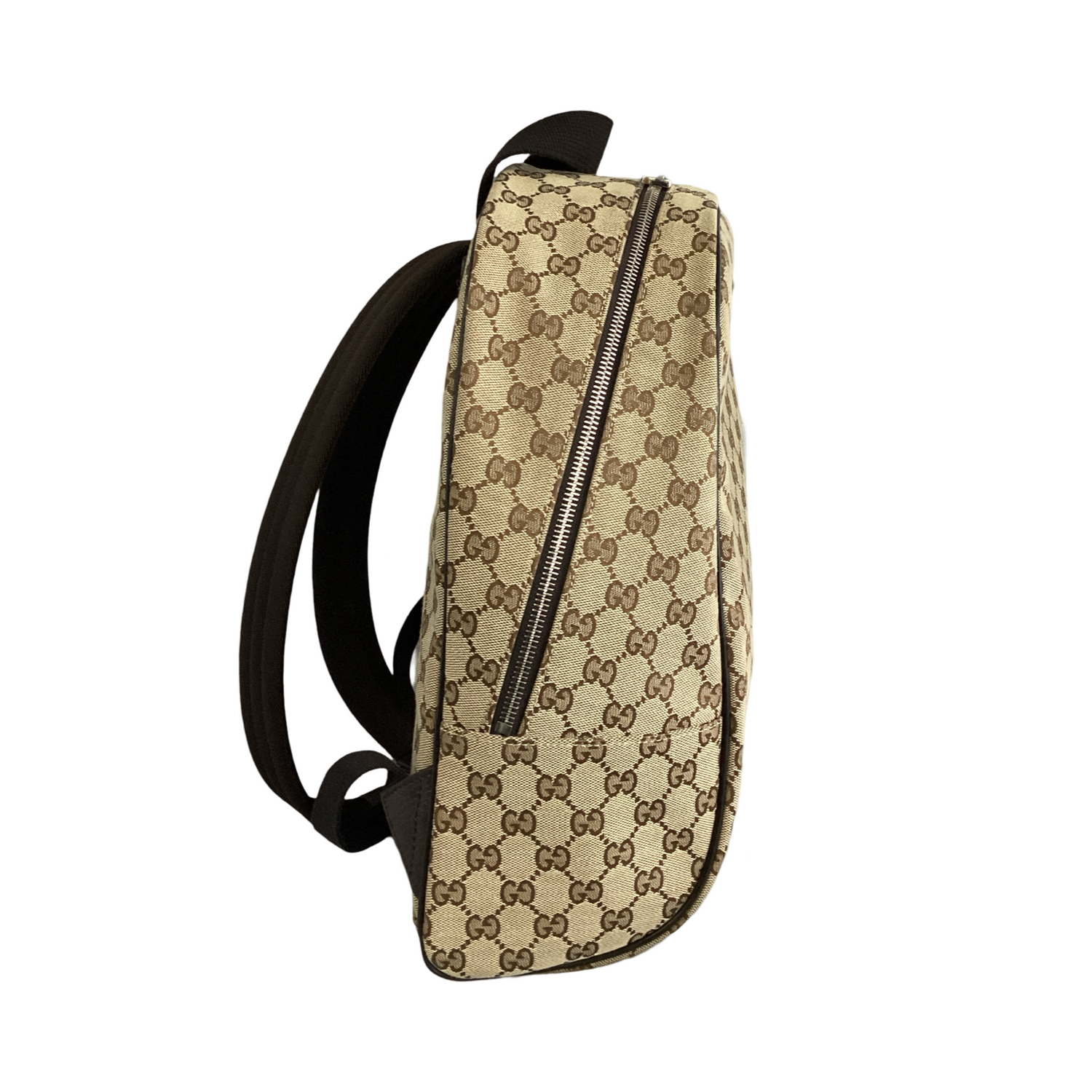 Gucci-GG Canvas Backpack with silver-toned hardware, a neutrals GG canvas, leather trim, flat handle & dual adjustable shoulder straps, dual top zipper closure. Interior features canvas lining and dual interior pockets.