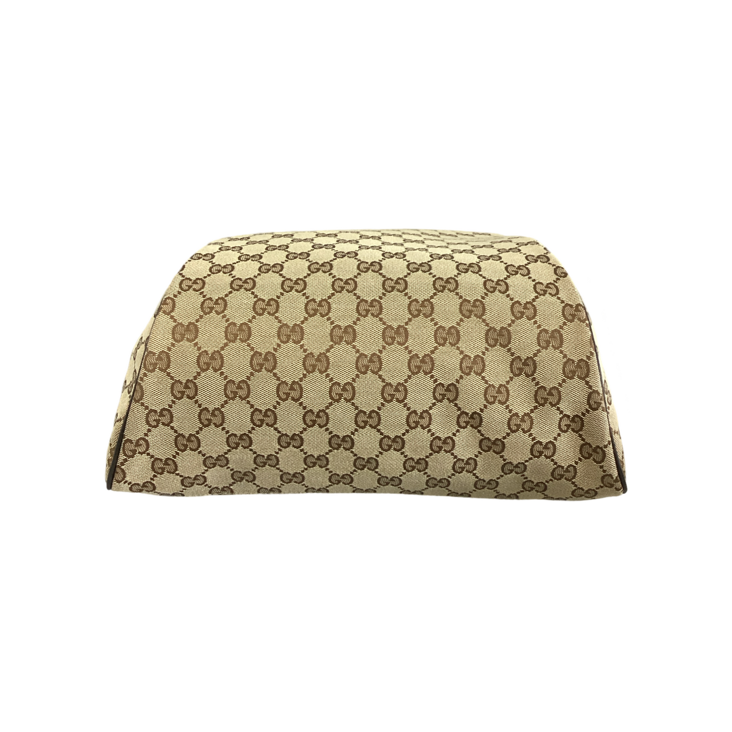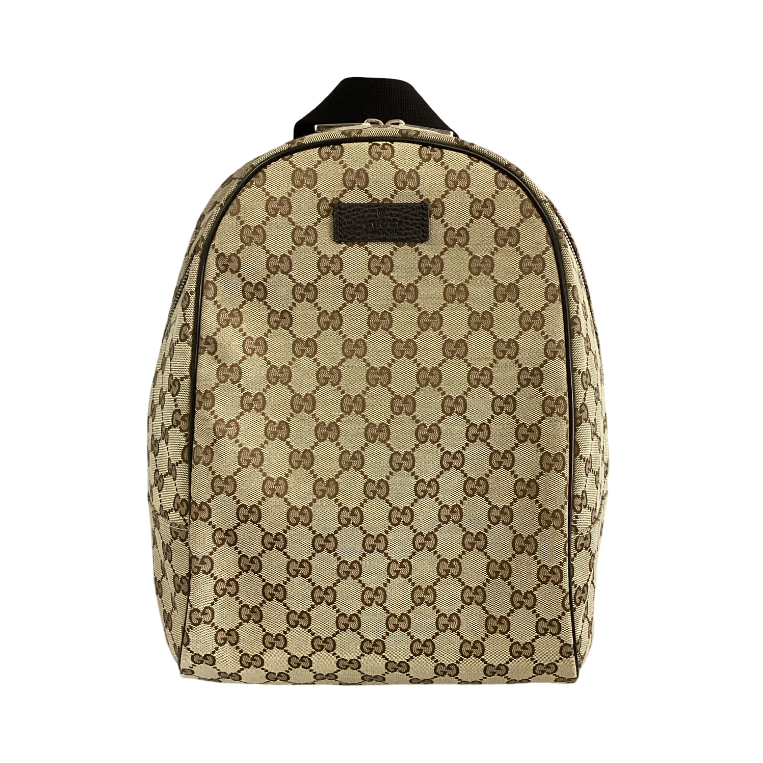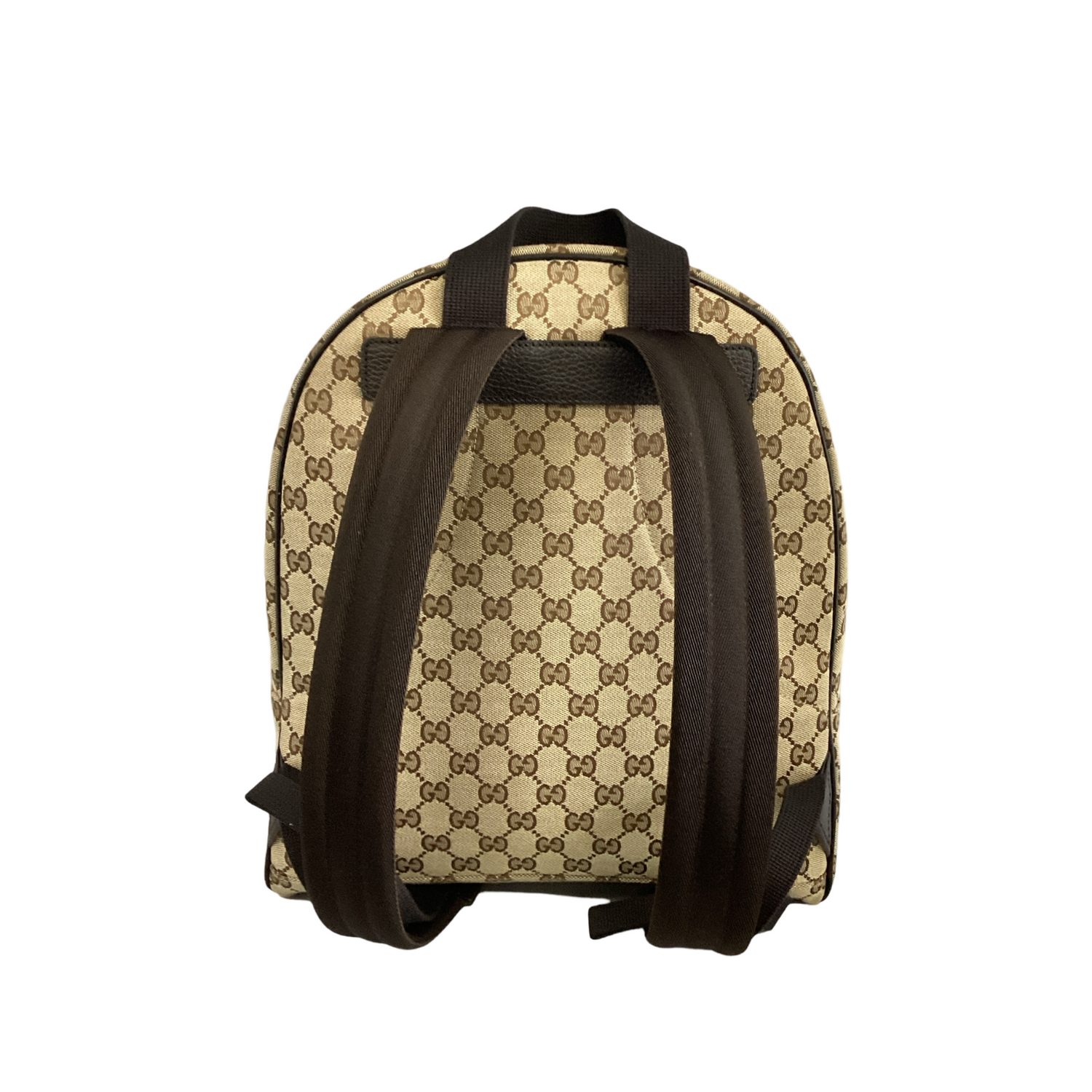 Gucci-GG Canvas Backpack with silver-toned hardware, a neutrals GG canvas, leather trim, flat handle & dual adjustable shoulder straps, dual top zipper closure. Interior features canvas lining and dual interior pockets.