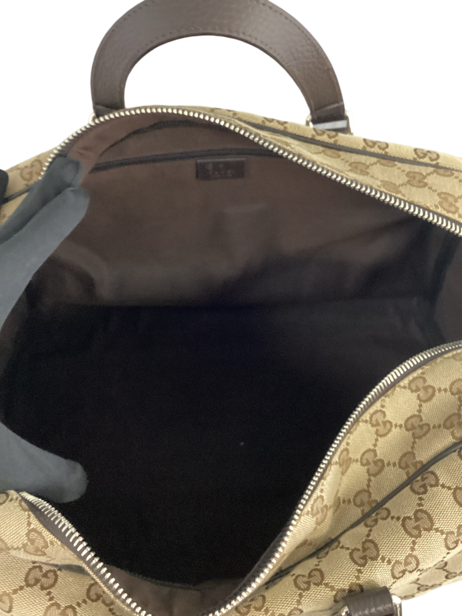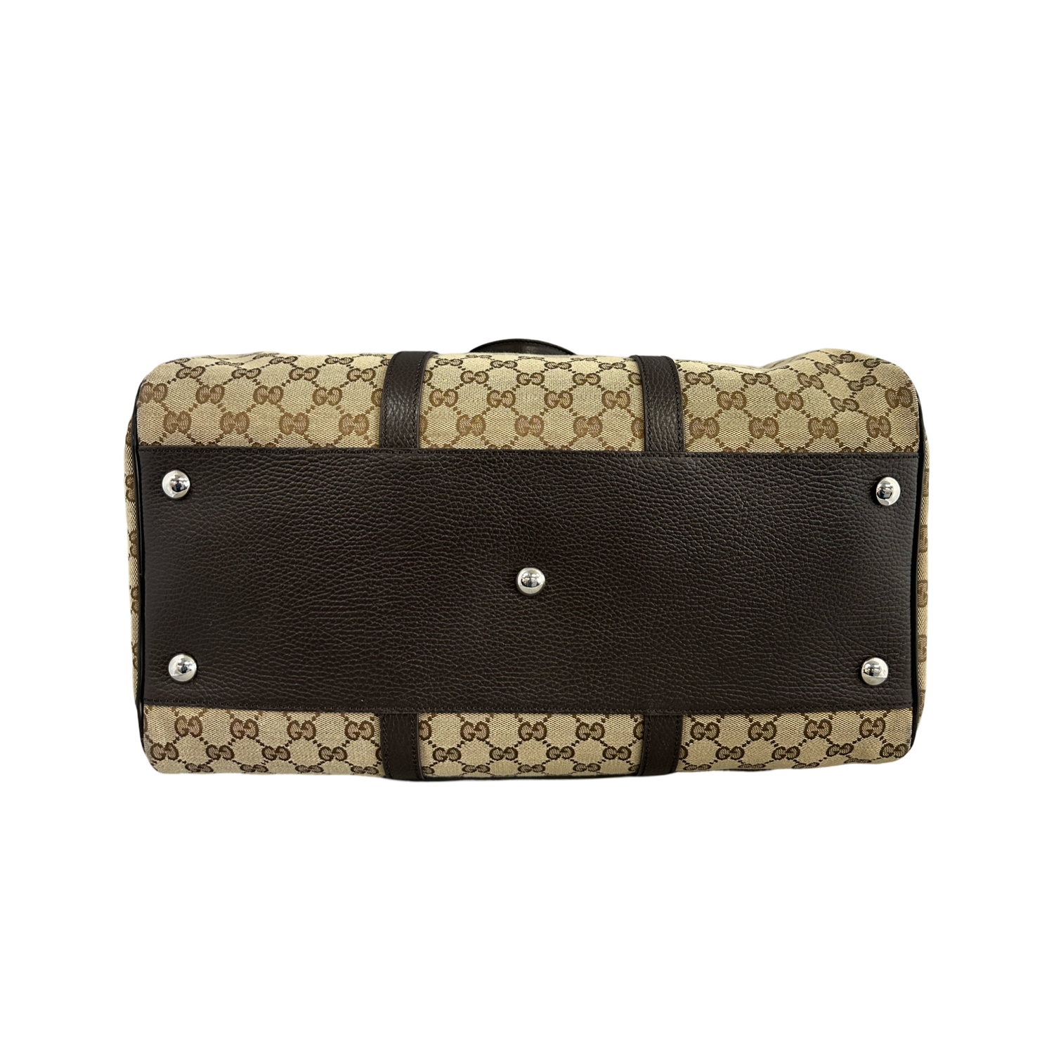 Gucci GG Canvas Boston Duffle Bag with silver-tone hardware, dual top handles, single detachable adjustable shoulder strap, zipper closure. Interior features include brown canvas lining, 1 zipper pocket, 1 slip pocket.