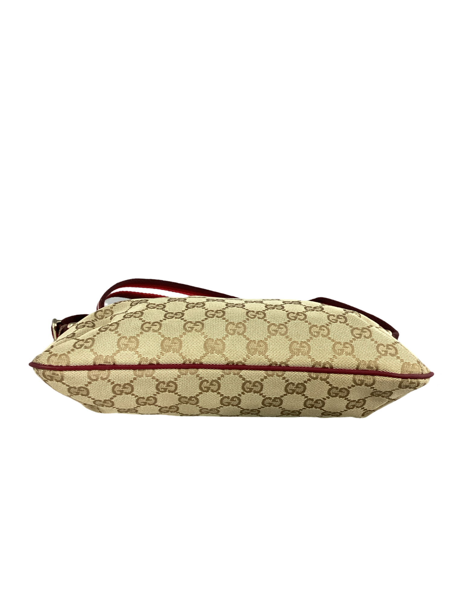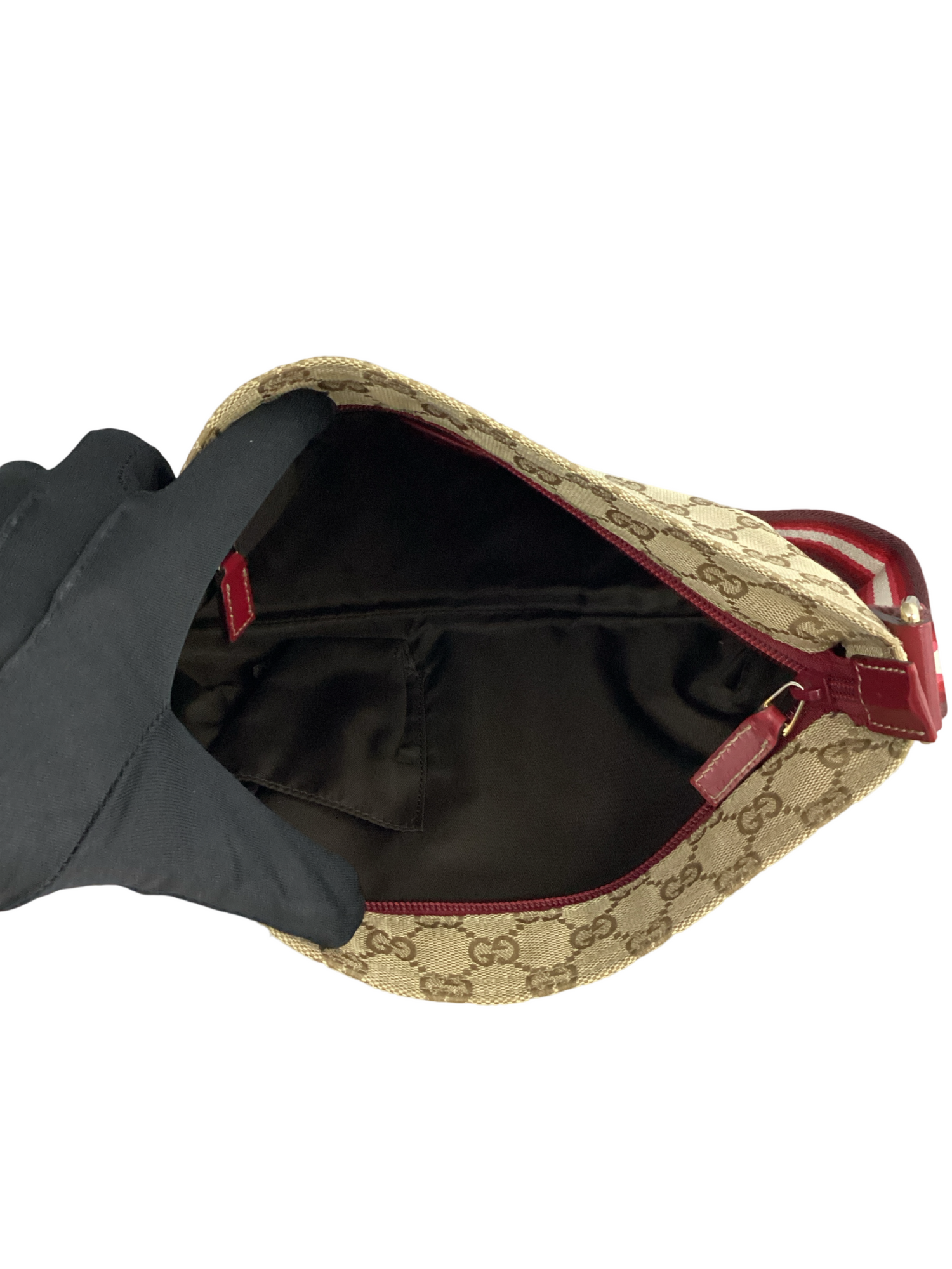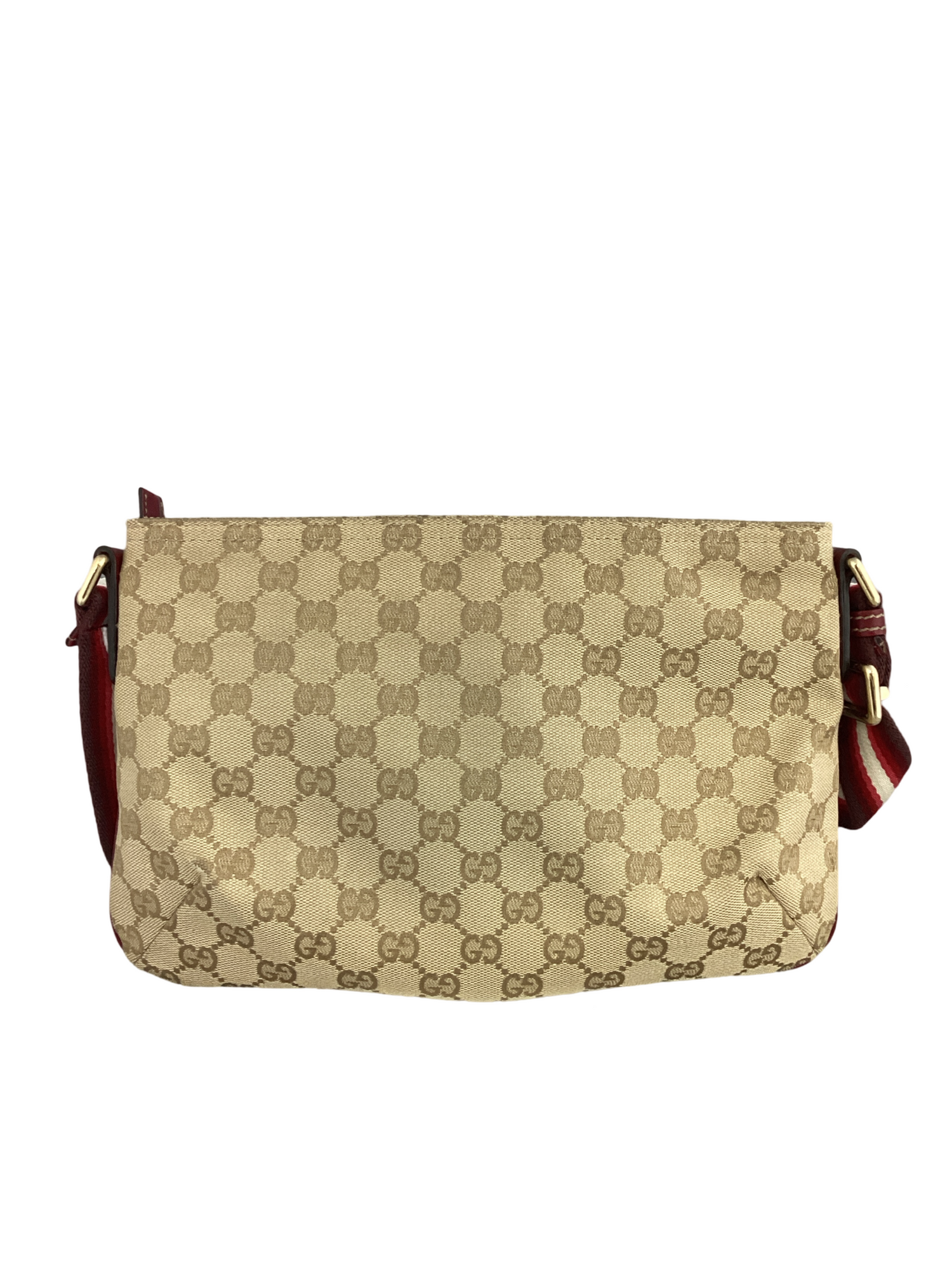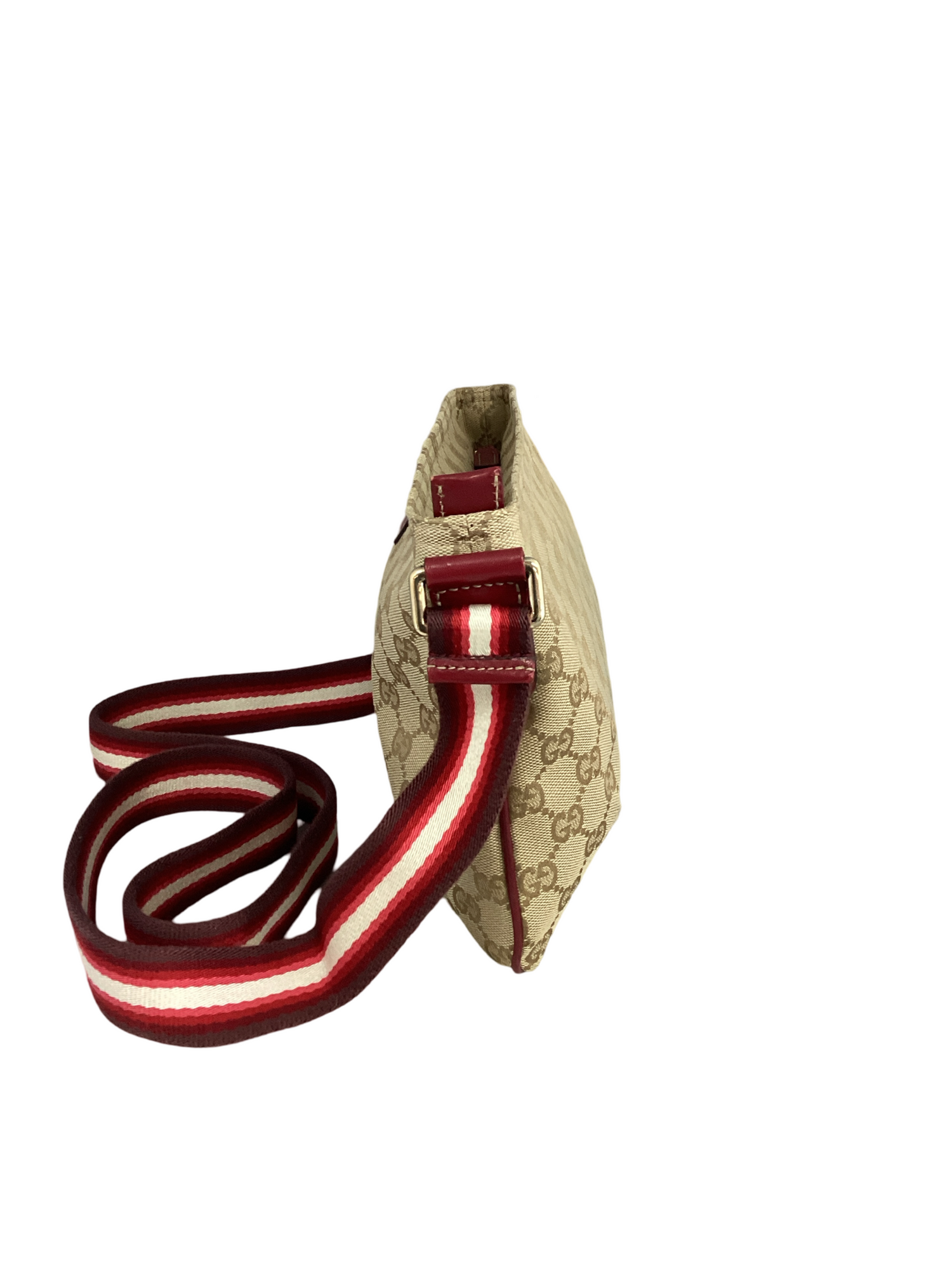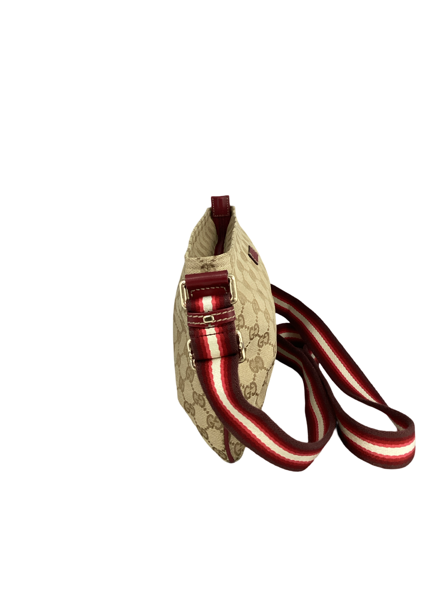 Gucci GG Canvas Web Crossbody with silver-tone hardware, red, white and brown Gucci Web canvas shoulder strap, embossed logo leather accent at front face, chocolate woven lining and top zipper closure. Interior features a brown nylon fabric interior, single interior zip pocket and a slip pocket.