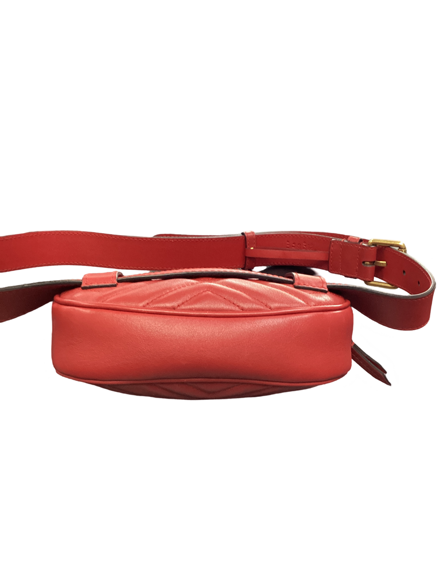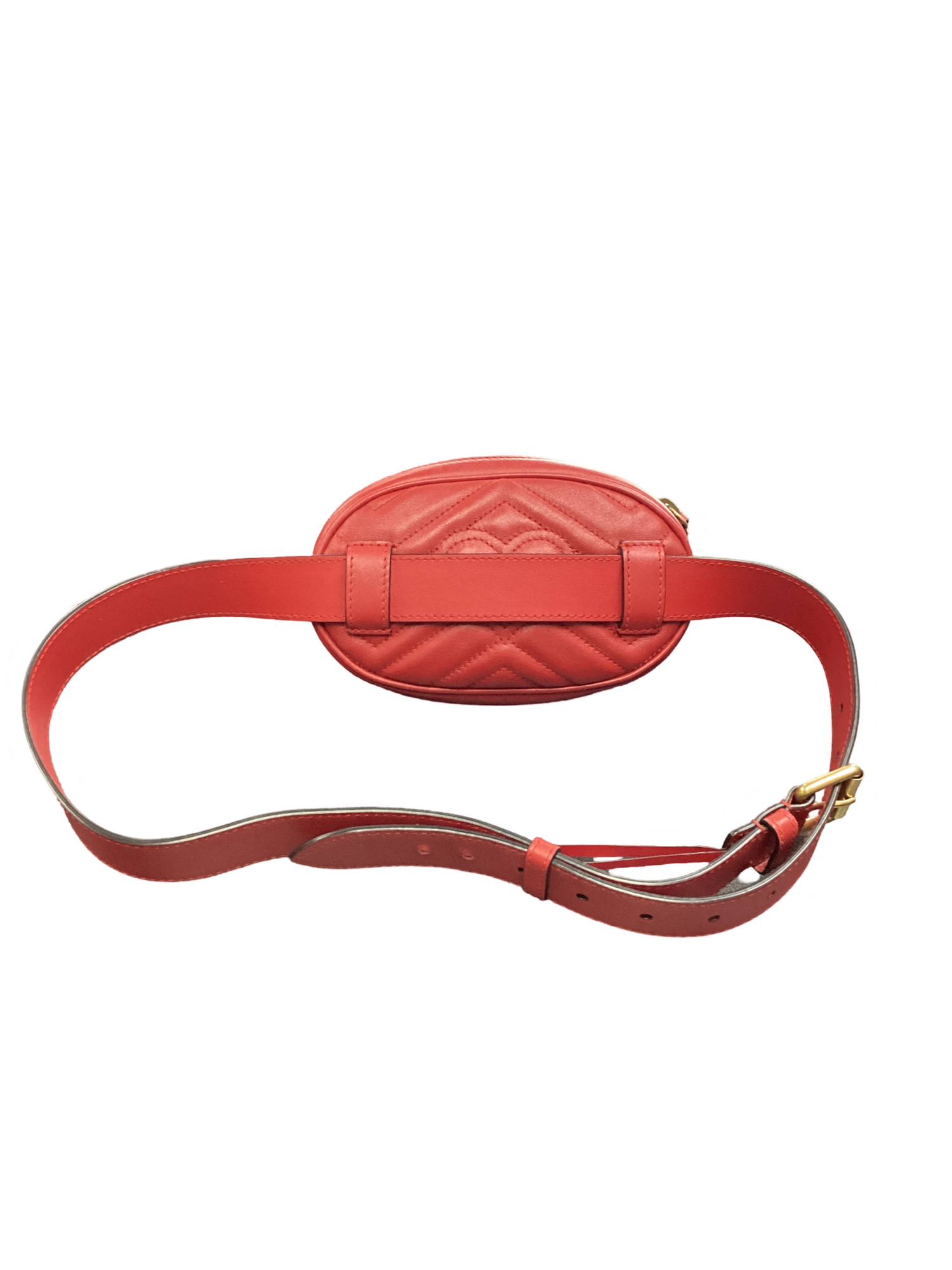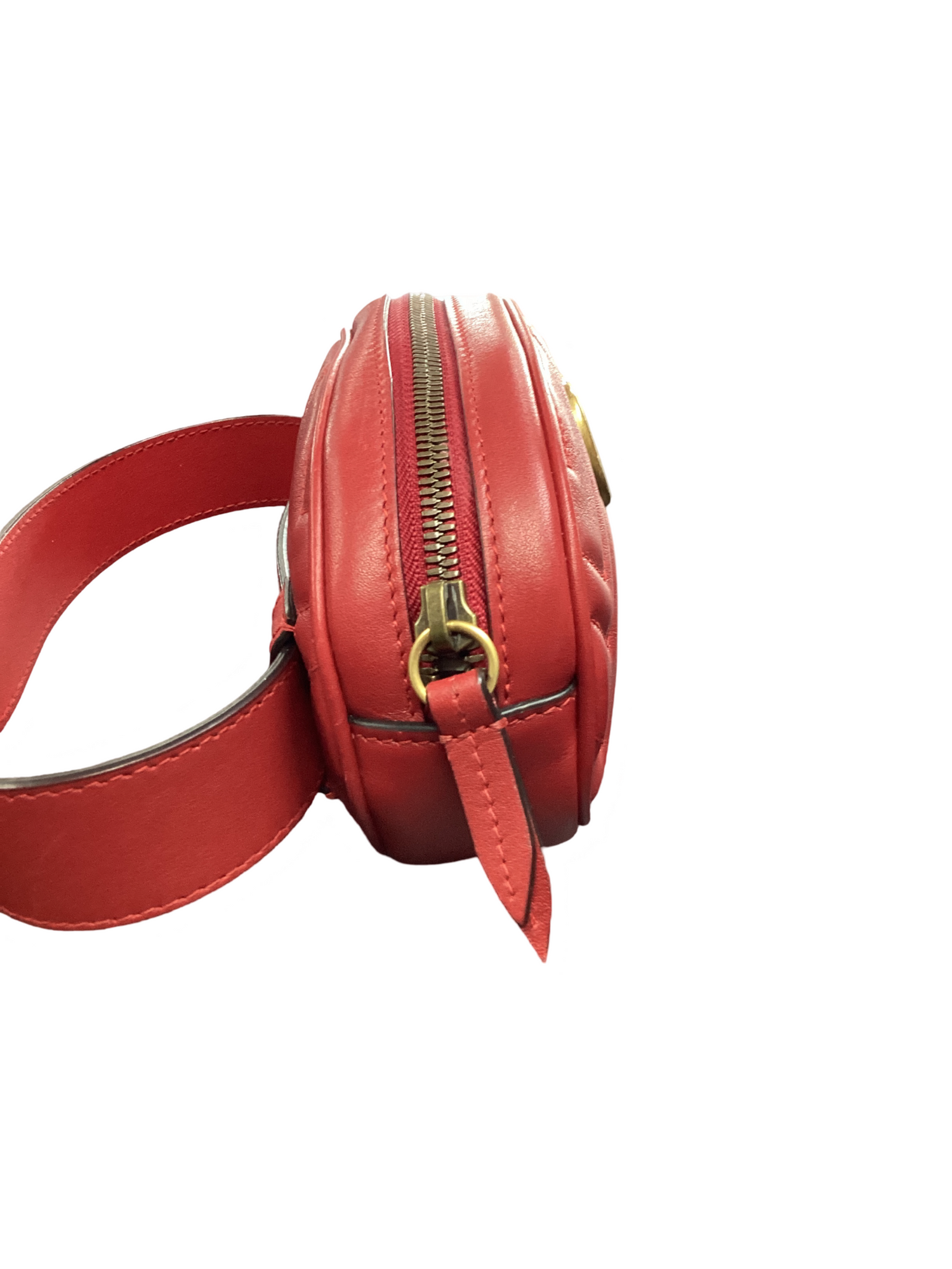 Gucci GG Marmont Matelasse Belt Bag with gold-tone hardware, red leather, adjustable waist strap and zip top closure. Interior features suede lining & single interior pocket.