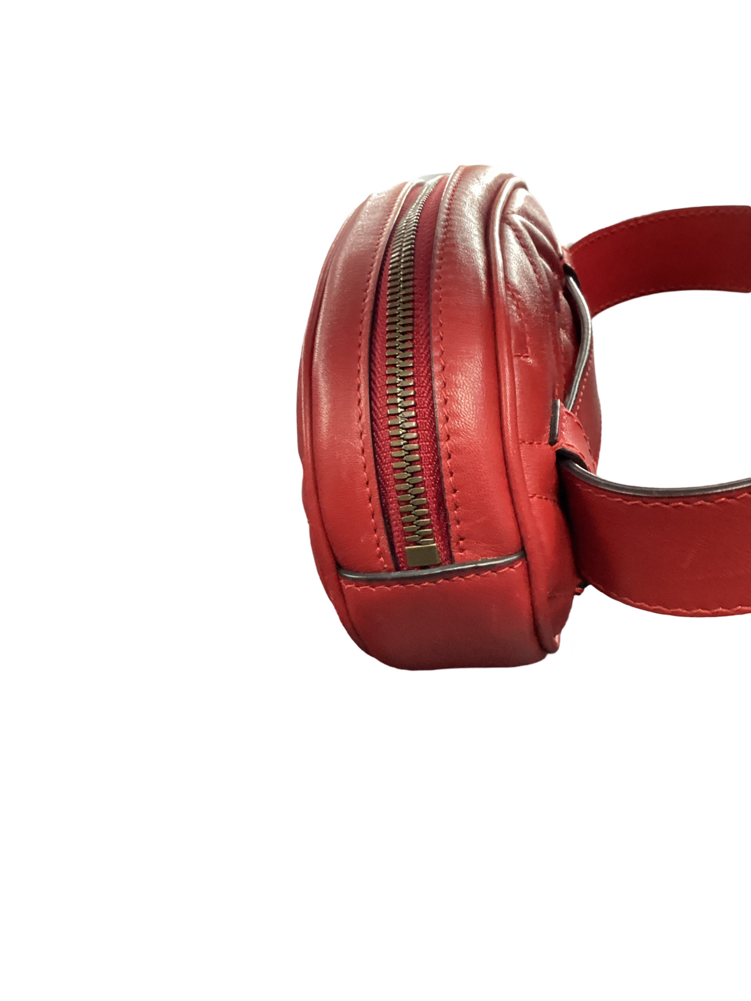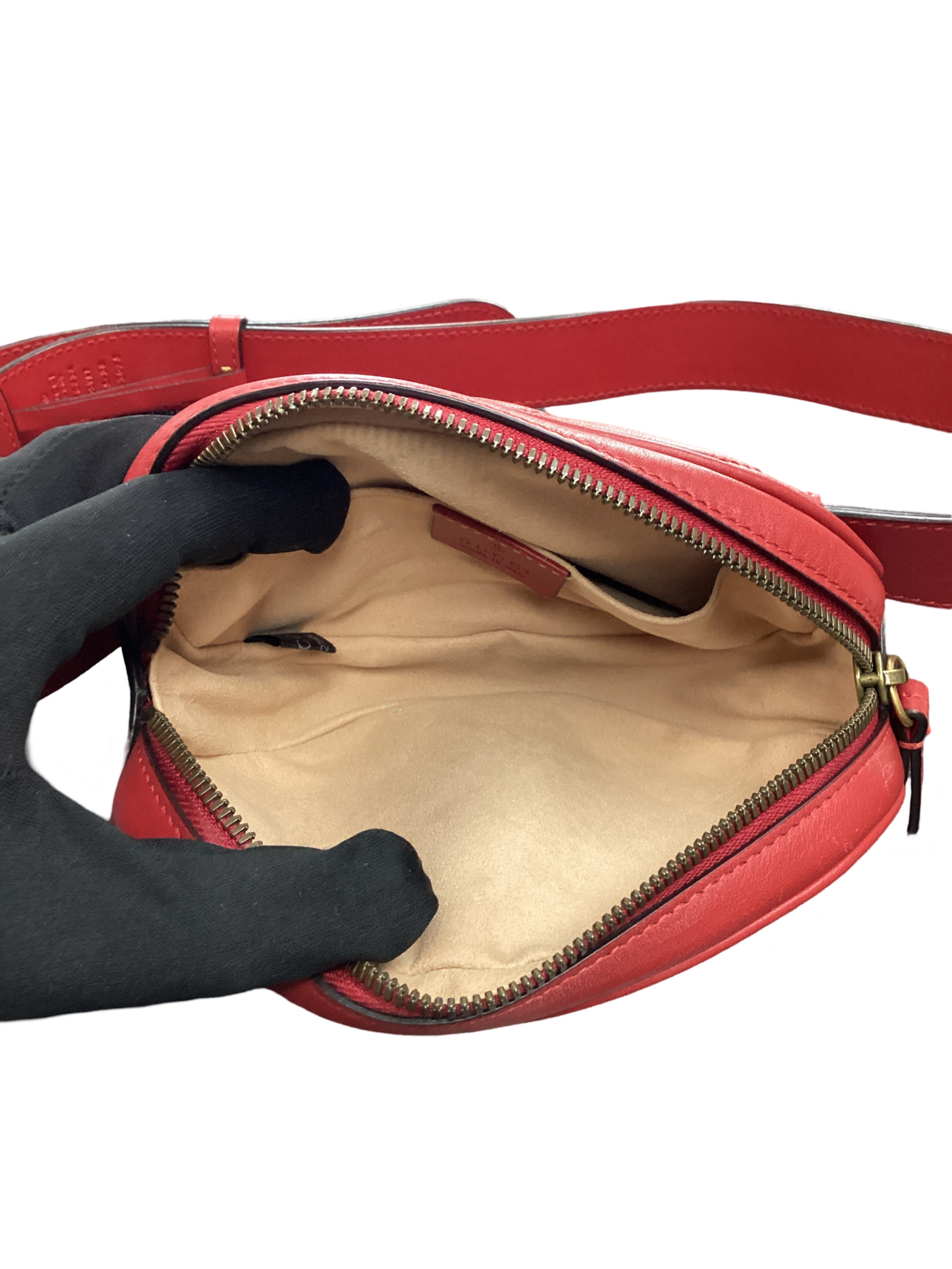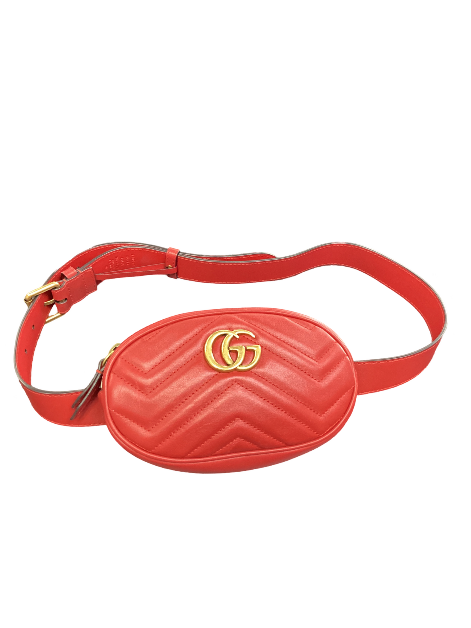 Gucci GG Marmont Matelasse Belt Bag with gold-tone hardware, red leather, adjustable waist strap and zip top closure. Interior features suede lining & single interior pocket.