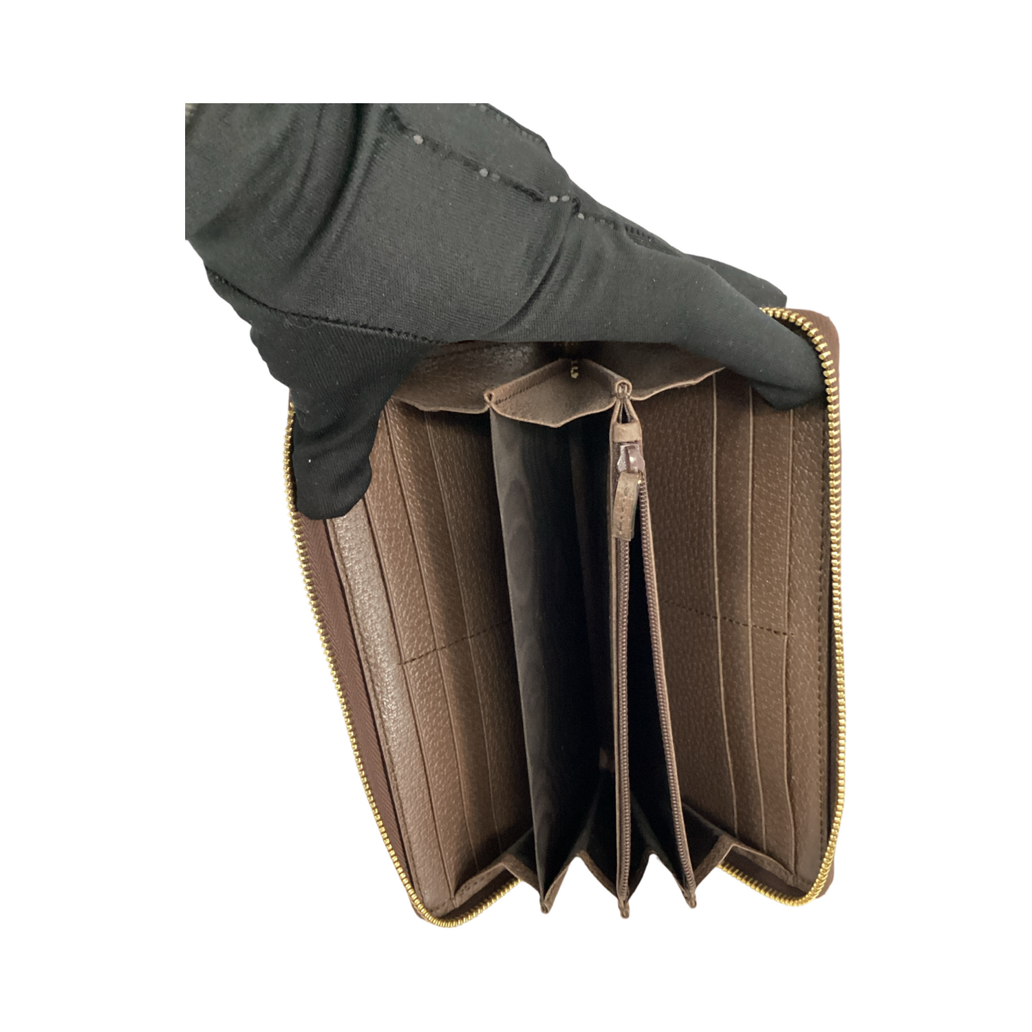 Gucci-GG Supreme Ophidia Zip Around Wallet with gold-toned hardware, crafted of Gucci GG monogram coated canvas, a wrap-around gold-toned zipper. Interior features a brown leather and fabric interior with 12 card slots, 2 slip pockets and a zipper compartment.