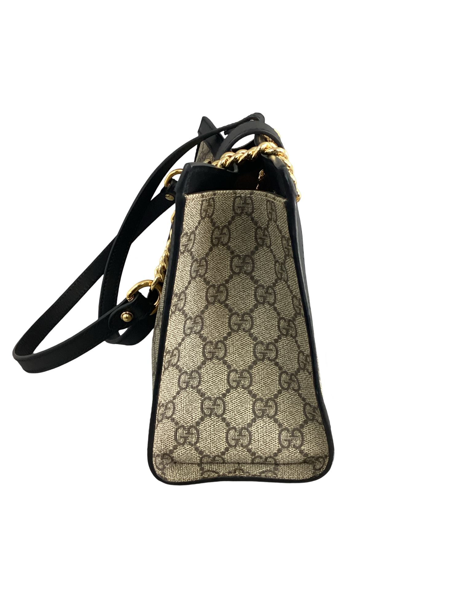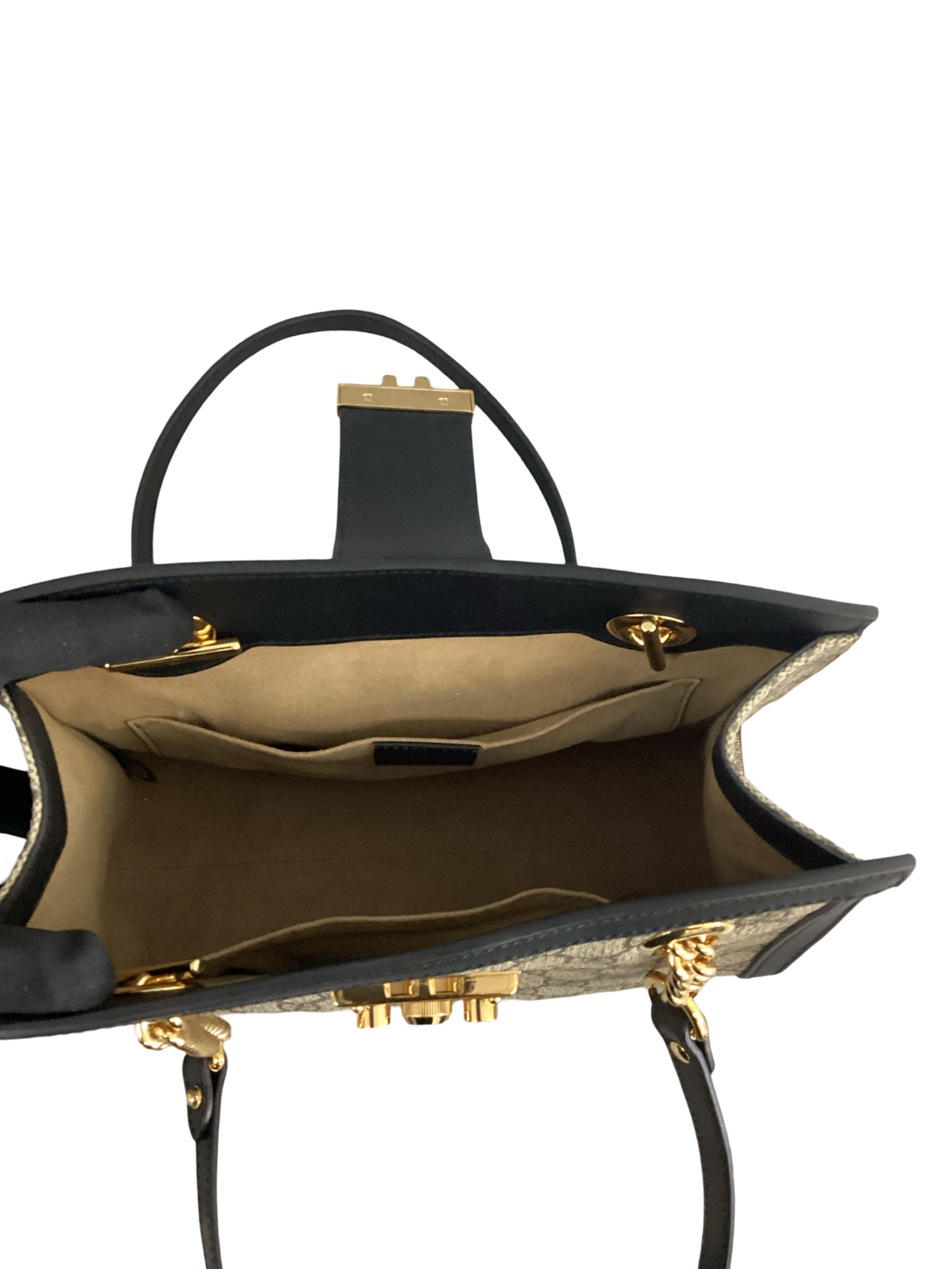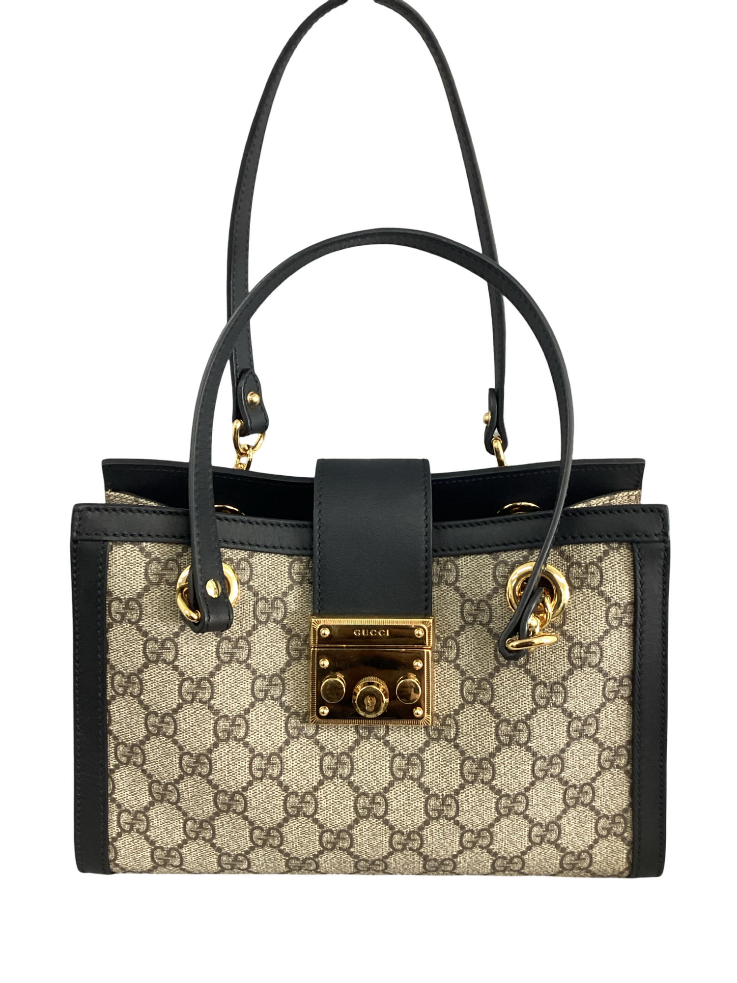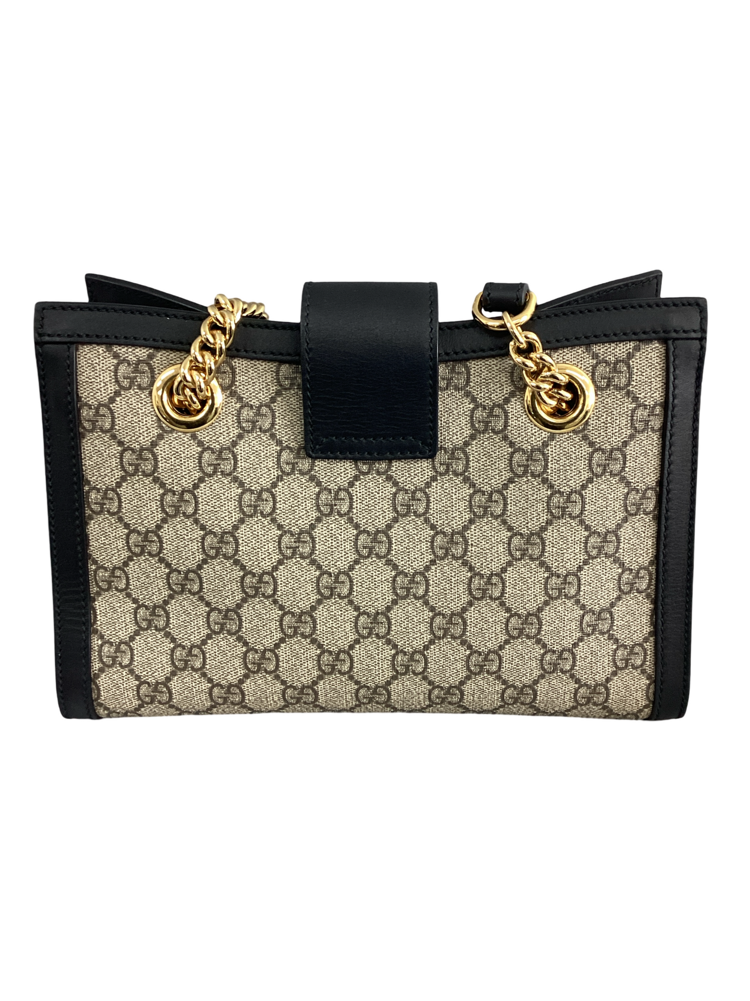 Gucci GG Supreme Small Padlock Shoulder Bag with gold-toned hardware, beige and ebony GG Supreme canvas and completed with black leather details, Double chain shoulder straps with 24.5cm drop and lock closure. Interior features microfiber lining with a suede-like finish and 2 slip pockets