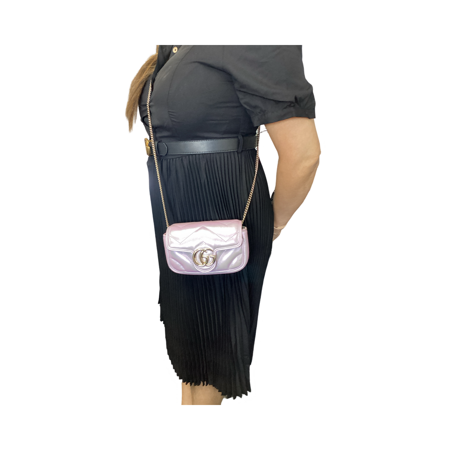 Gucci-Iridescent GG Marmont Mini with gold-toned hardware, crafted of smooth and supple iridescent pink calfskin leather, an optional gold chain shoulder strap and crossover flap has a gold GG logo and push lock snap clock closure. Interior features a pink satin interior with a removable key chain.