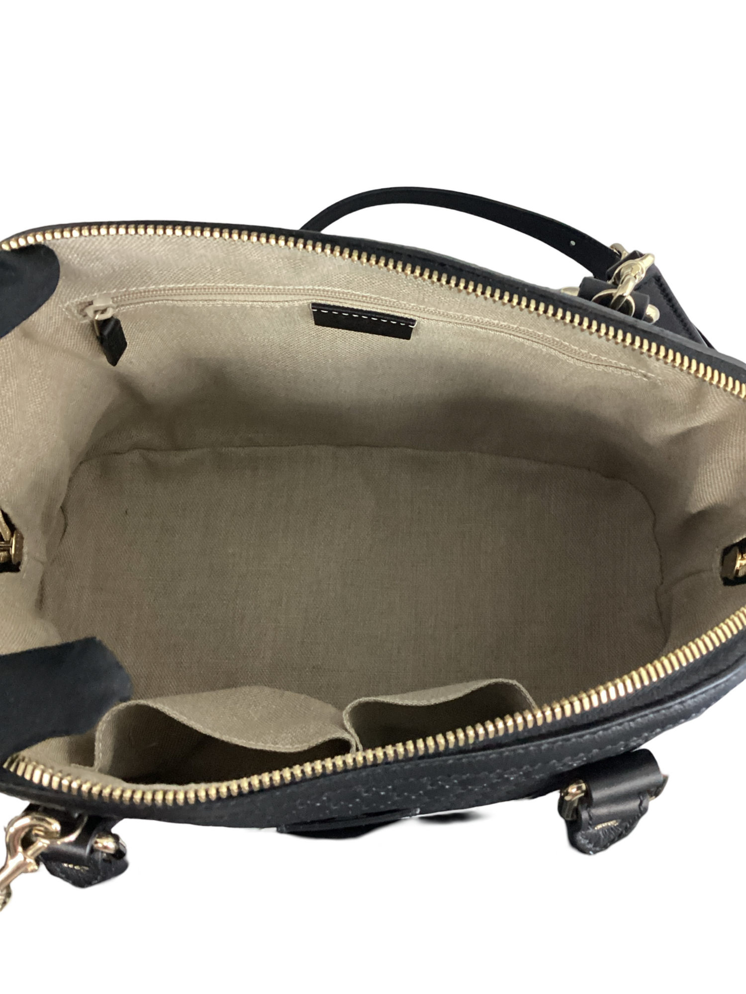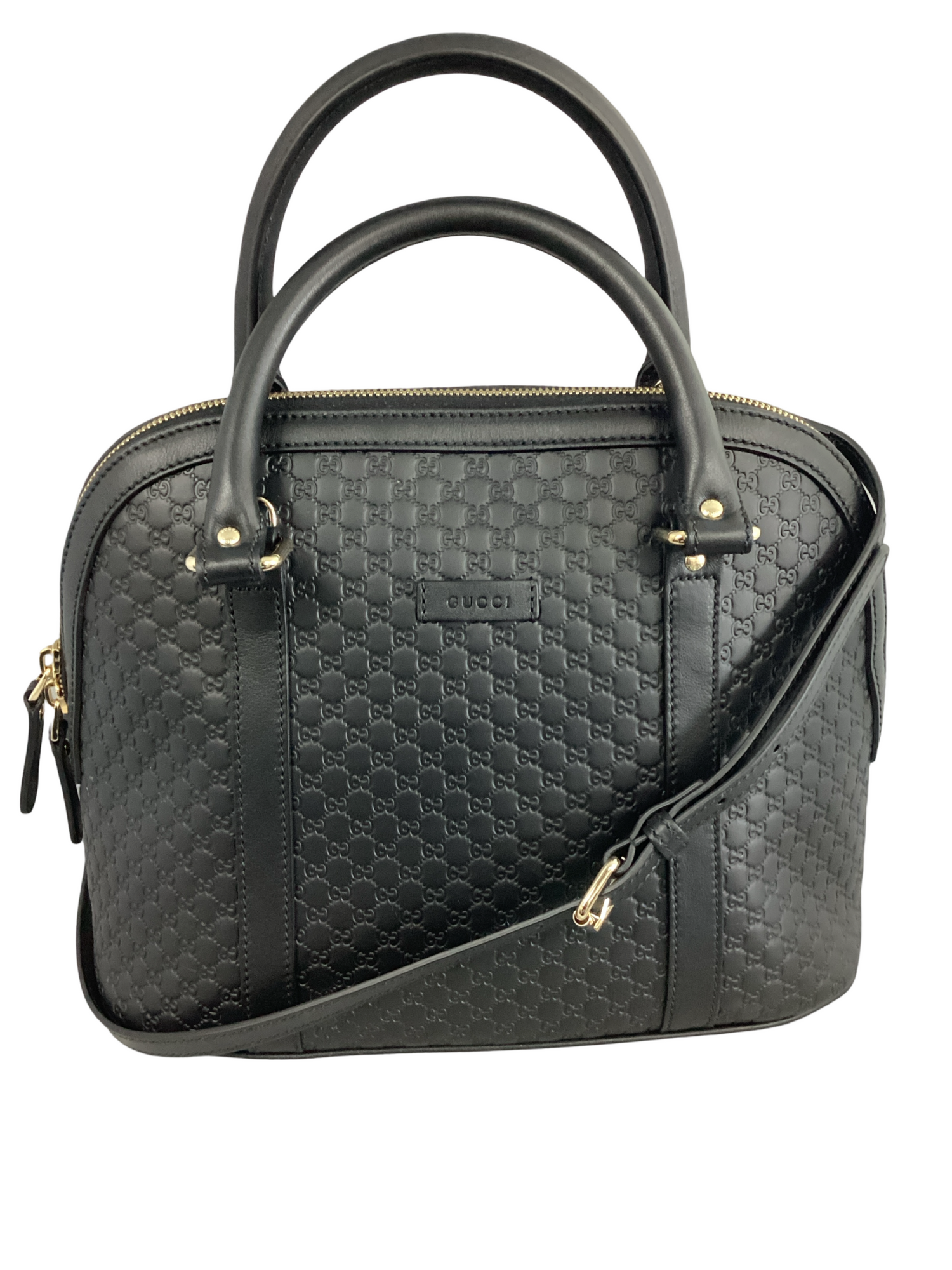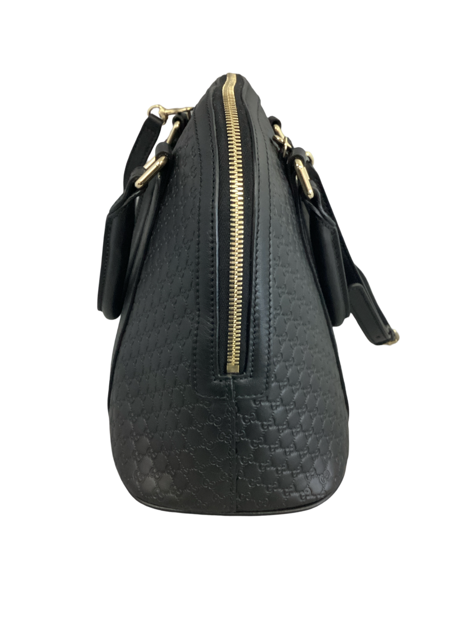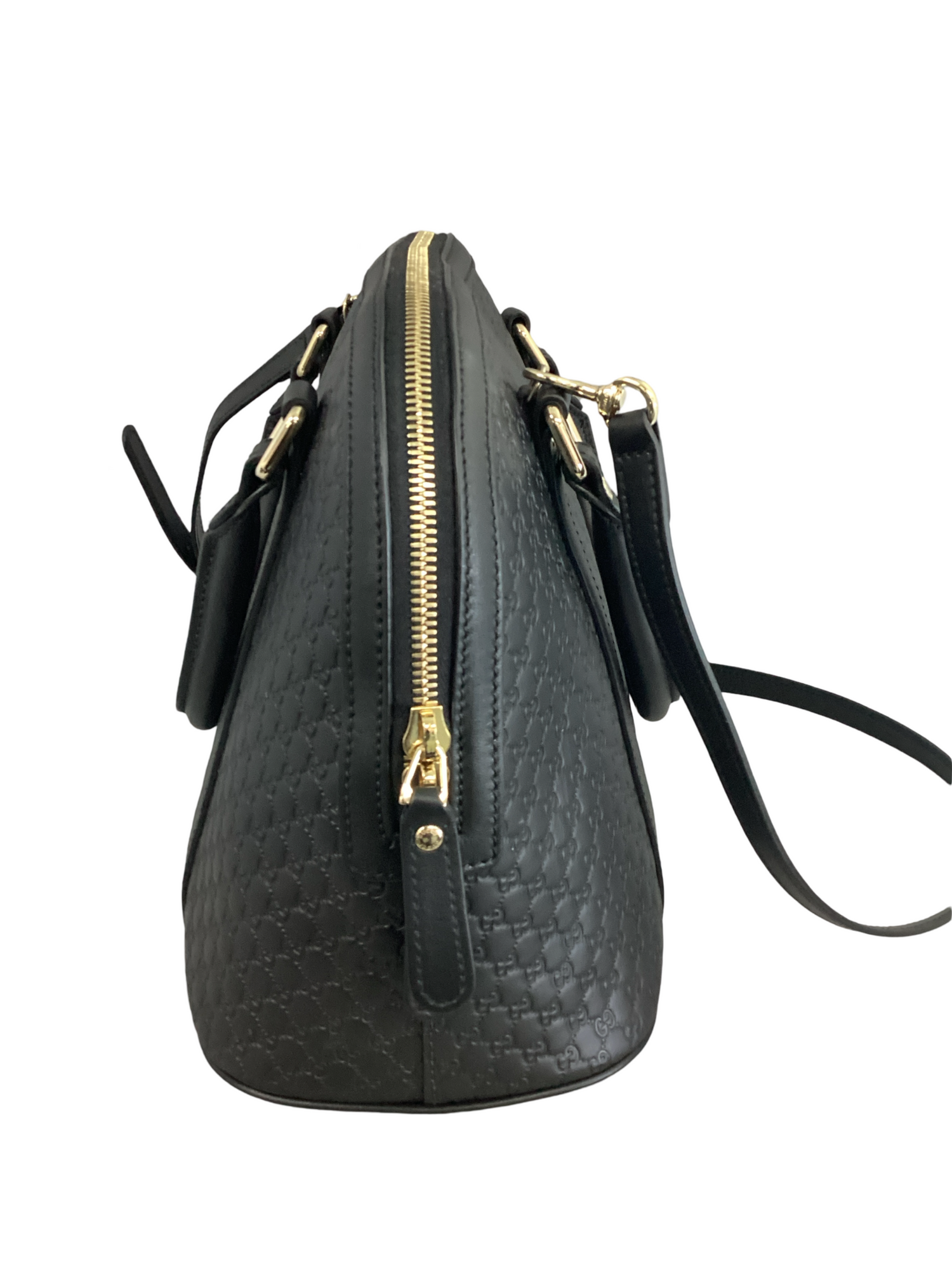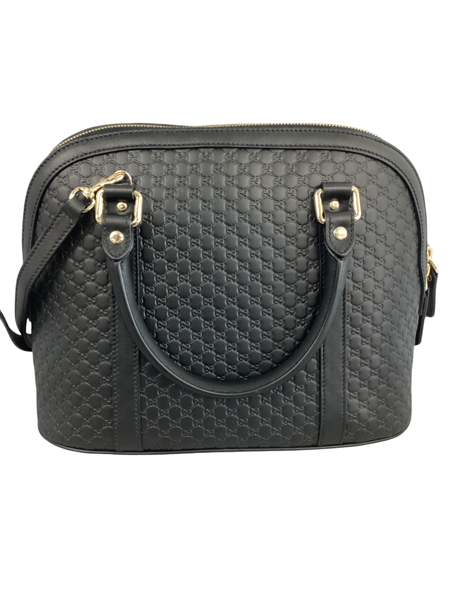 Gucci Medium Microguccissima Dome Bag with gold-toned hardware, embossed microguccissima leather in black, leather top handles, an optional adjustable shoulder strap and top zipper closure. Interior features a beige fabric interior with pockets.