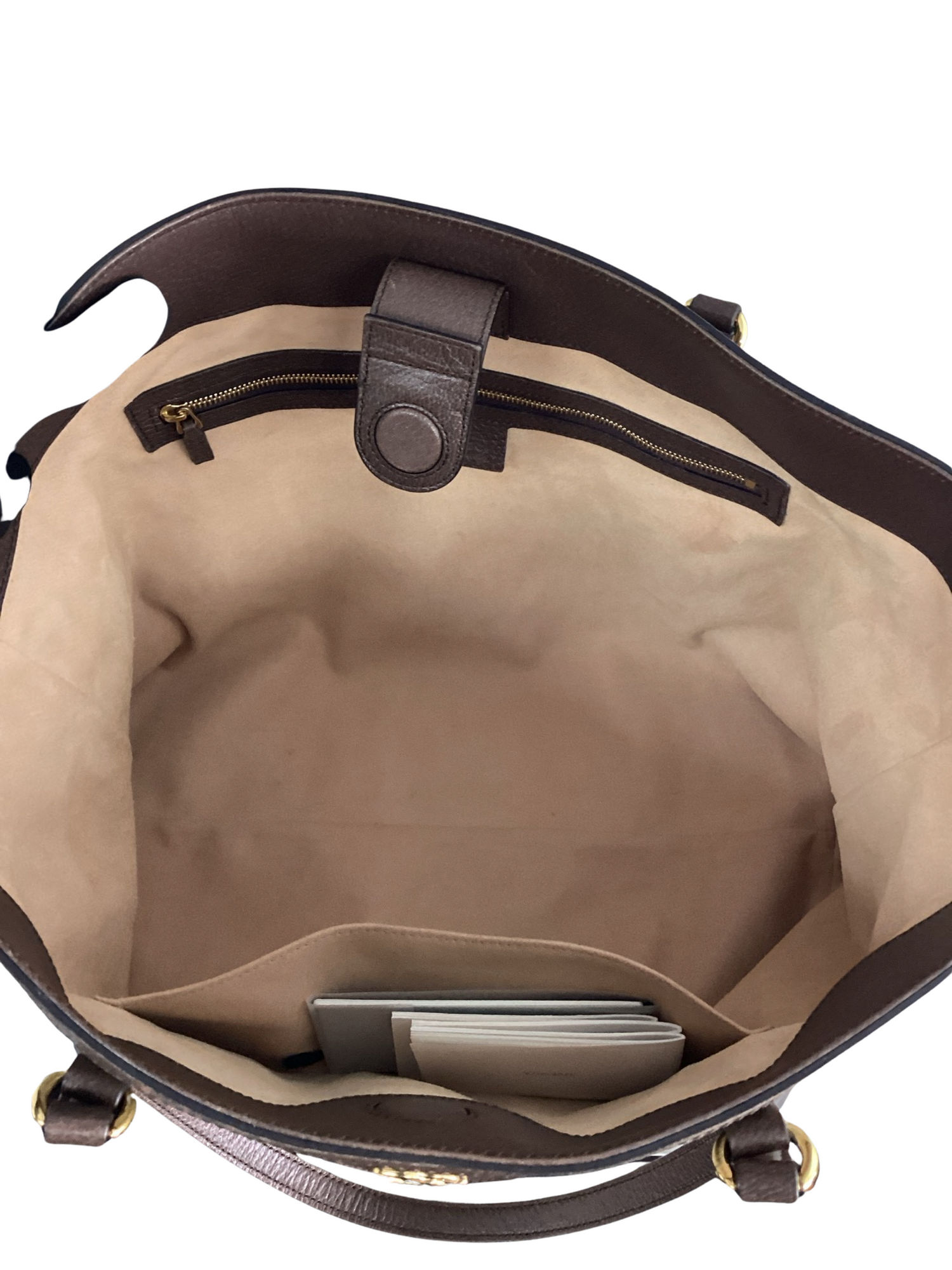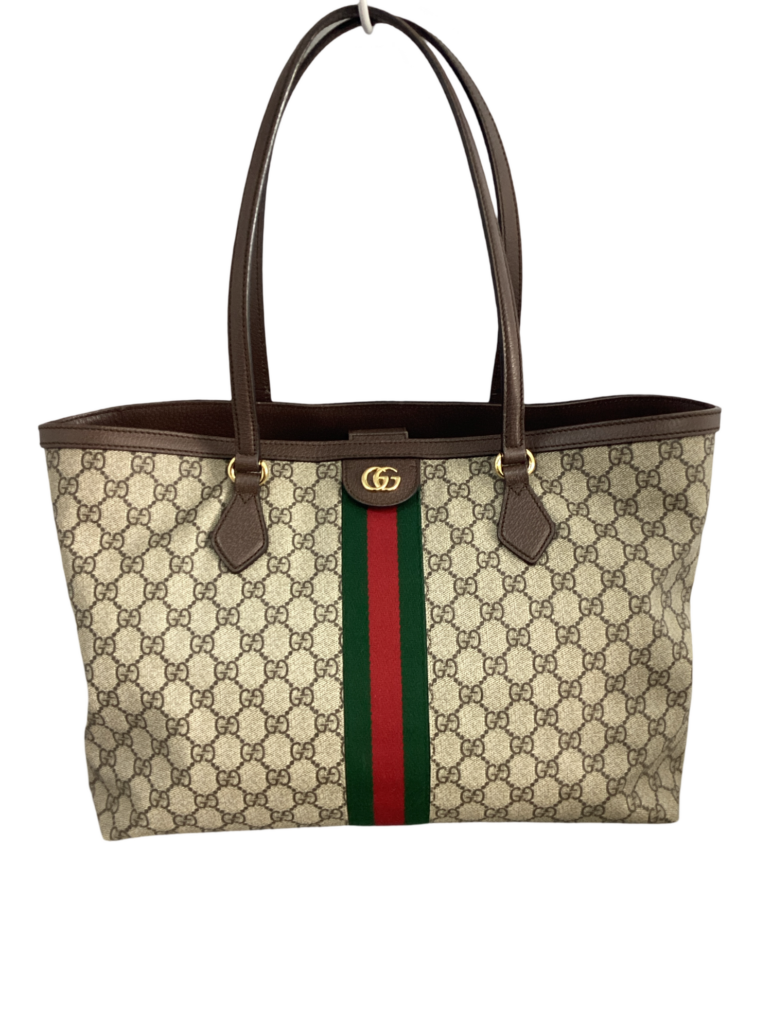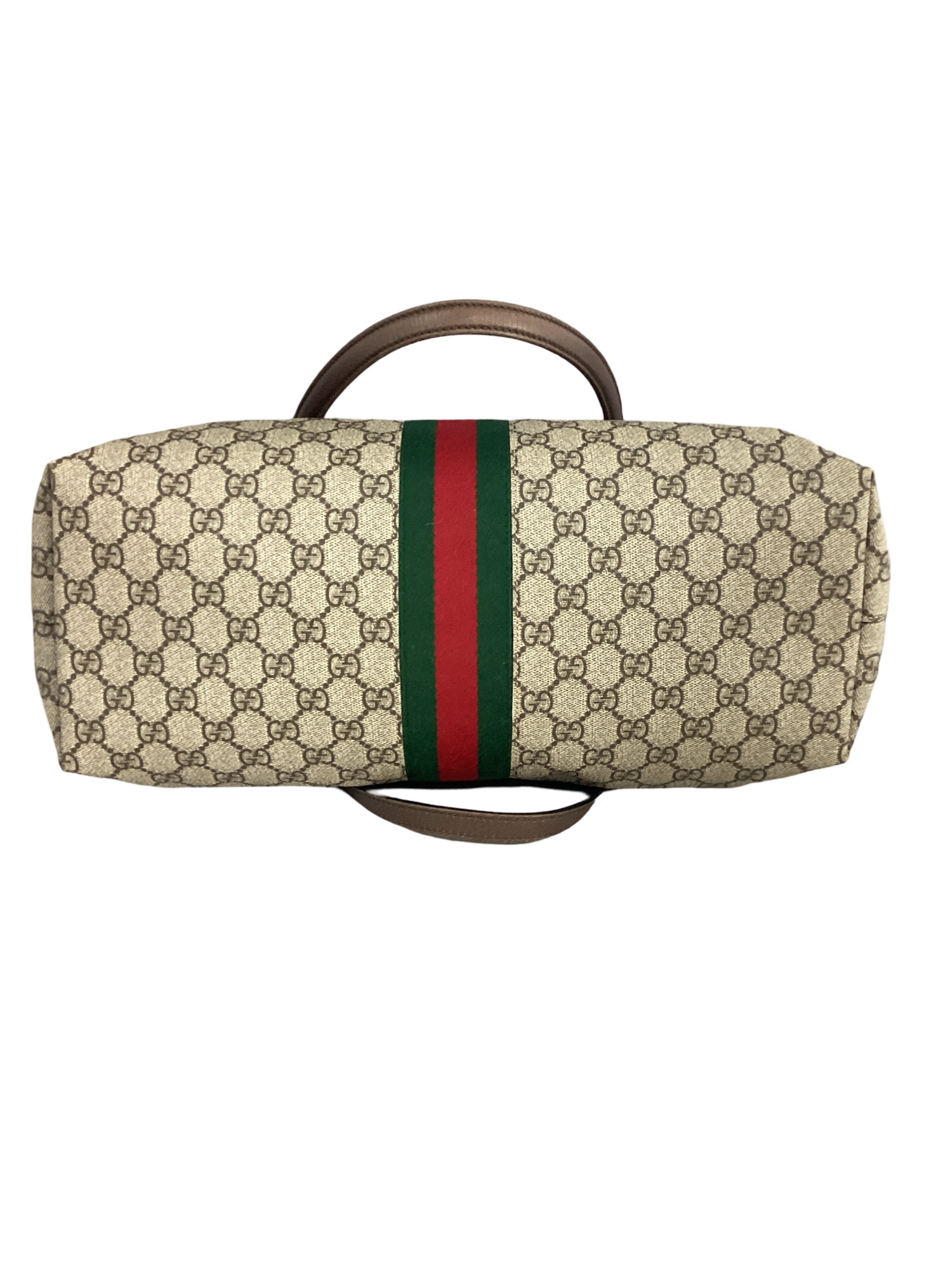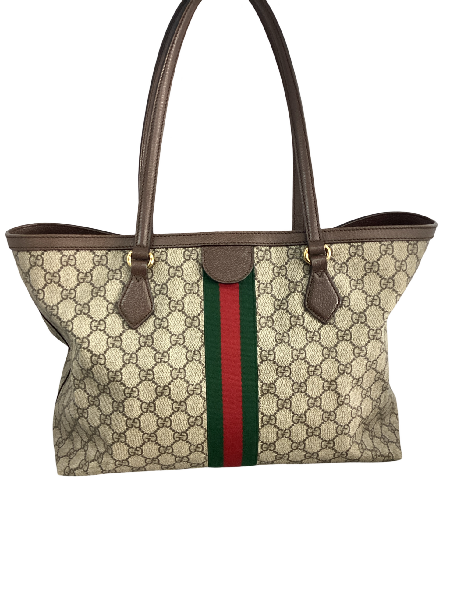 Gucci Medium GG Supreme Ophidia Tote in Beige, Ebony and New Acero with gold-toned hardware, crafted of Gucci GG supreme monogram coated canvas with a green and red web stripe detail, brown leather strap handles and a magnetic top snap closure. Interior features a microfiber interior with zipper and patch pockets.