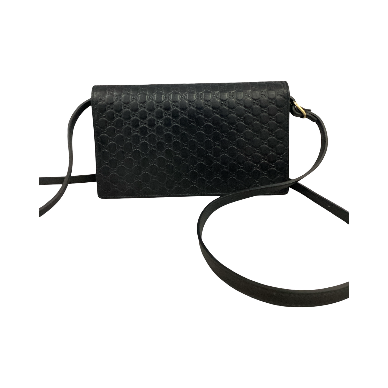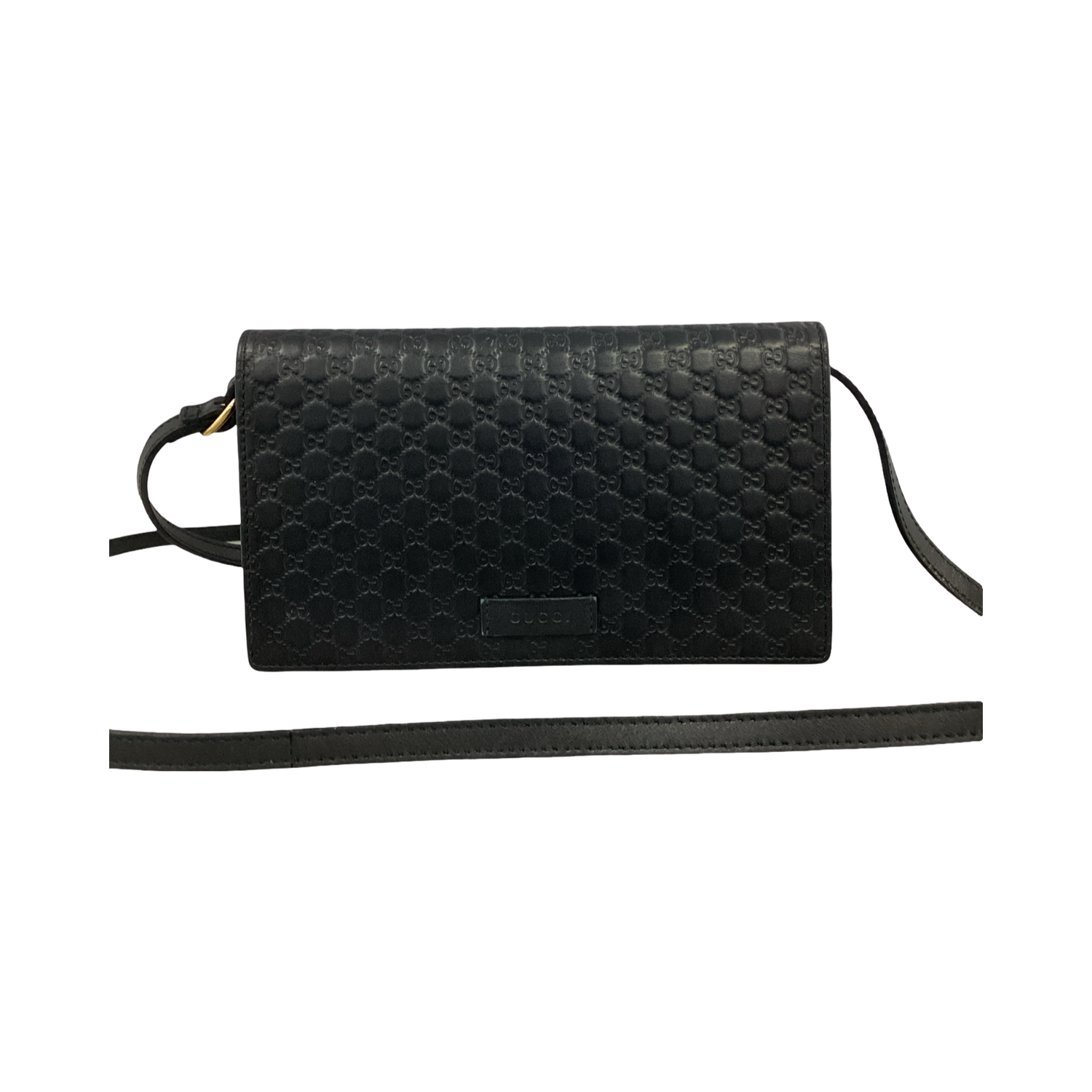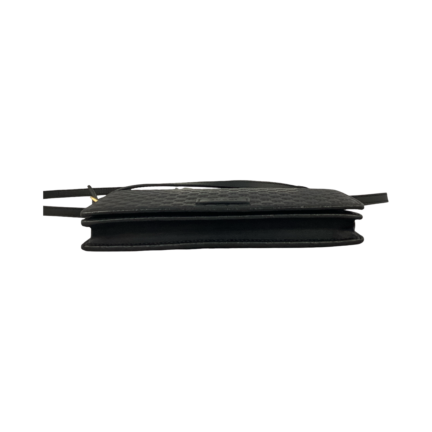 Gucci Microgucissima Crossbody Bag with gold-toned hardware, a chic and compact wallet is superbly crafted of Guccissima calfskin leather in black, a removable shoulder strap and a flap snap button closure. Interior features a black leather interior with billfolds, 8 credit card slots, and a zipper compartment.