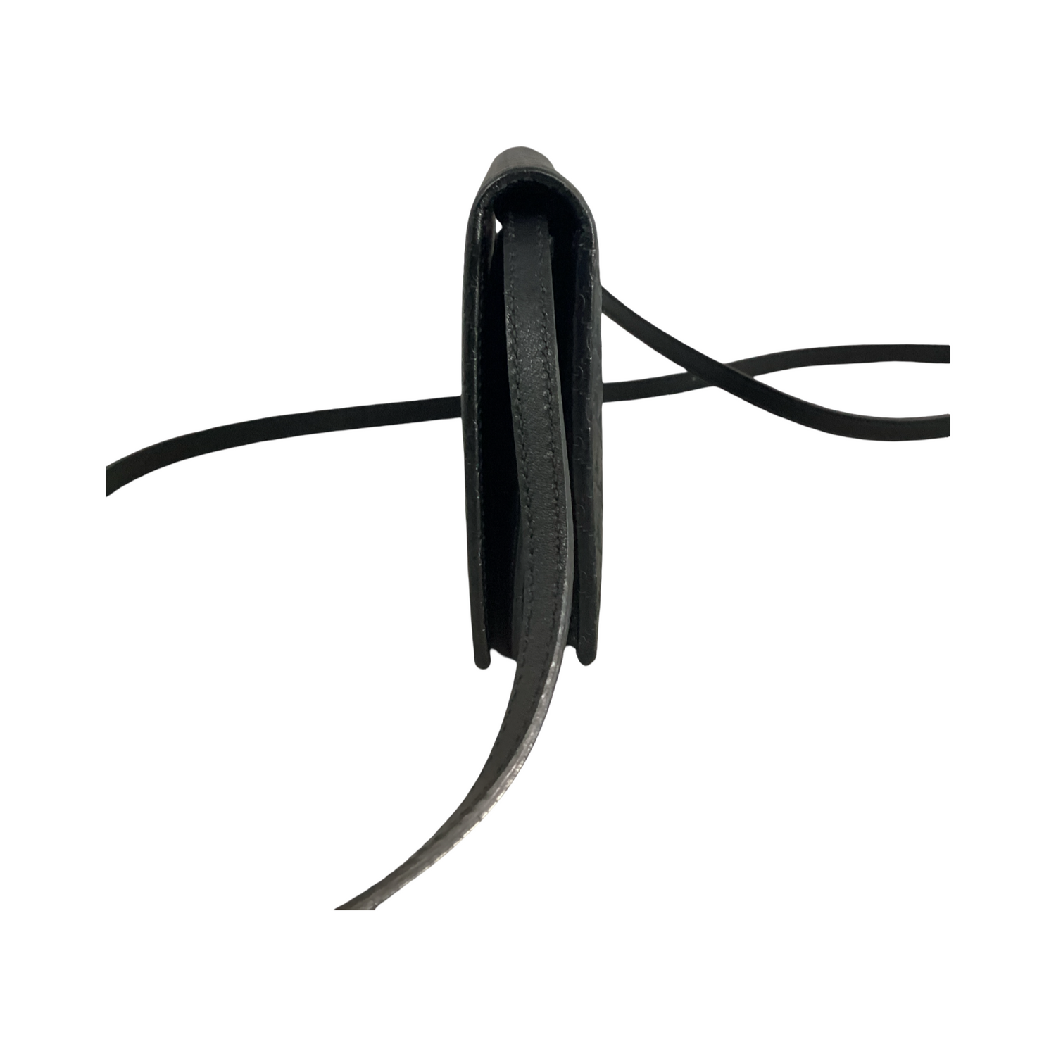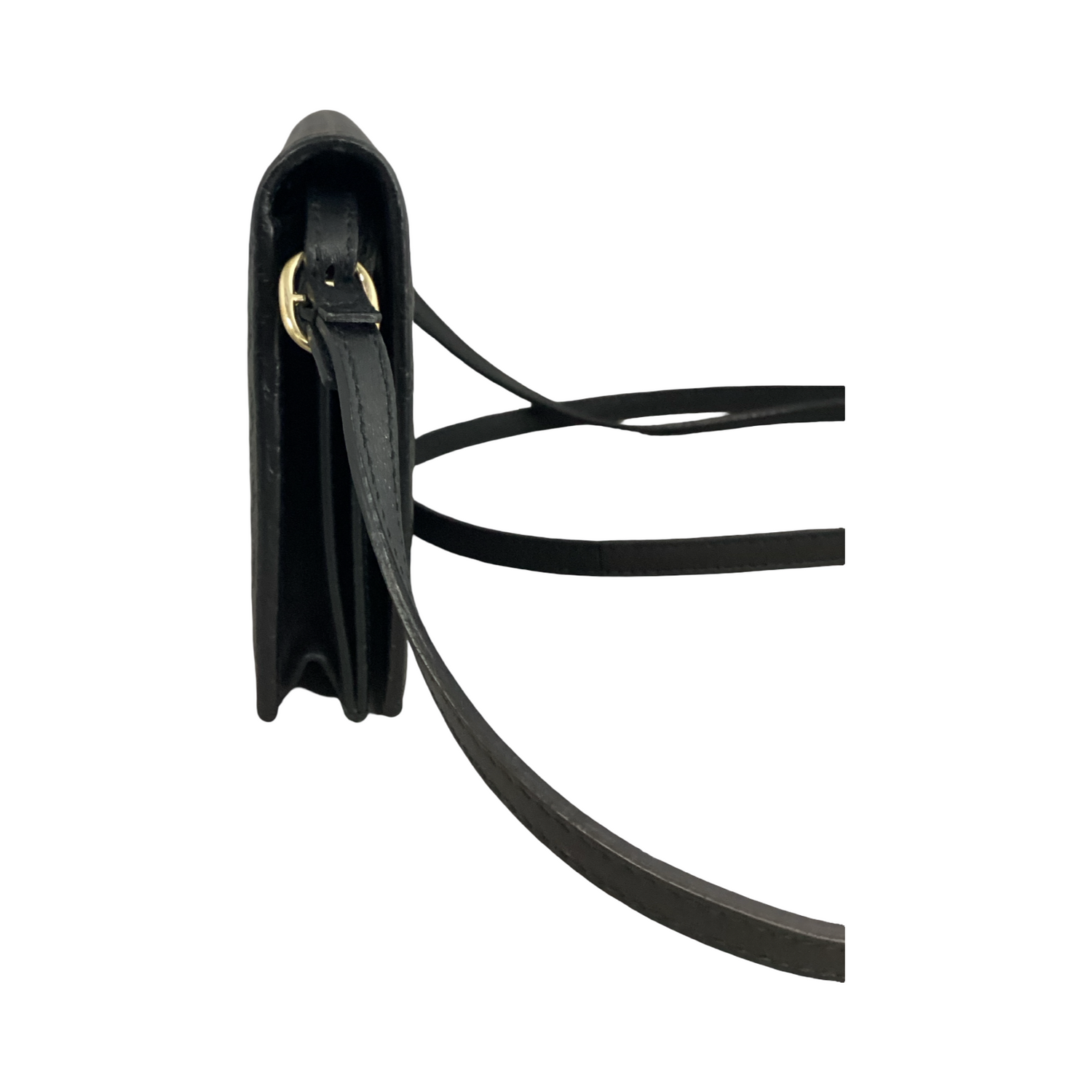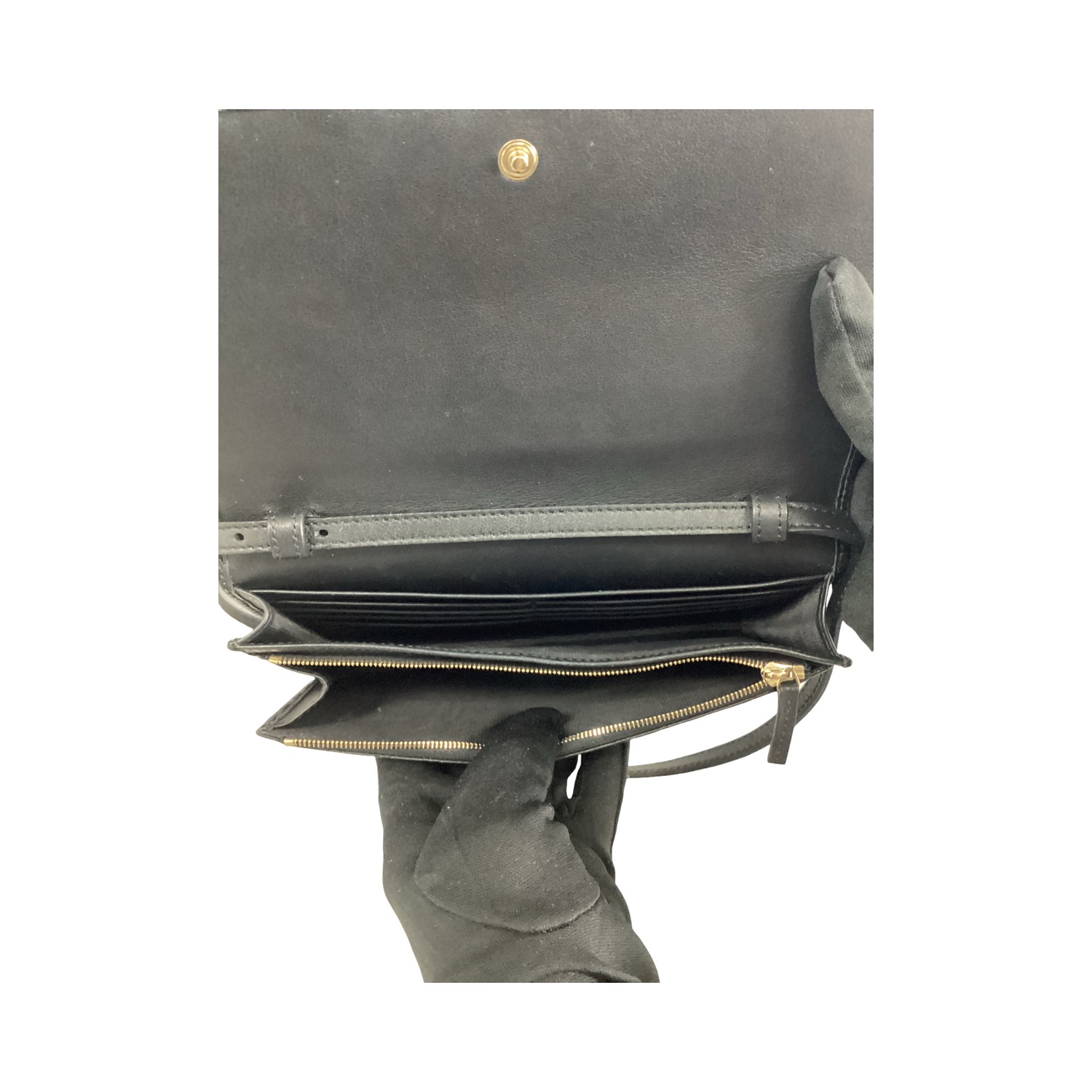 Gucci Microgucissima Crossbody Bag with gold-toned hardware, a chic and compact wallet is superbly crafted of Guccissima calfskin leather in black, a removable shoulder strap and a flap snap button closure. Interior features a black leather interior with billfolds, 8 credit card slots, and a zipper compartment.