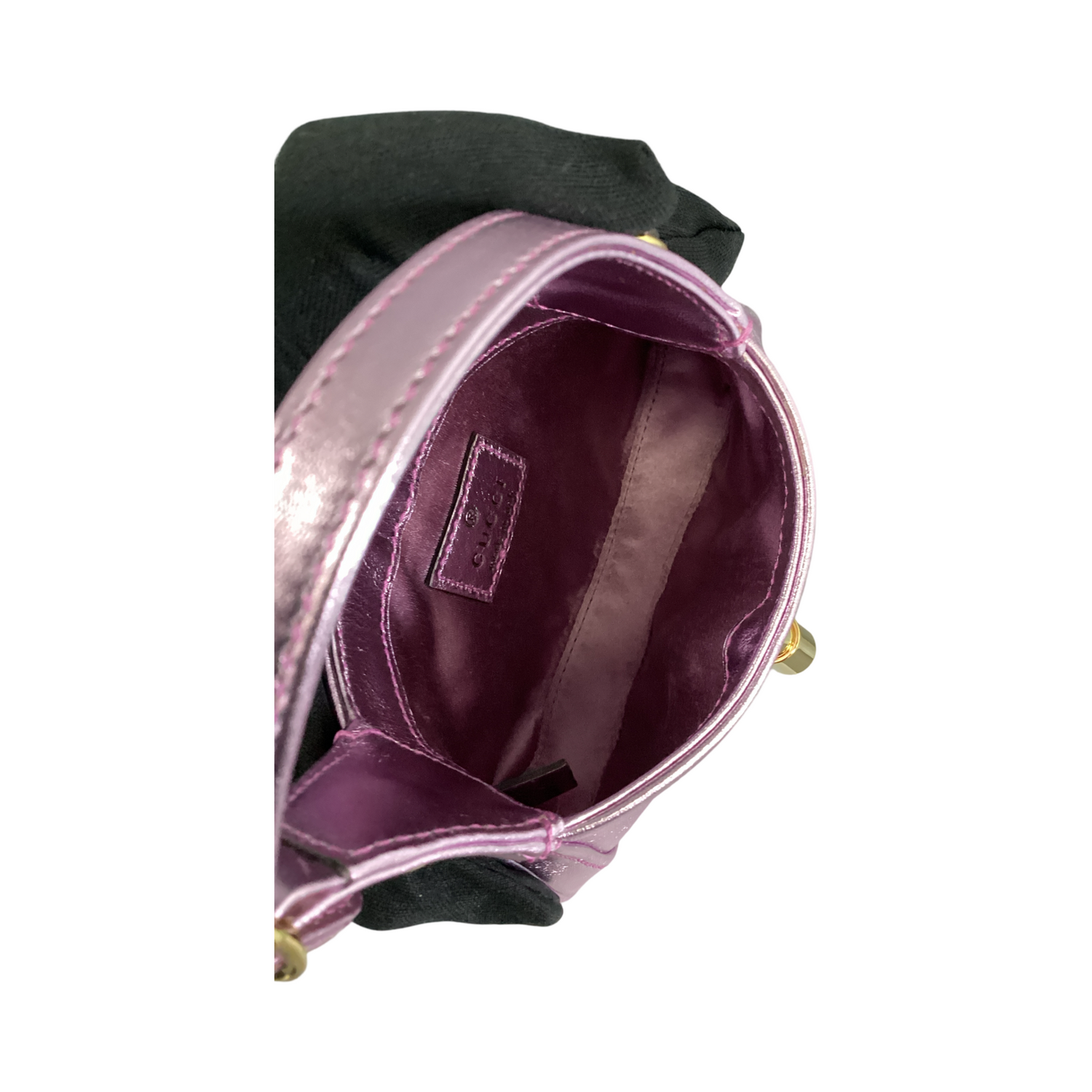 Gucci-Mini Jackie 1961 Metallic Pink with gold-toned hardware, a mini classic hobo is finely crafted of metallic pink leather. The bag features a stylish looping leather top handle and an optional detachable gold-toned chain strap, and a polished gold piston lock. Interior features a pink fabric interior with a leather patch pockets.