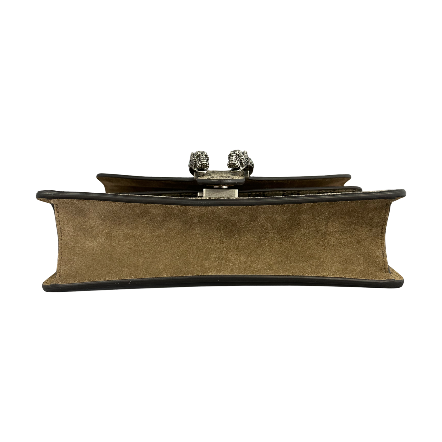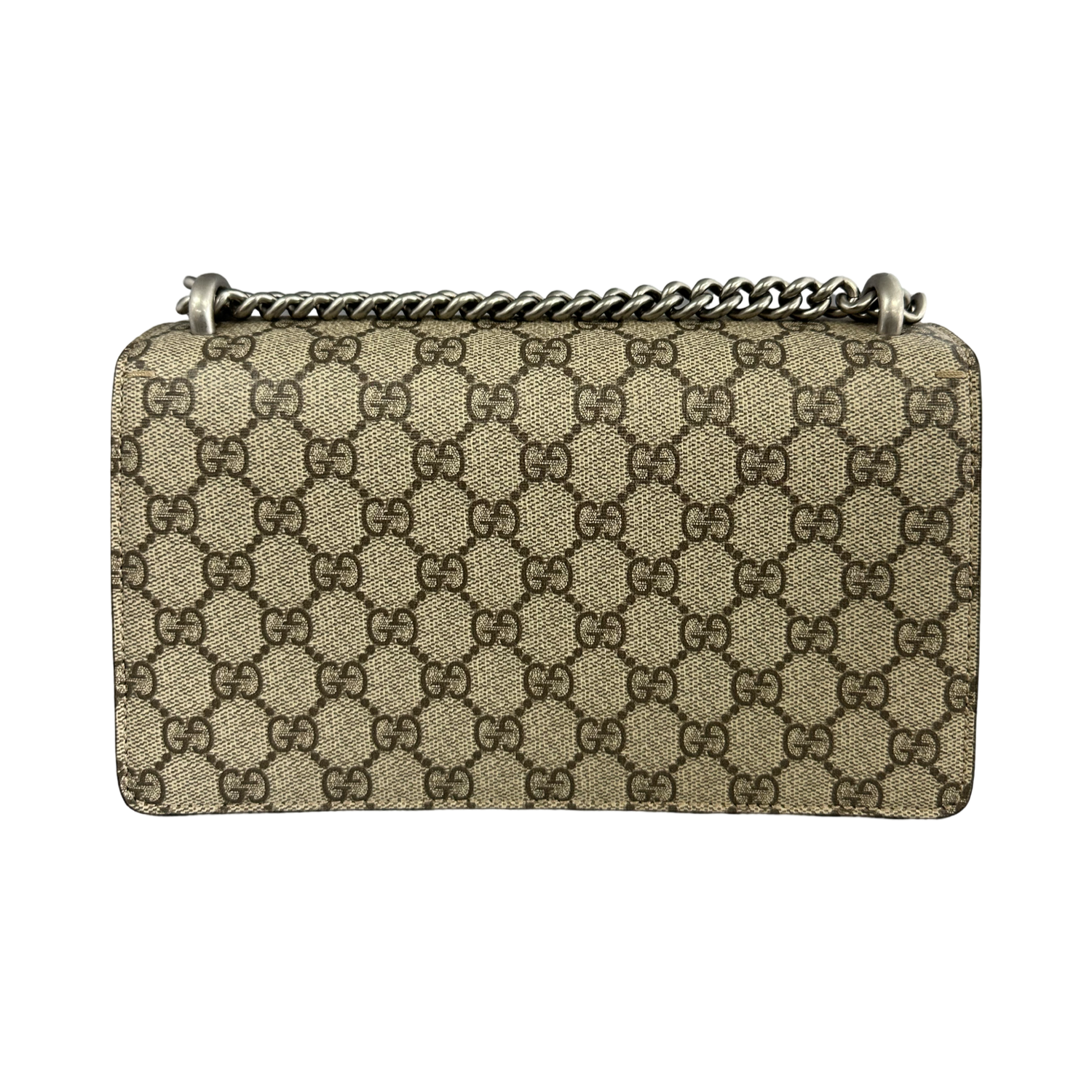 Gucci-Monogram Dionysus Small Shoulder Bag with silver-toned hardware, crafted of Gucci GG monogram canvas in taupe brown, an aged silver-toned chain shoulder strap and a textured press lock horseshoe closure with crystals tiger heads at the end. Interior features a suede flap front pocket and taupe suede lining and coated canvas zipper compartment.